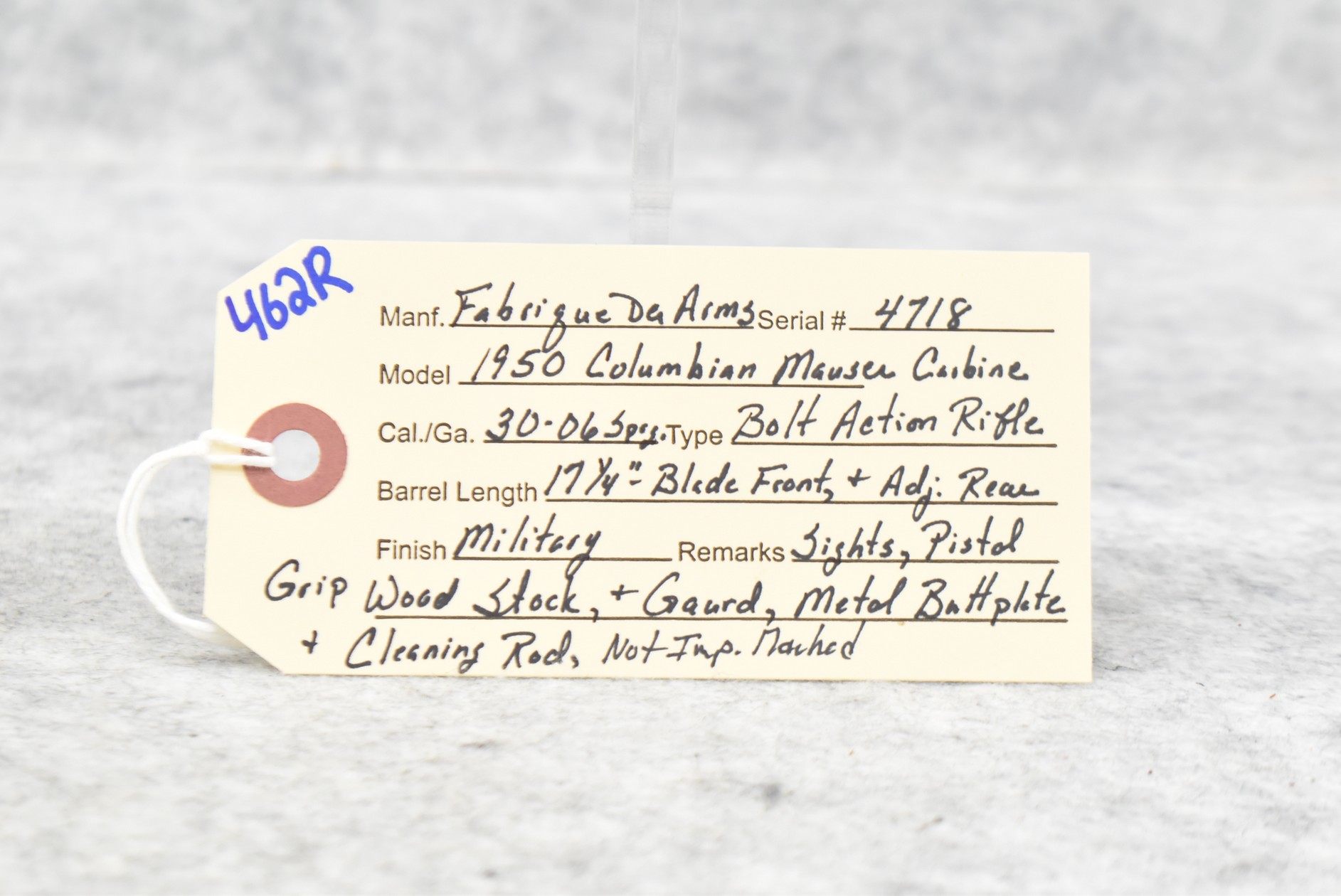 462R. Fabrique De Arms – Mod. 1950 Columbian Mauser Carbine – 30-06 Sprg. Cal. Bolt Action Rifle – w/17 ¼” Barrel w/Blade Front & Adj. Rear Sights – Military Finish – w/Pistol Grip Wood Stocks w/Metal Butt Plate – w/Cleaning Rod – Not Import Marked