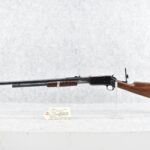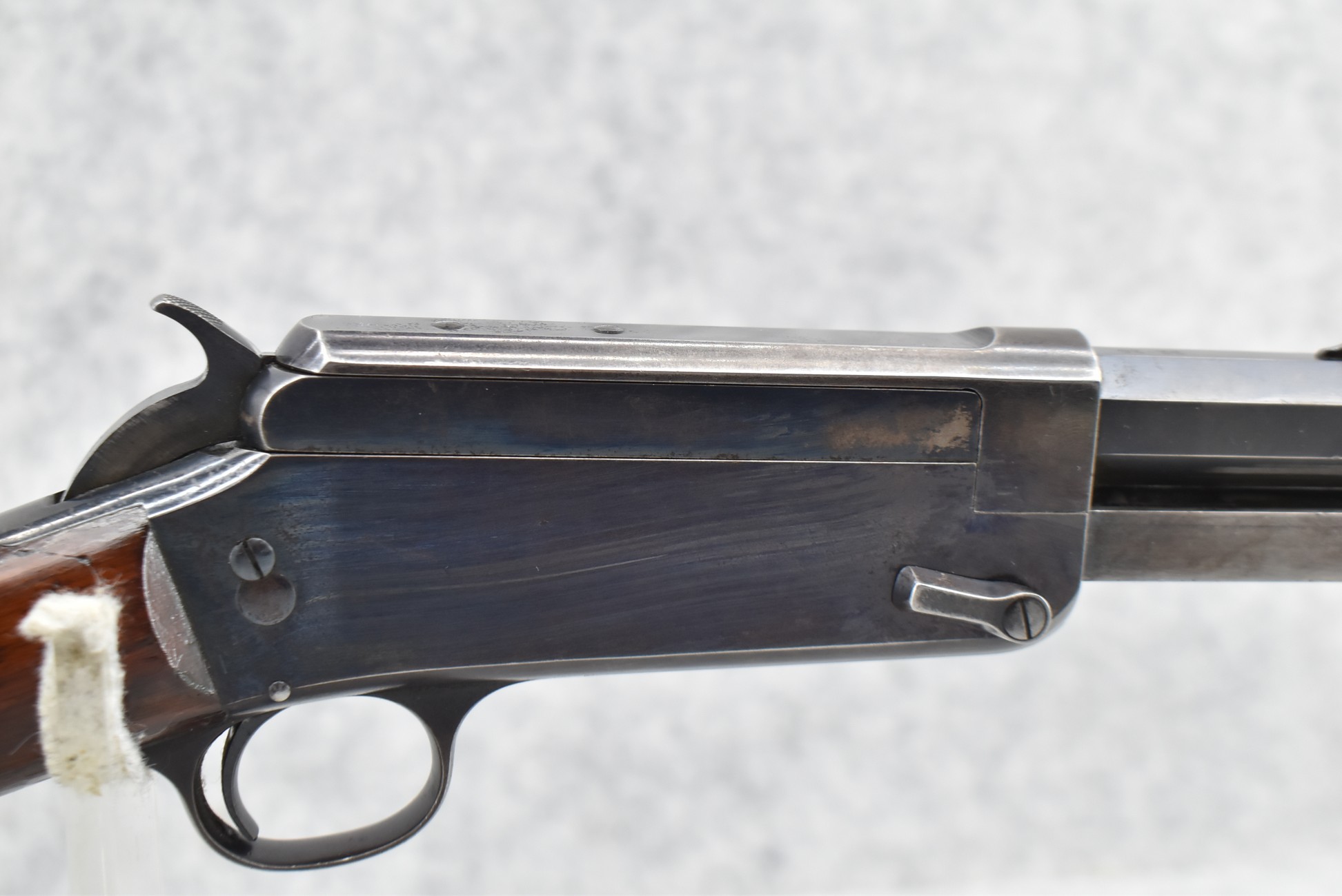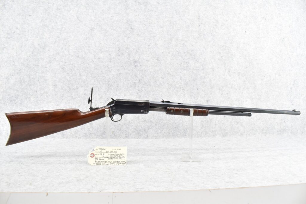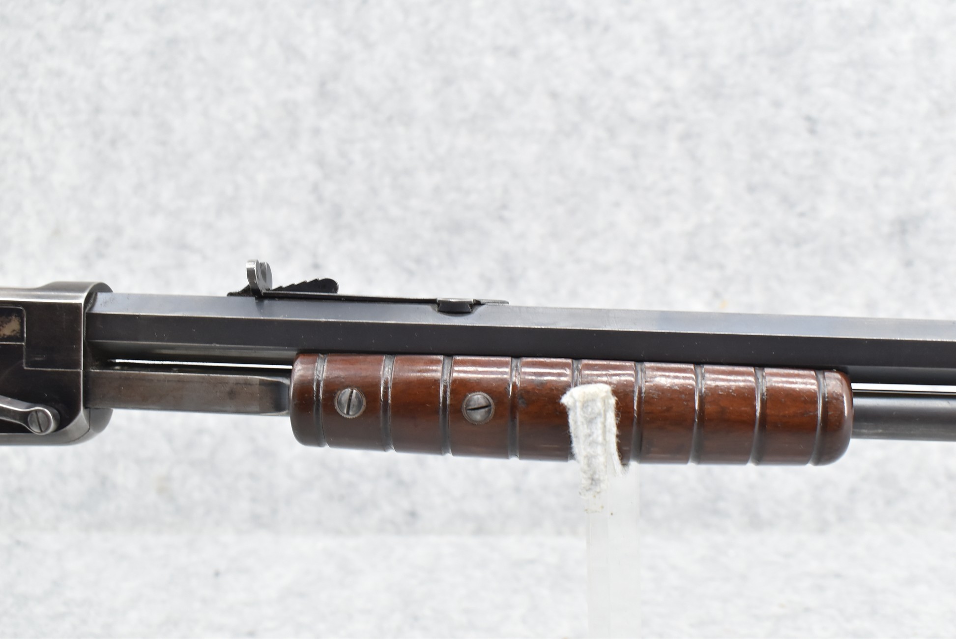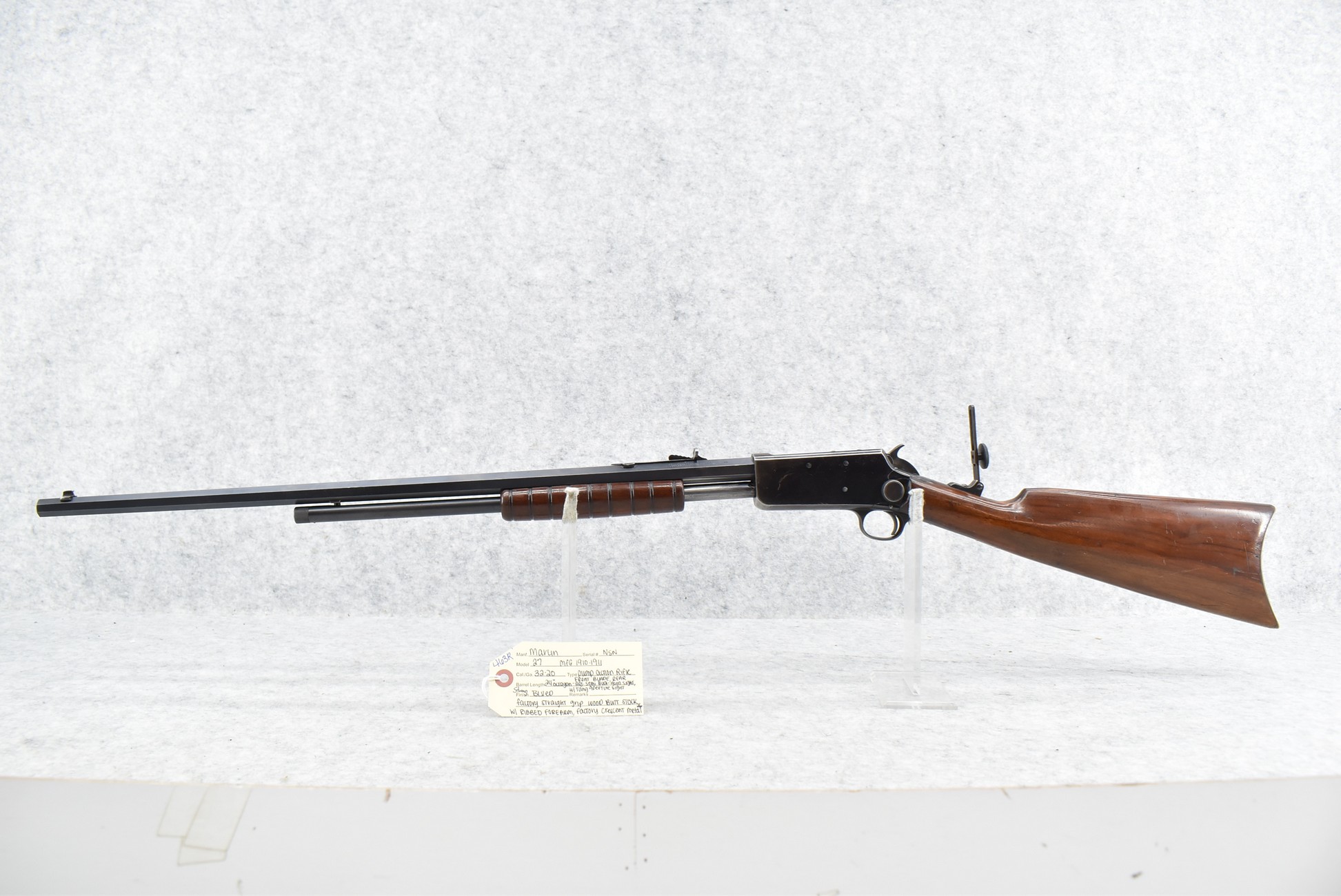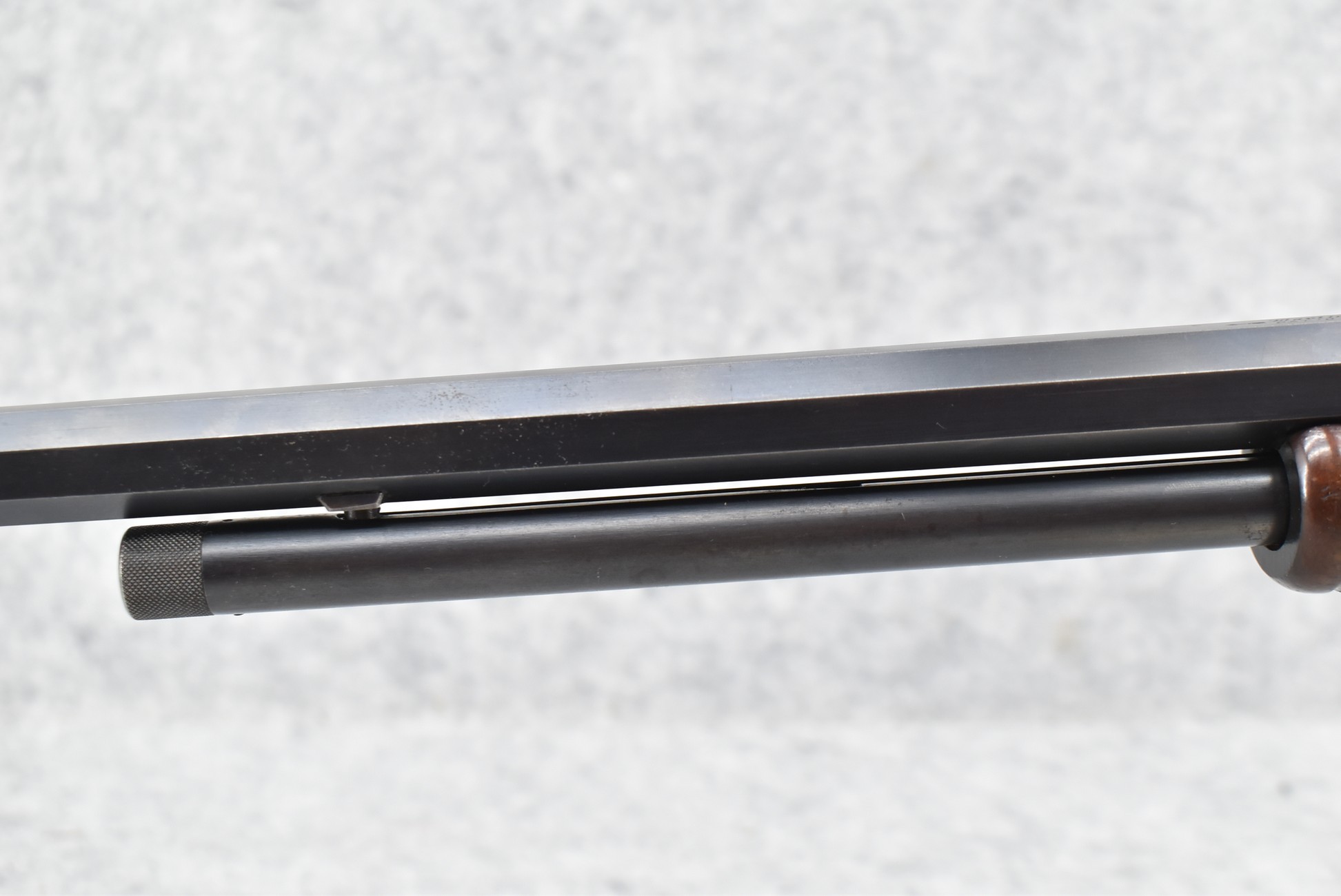 463R. Marlin – Mod. 27 – 32-20- Cal. Pump Action Rifle – w/24” Octagon Barrel w/Front Blade & Rear Adj. Semi-Buckhorn Sights w/Tang Veneer Peep Sight – Strong Blued Finish – w/Factory Straight Grip Wood Butt Stock & Ribbed Forearm w/Factory Crescent Metal Butt Plate – Mfg. Between 1910-1911 Only