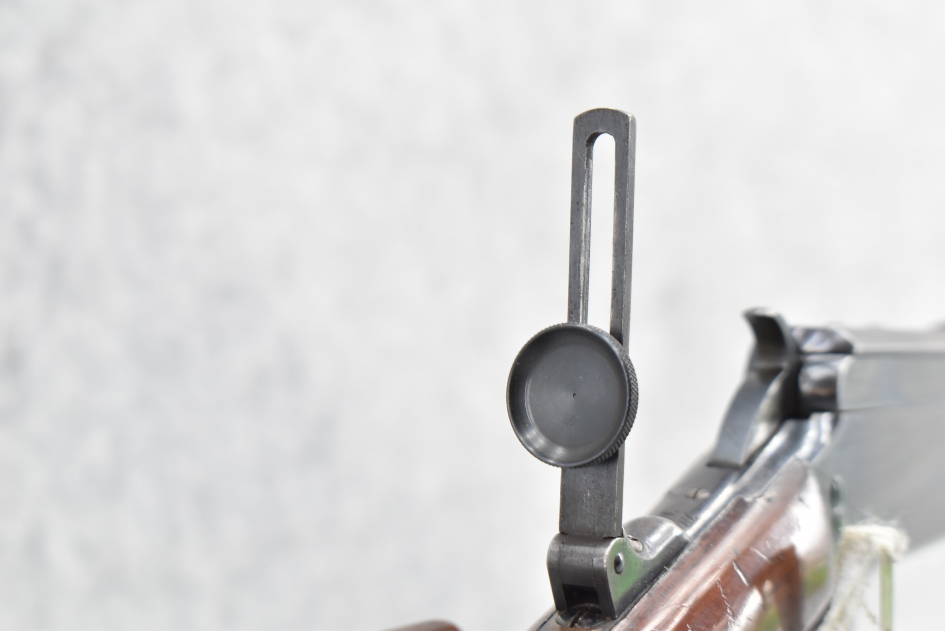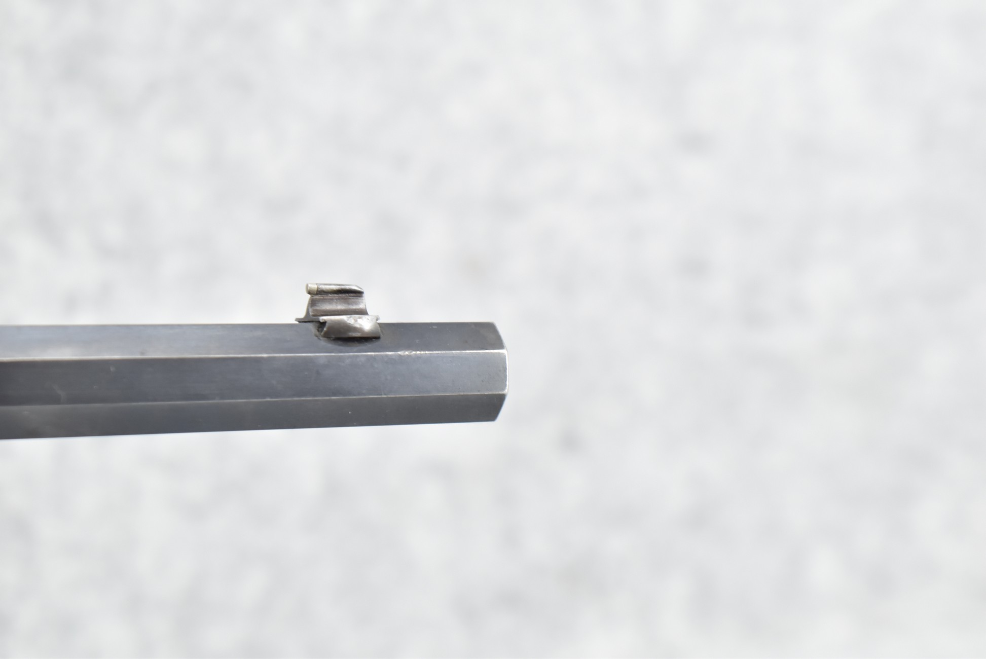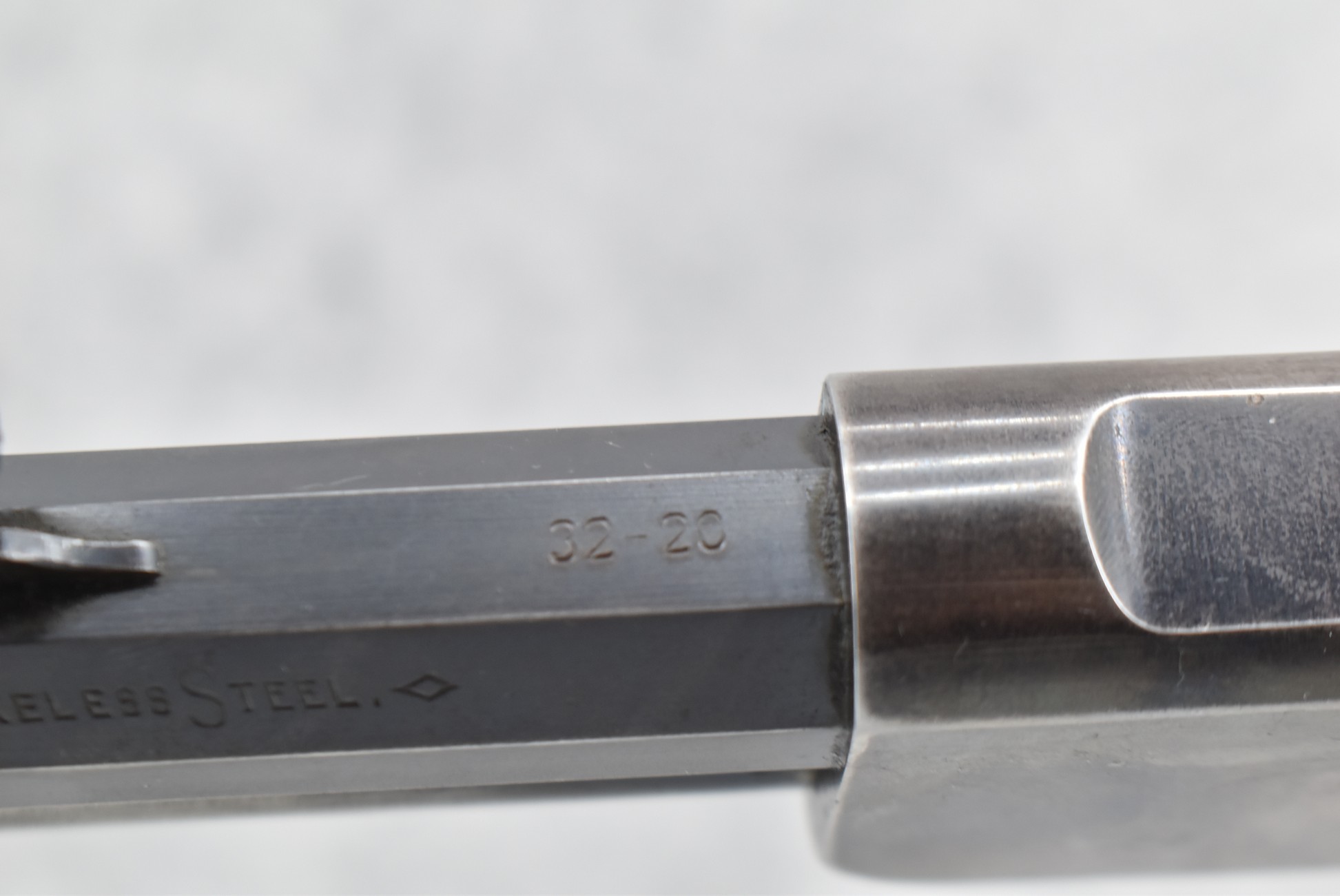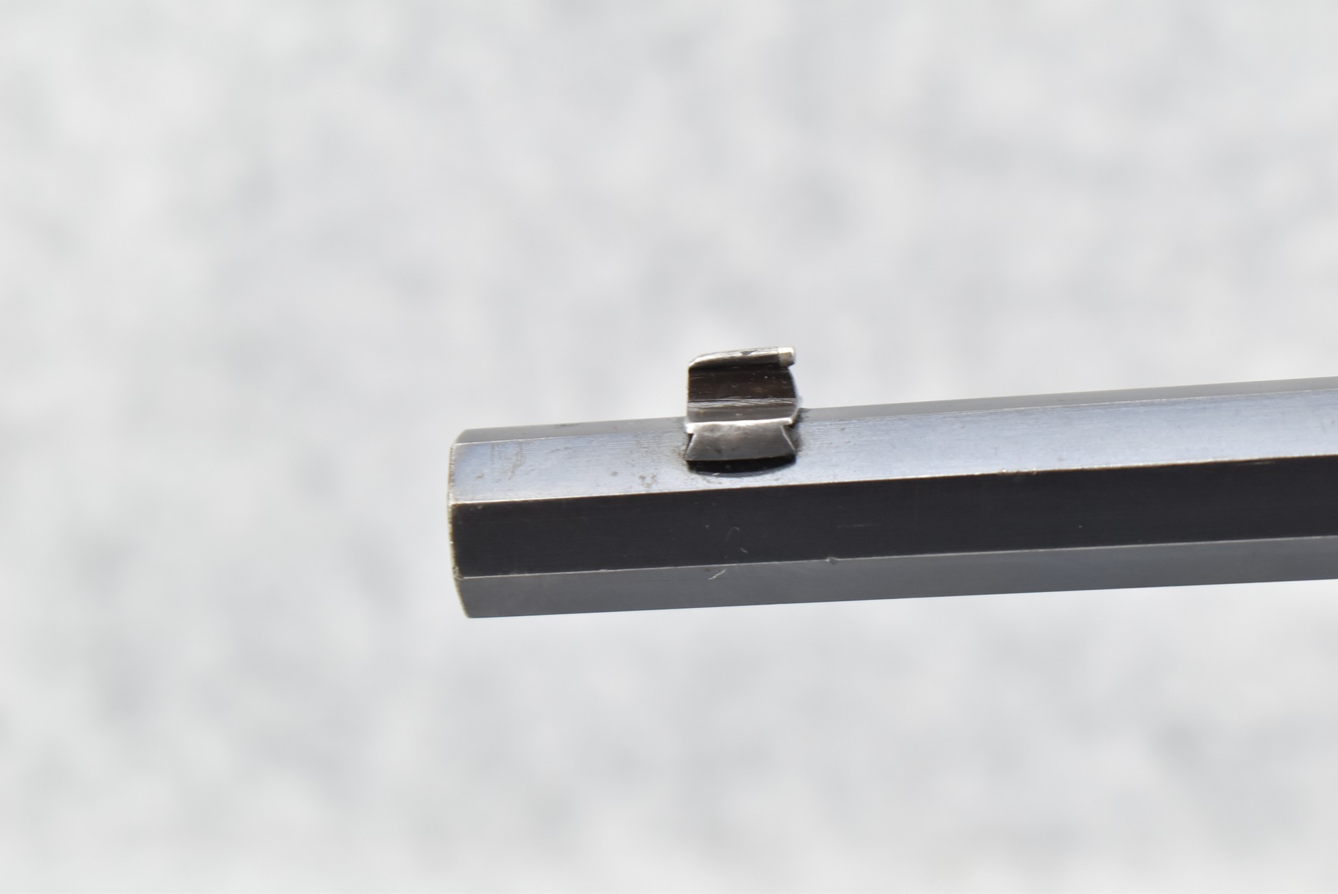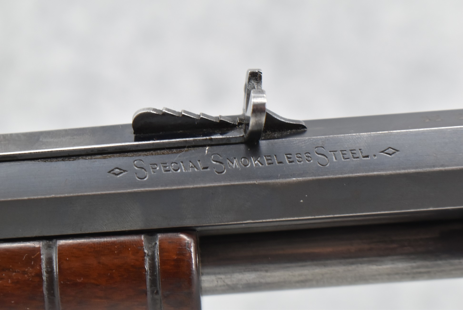 463R. Marlin – Mod. 27 – 32-20- Cal. Pump Action Rifle – w/24” Octagon Barrel w/Front Blade & Rear Adj. Semi-Buckhorn Sights w/Tang Veneer Peep Sight – Strong Blued Finish – w/Factory Straight Grip Wood Butt Stock & Ribbed Forearm w/Factory Crescent Metal Butt Plate – Mfg. Between 1910-1911 Only
