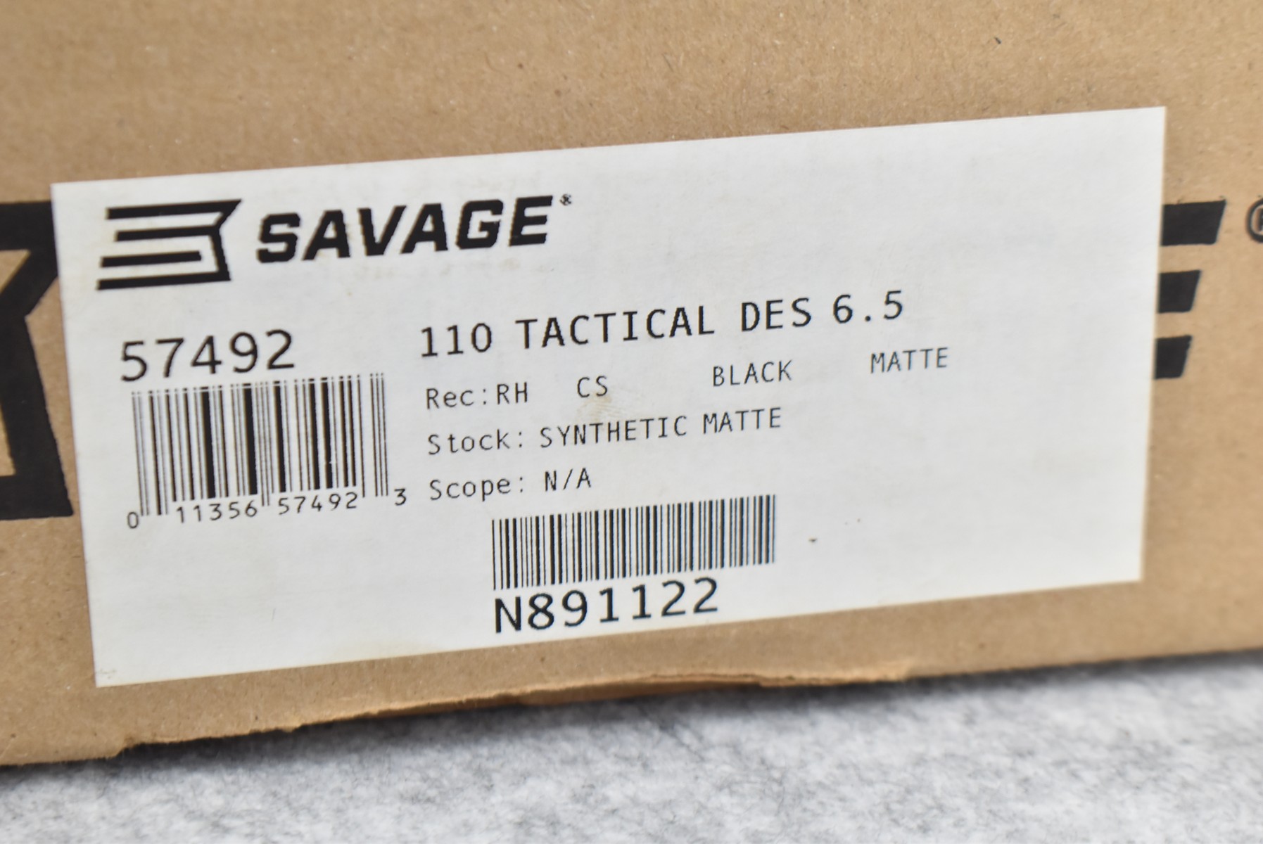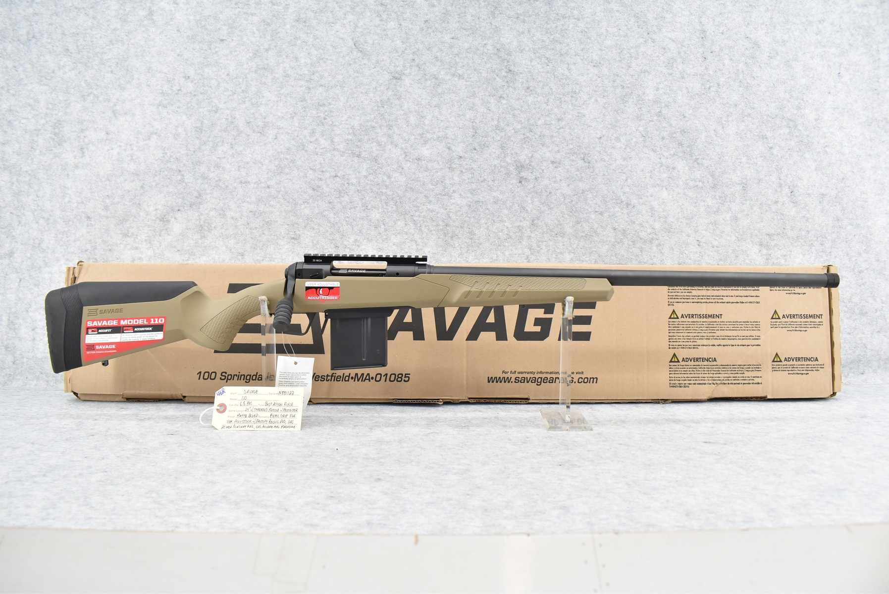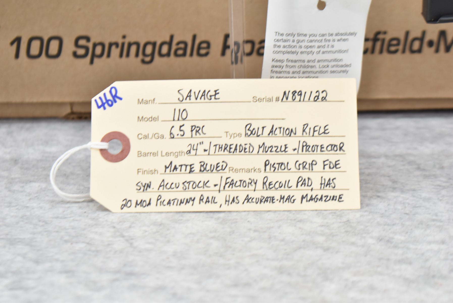 46R.       Savage – Mod. 110 Tactical – 6.5 PRC Cal. Bolt Action Rifle – w/24” Barrel w/Threaded Muzzle w/Protector and 20 MOA Picatinny Rail – Matte Blued Finish – w/Pistol Grip FDE Synthetic Accu Stock w/Factory Recoil Pad – w/Magazine – Unfired w/Factory Box