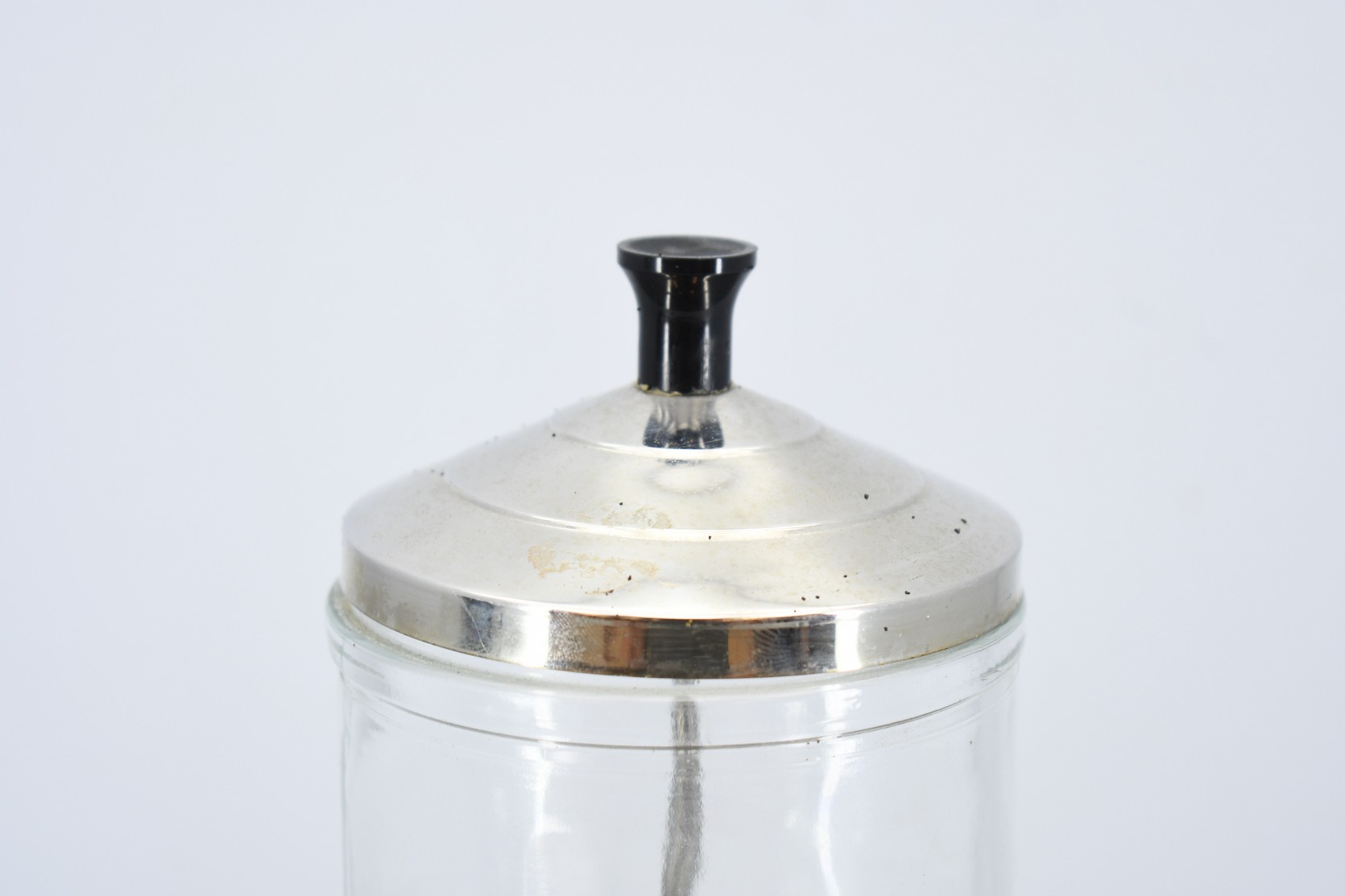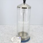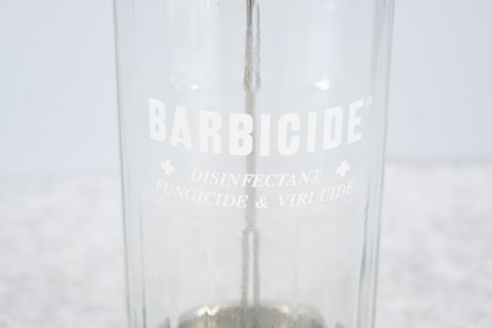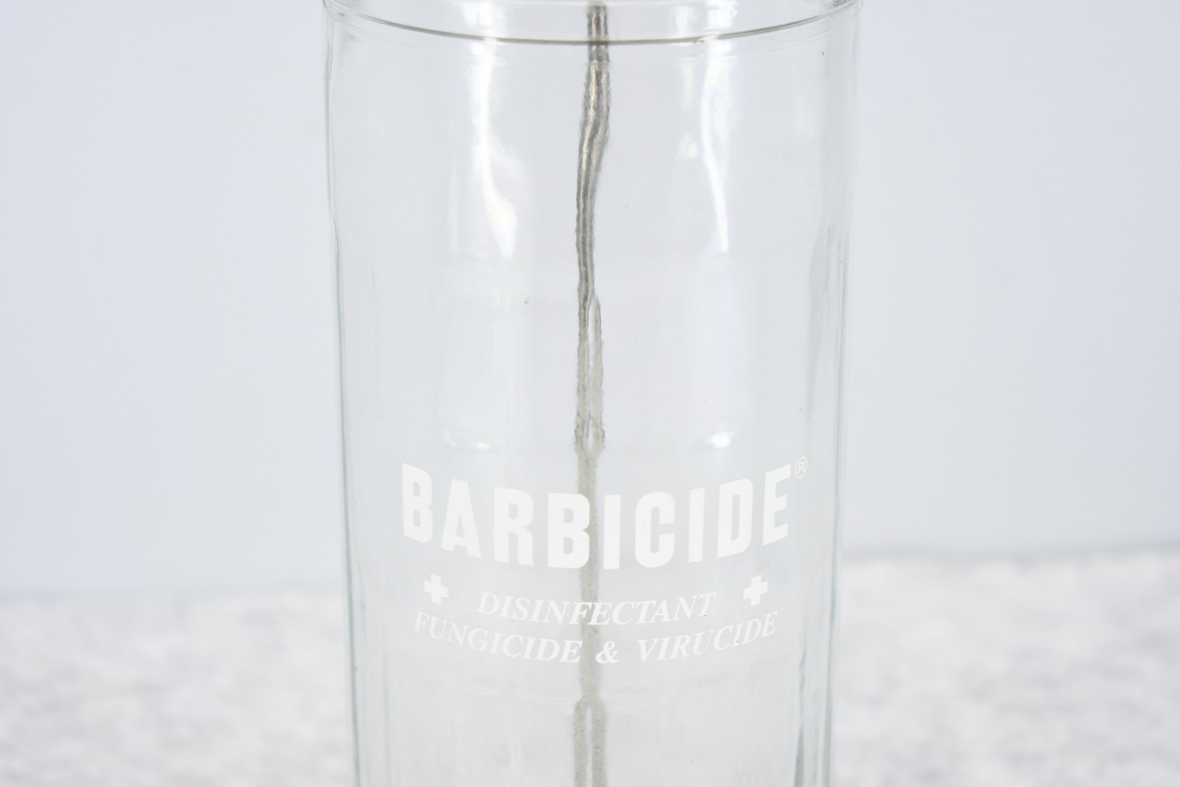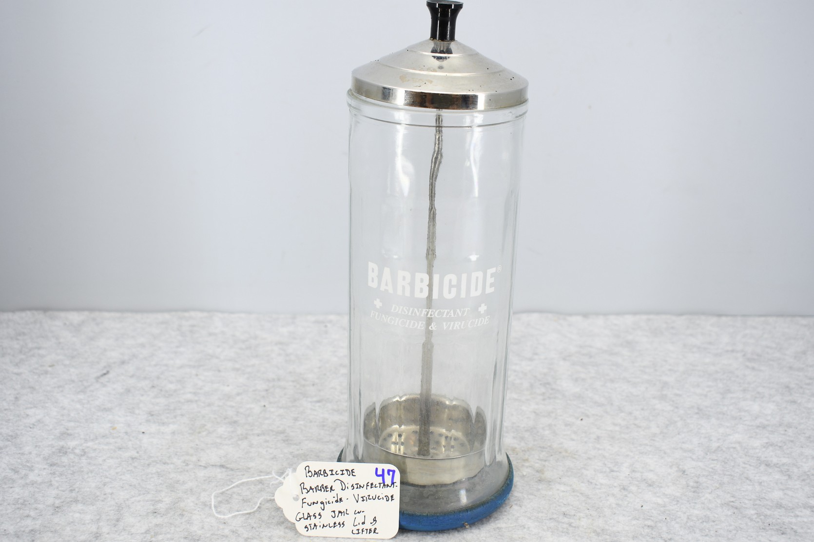 47. Barbicide, Disinfectant, Fungicide, and Virucide Glass Jar w/Correct Stainless Lid and Lifter Inside w/Blue Rubber Base