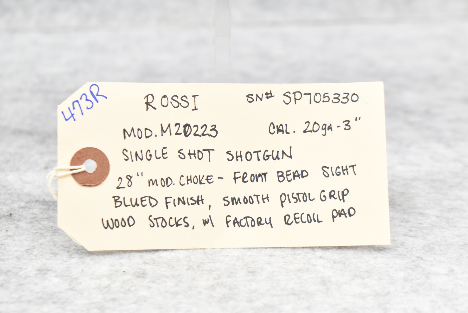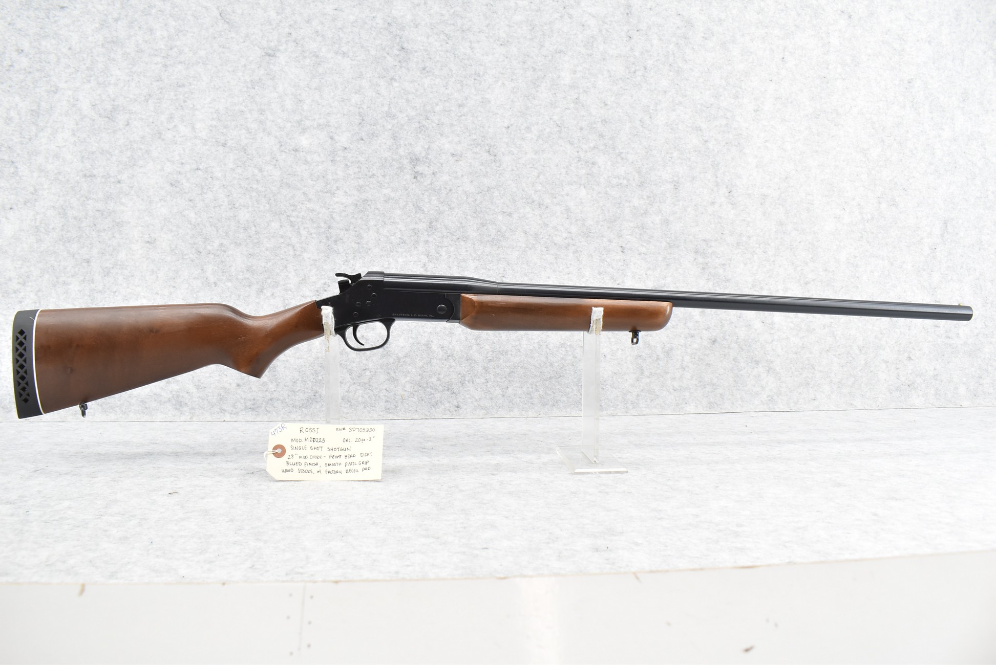 473R. Rossi – Mod. M20223 – 20ga. 3” Single Shot Shotgun – w/28” Mod. Choke Barrel w/Front Bead Sight – Blued Finish – w/Smooth Pistol Grip Wood Stocks w/Factory Recoil Pad