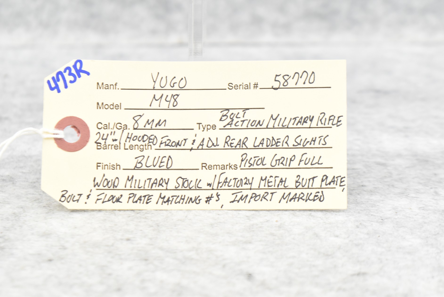 473R. Yugo – Mod. M48 – 8mm Cal. Bolt Action Rifle – w/24” Barrel w/Hooded Front & Adj. Rear Ladder Sights – Blued Finish – w/Pistol Grip Full Wood Military Stock w/Factory Metal Butt Plate – Bolt & Floor Plate Matching Numbers – Import Marked