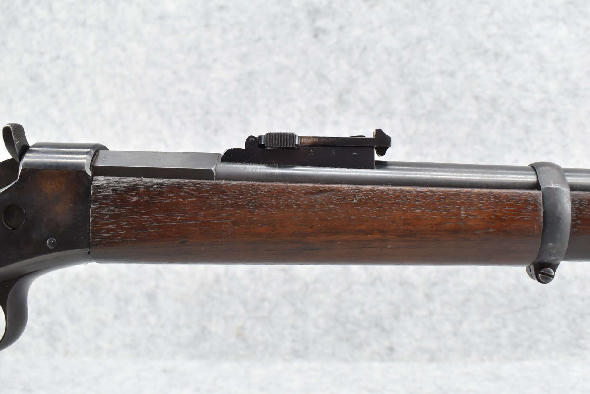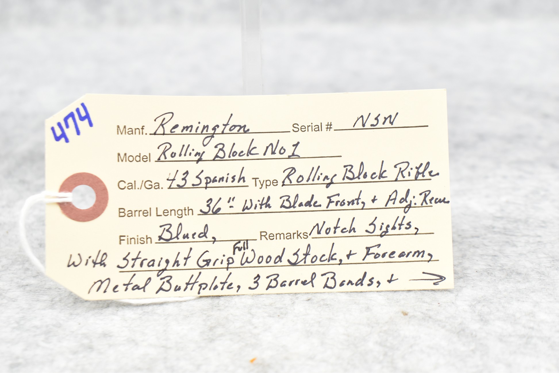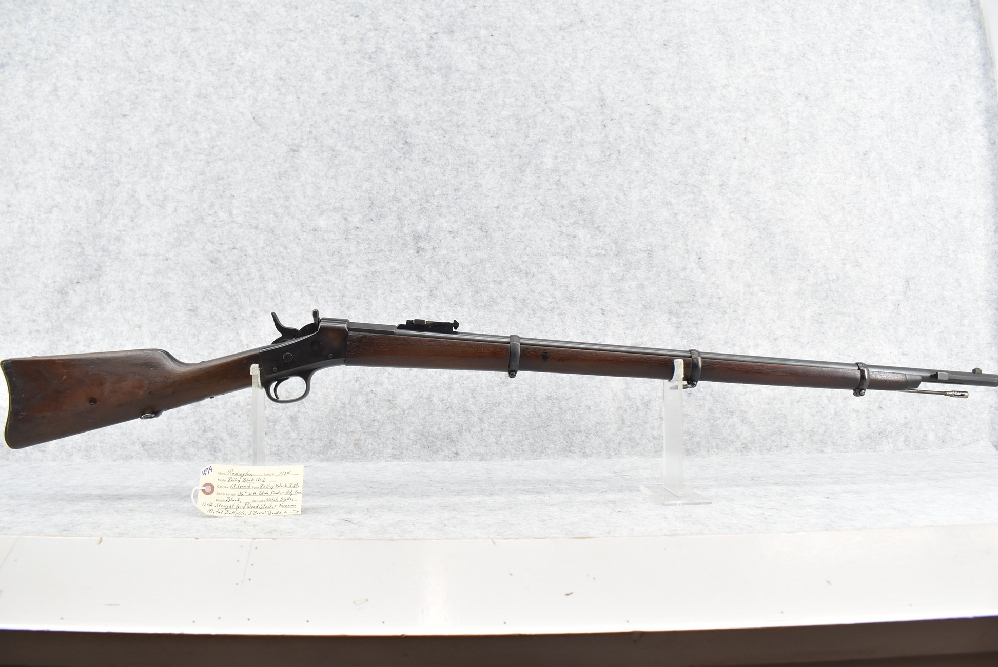 474. Remington – Mod. Rolling Block No. 1 – 43 Spanish Cal. Rolling Block Rifle – w/36” Barrel w/Blade Front & Adj. Rear Notch Sights – Blued Finish – w/Straight Grip Full Wood Stocks w/Metal Butt Plate & 3 Barrel Bands – w/Sling Loops – w/Cleaning Rod
