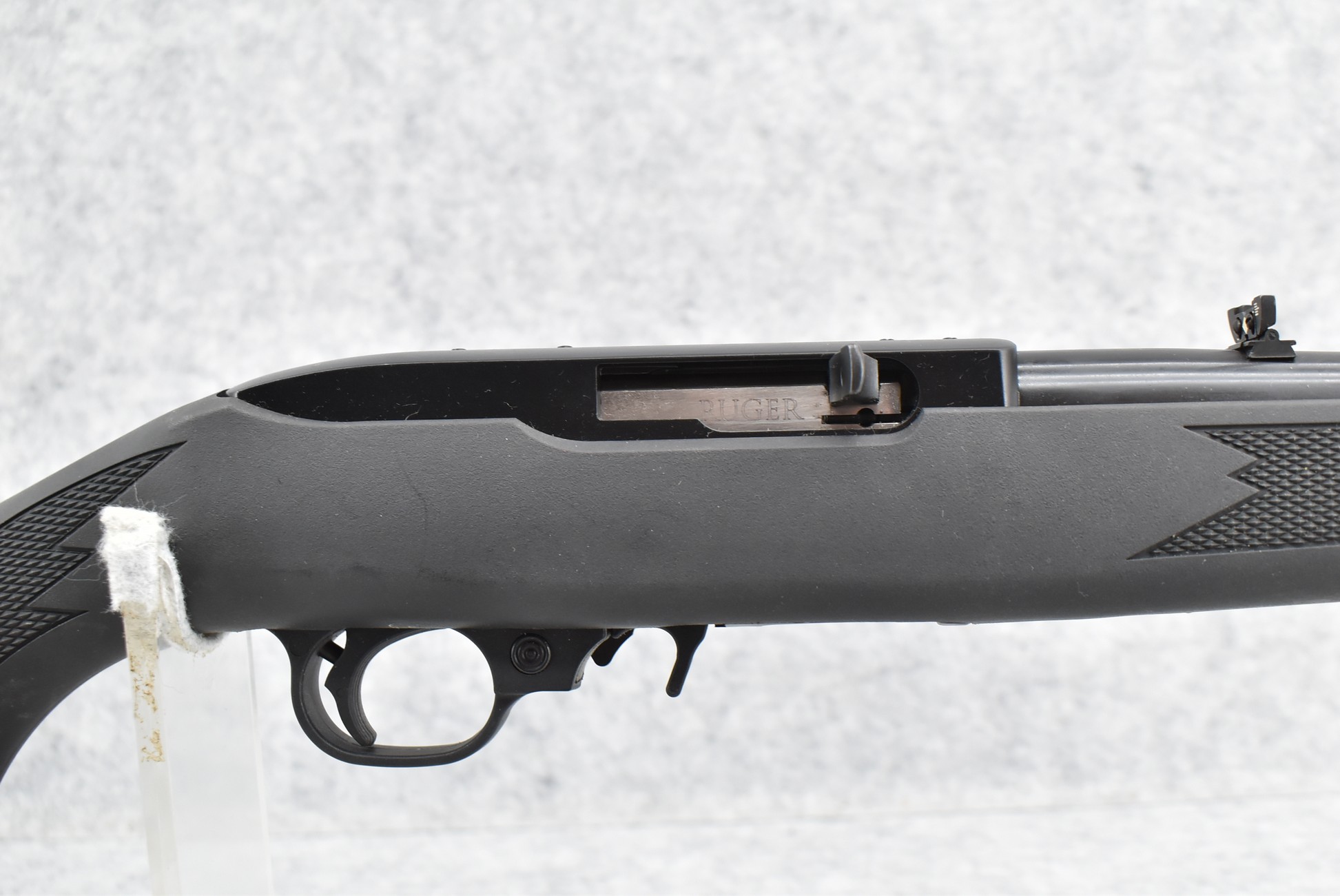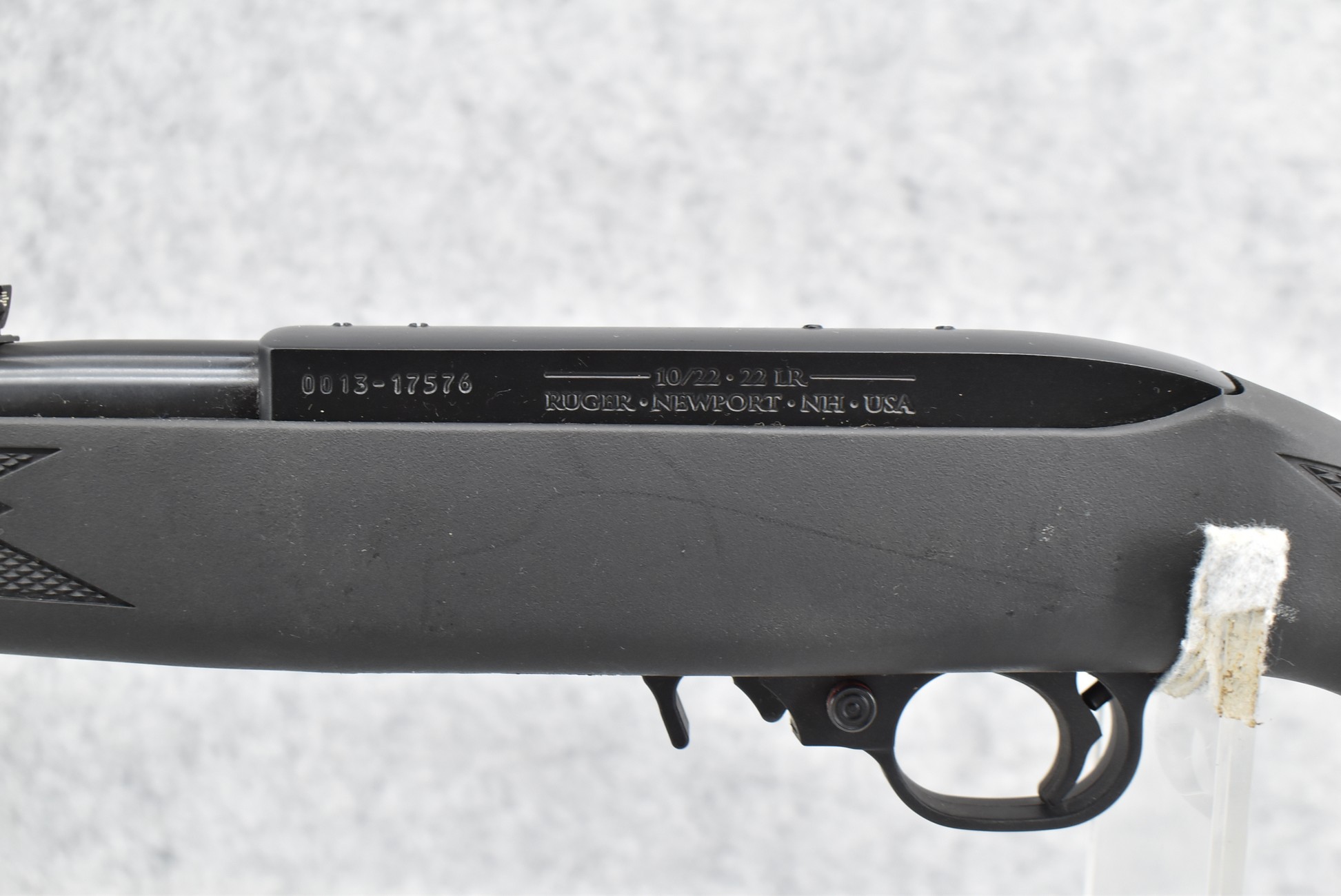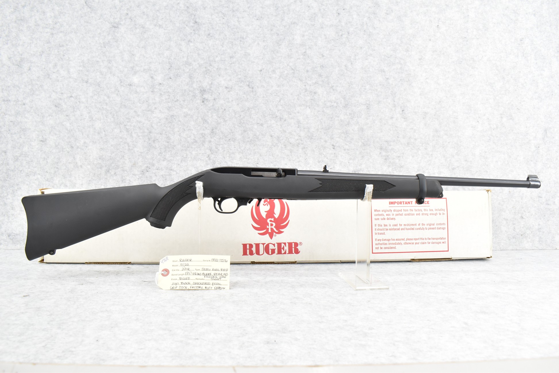 476R. Ruger – Mod. 10/22 – 22LR Cal. Semi-Auto Rifle – w/18.5” Barrel w/Front Blade & Rear Adj. Folding Leaf Sight – Blued Finish – w/Synthetic Black Checkered Pistol Grip Stock w/Factory Butt Plate – w/Factory Box & Detachable Mag & Box