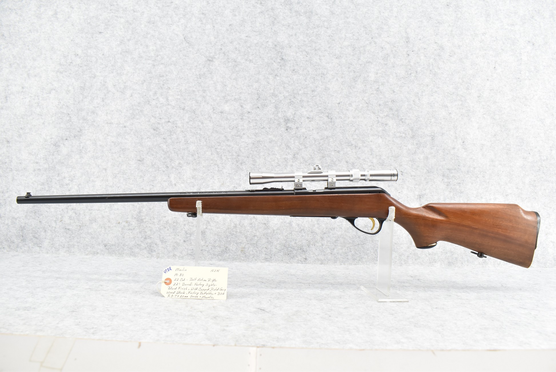 478R. Marlin – Mod. 80 – 22 Cal. Bolt Action Rifle – w/22” Barrel w/Factory Sights – Blued Finish – w/Capped Pistol Grip Wood Stock w/Factory Butt Plate – No Mag – w/BSA 3-7x20mm Scope & Mounts
