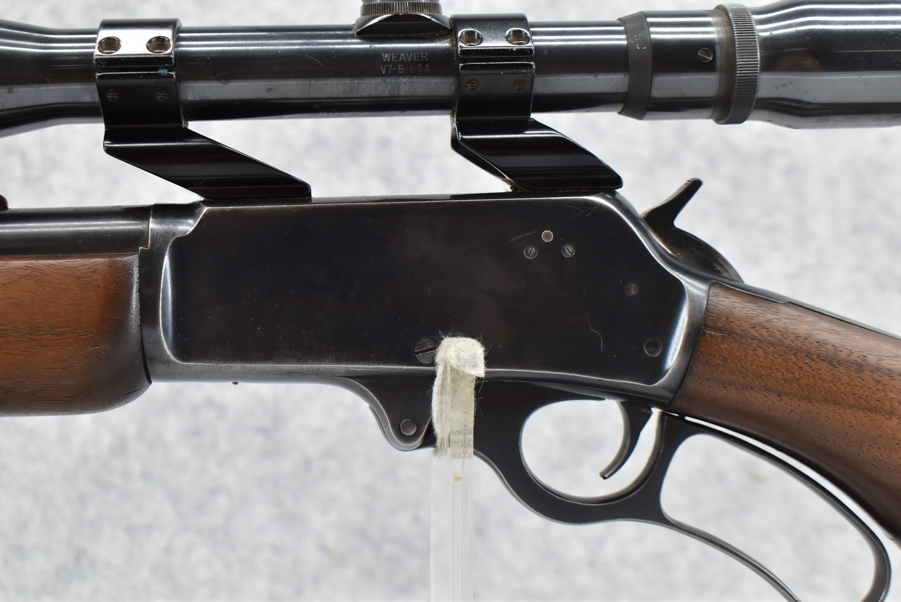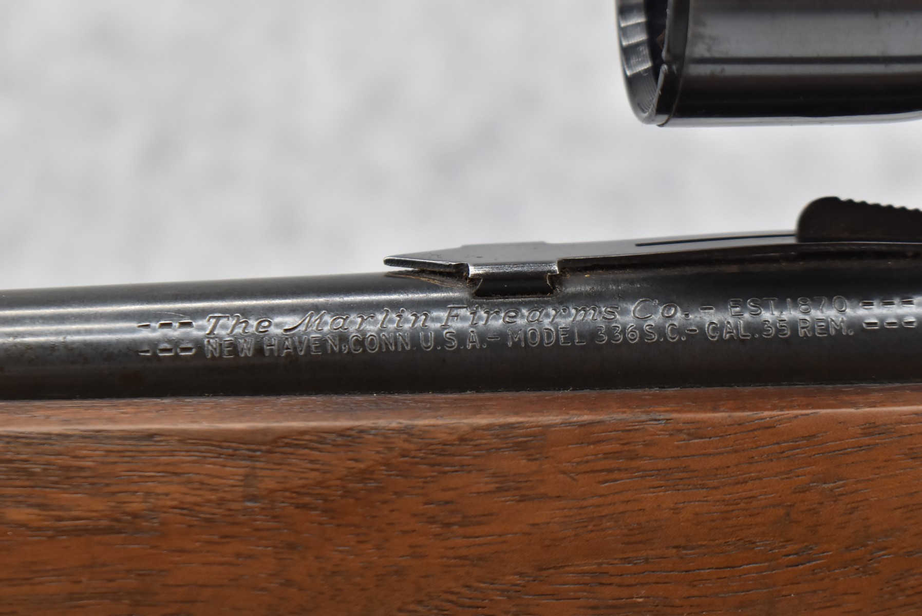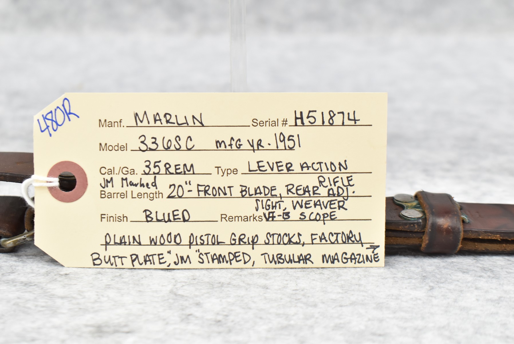 480R. Marlin – Mod. 336SC – 35 Rem. Cal. Lever Action Rifle – w/20” JM Marked Barrel w/Front Blade & Rear Rifle Sights – Blued Finish – w/Plain Pistol Grip Wood Stocks w/Factory Butt Plate – w/Tubular Magazine – w/Leather Sling – w/Weaver V7-B Scope – Mfg. 1951