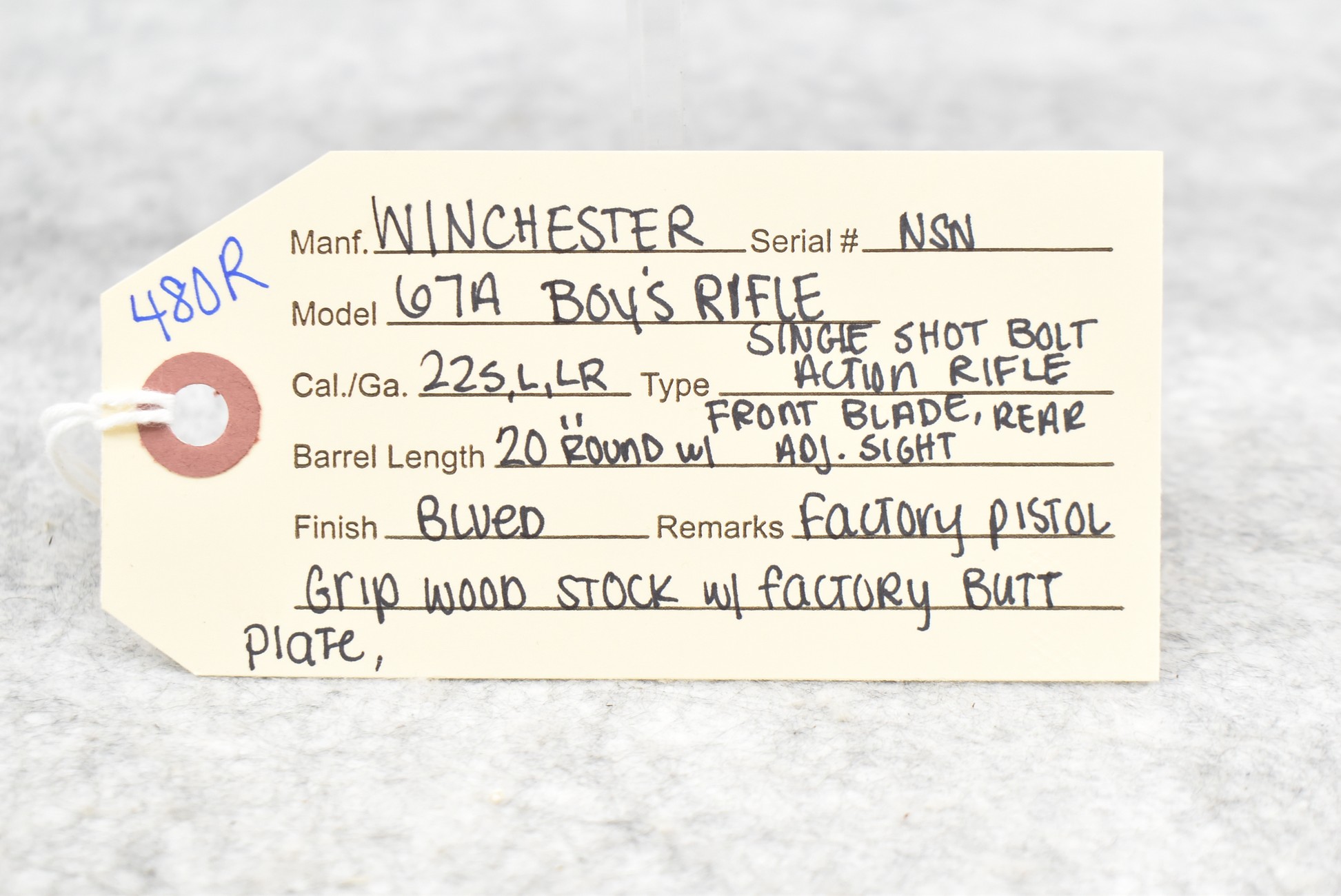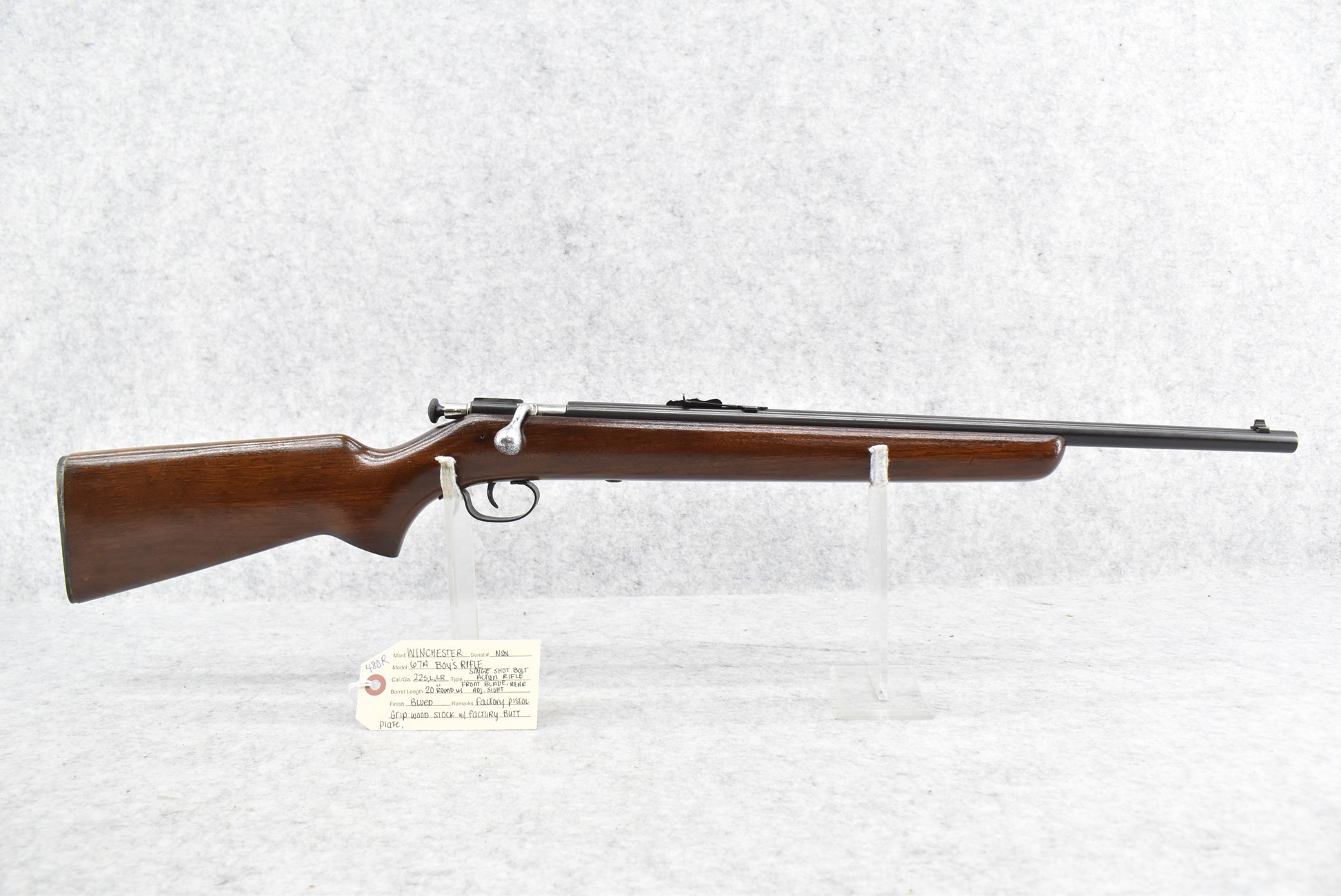 480R. Winchester – Mod. 67A Boys Rifle – 22 Cal. Single Shot Bolt Action Rifle – w/20” Round Barrel w/Blade Front and Adjustable Rear Sights – Blued Finish – w/Factory Pistol Grip Wood Stock w/Factory Butt Plate