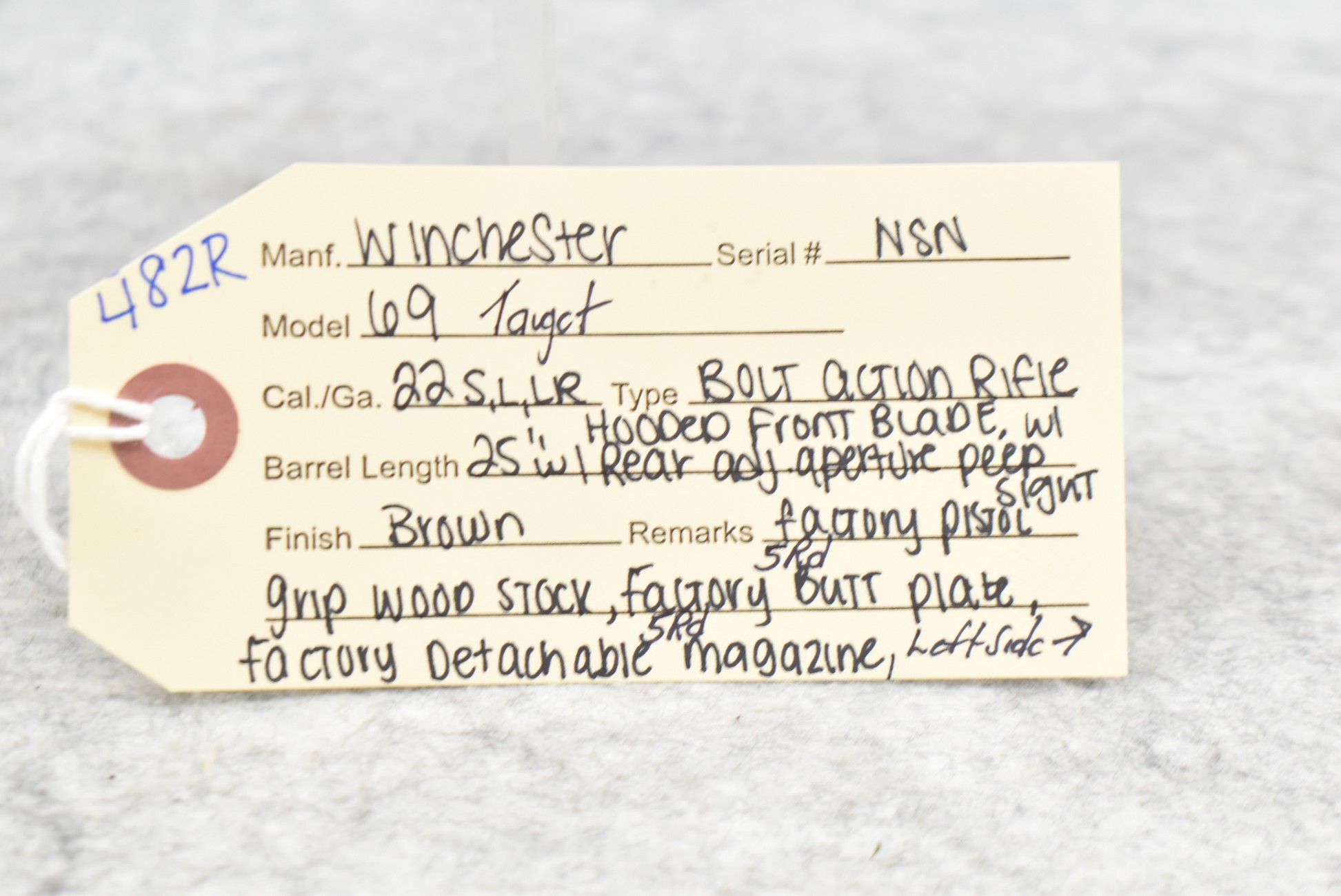 482R. Winchester – Mod. 69 Target – 22 Cal. Bolt Action Rifle – w/25” Barrel w/Hooded Front Blade & Rear Adj. Aperture Peep Sights – Blued/Brown Finish – w/Factory Pistol Grip Wood Stock w/Factory Butt Plate – w/Factory Detachable 5Rd Magazine – w/Left Side Push Button Magazine Release