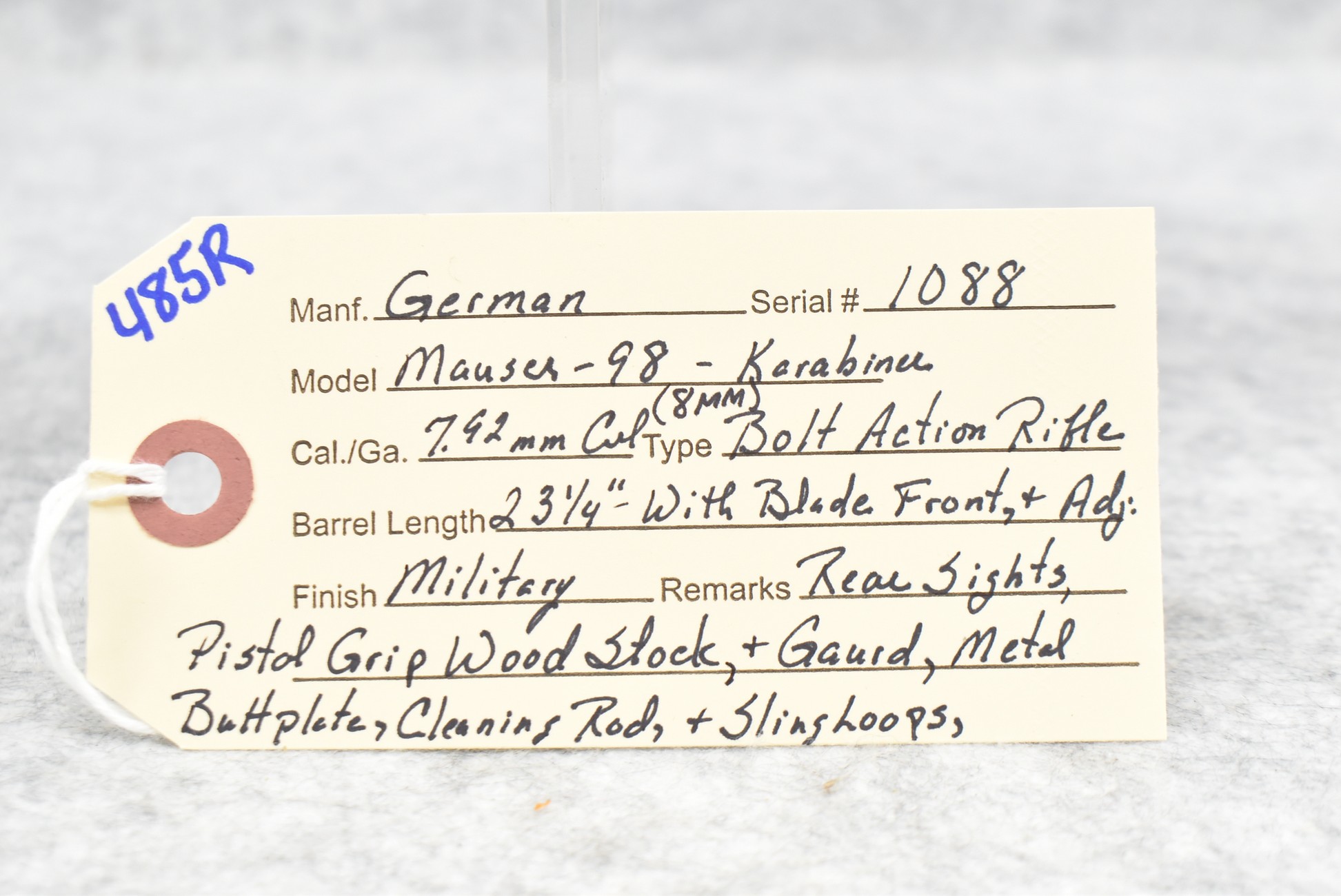 485R. German – Mod. Mauser 98 Karabiner – 7.92mm (8mm) Cal. Bolt Action Rifle – w/23 ¼” Barrel w/Blade Front & Adj. Rear Sights – Military Finish – w/Pistol Grip Wood Stocks w/Metal Butt Plate – w/Sling Loops – w/Cleaning Rod