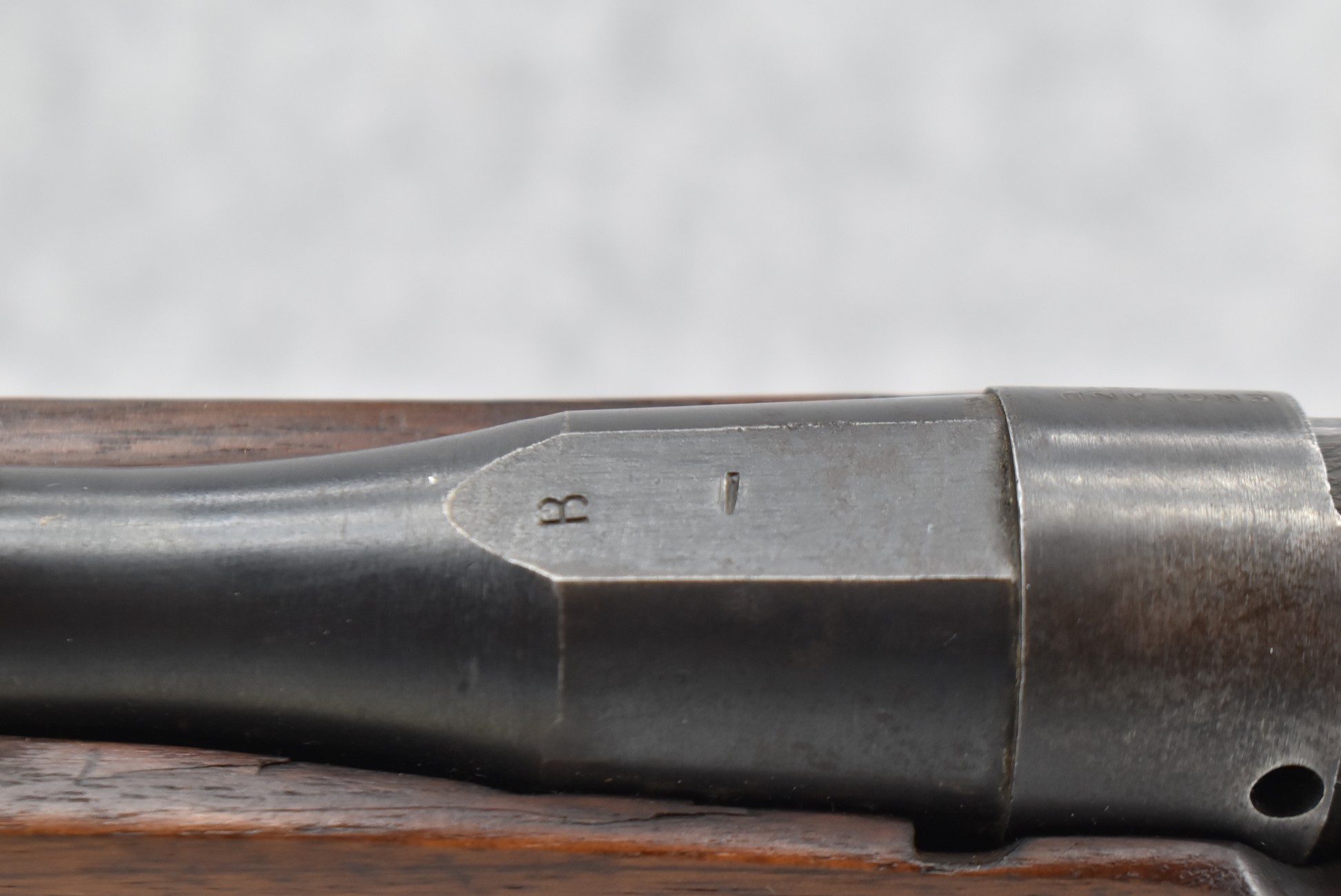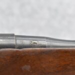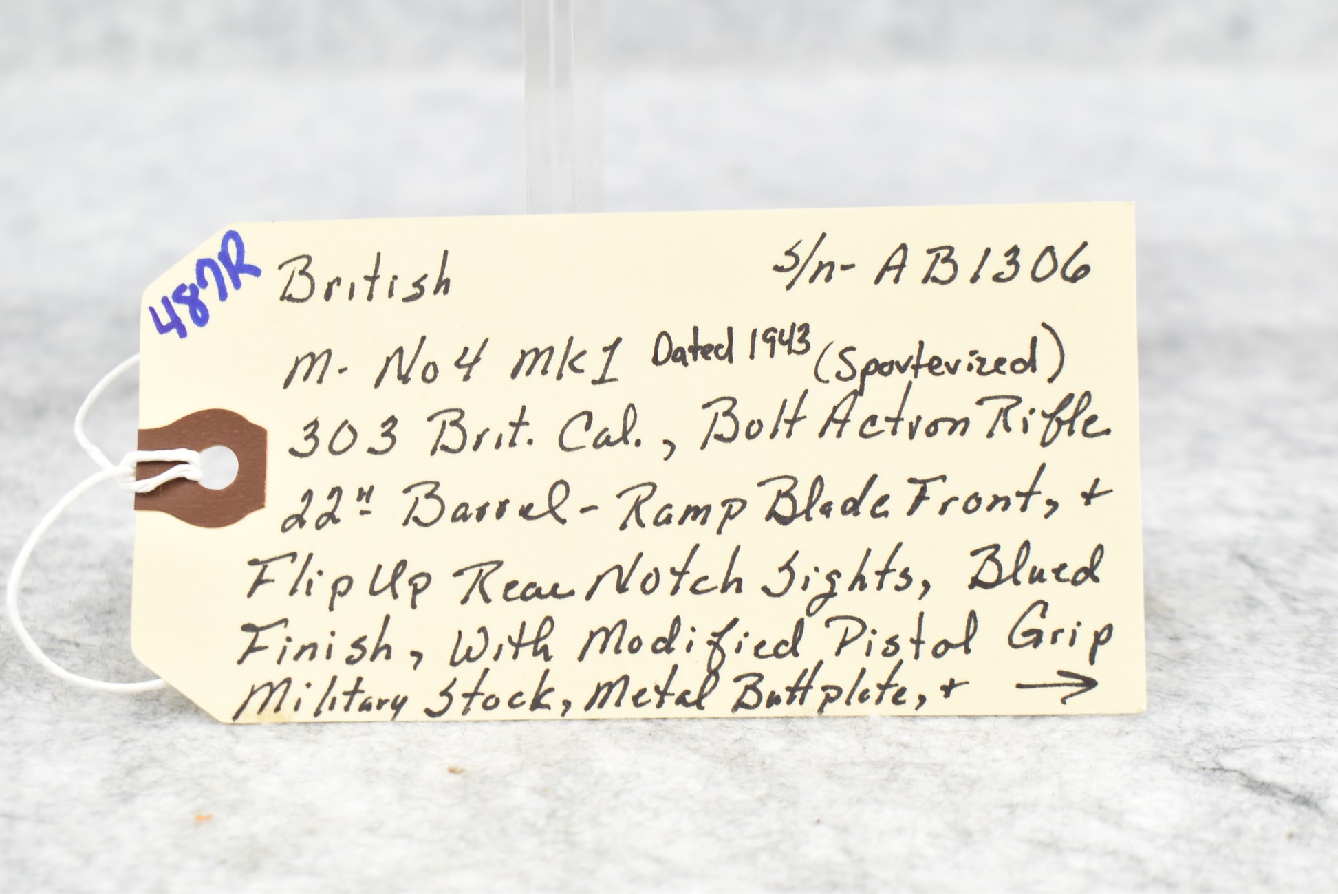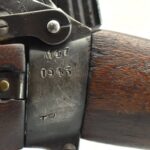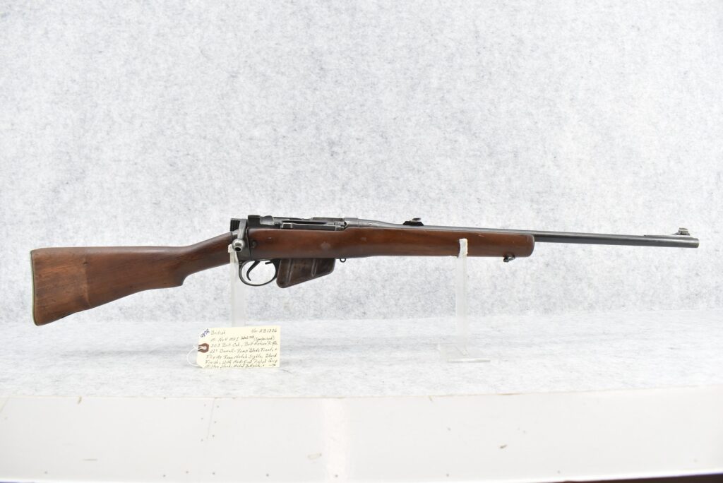 487R.     British – Mod. No. 4 MK1 – 303 Brit. Cal. Bolt Action Sporterized Rifle – w/22” Barel w/Ramp Blade Front & Flip Up Rear Notch Sights – Blued Finish – w/Modified Pistol Grip Military Stock w/Metal Butt Plate – w/Detachable Magazine – Dated 1943