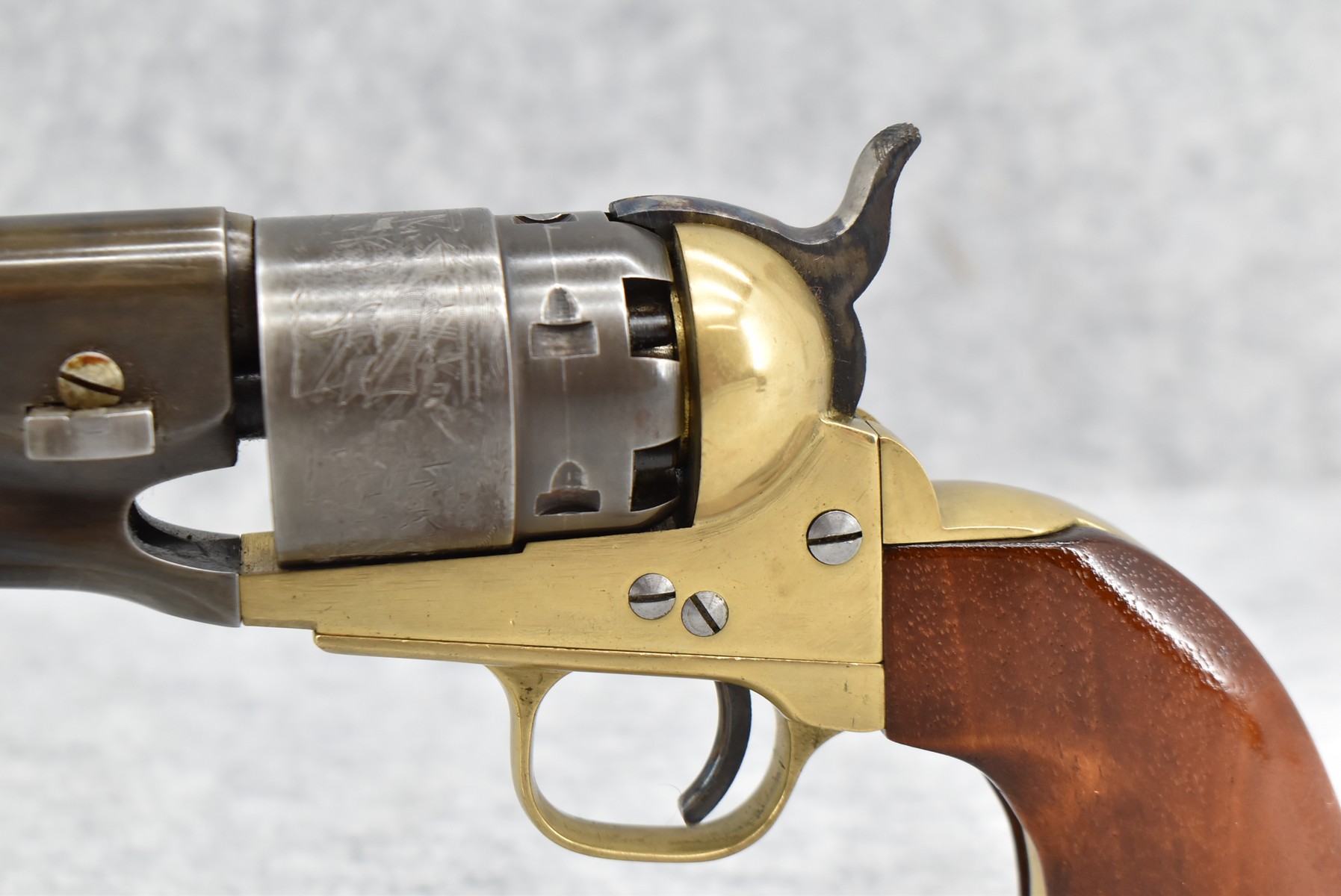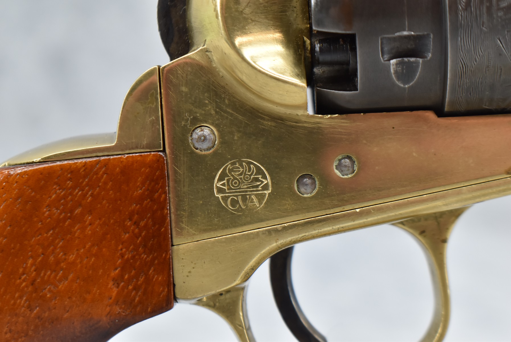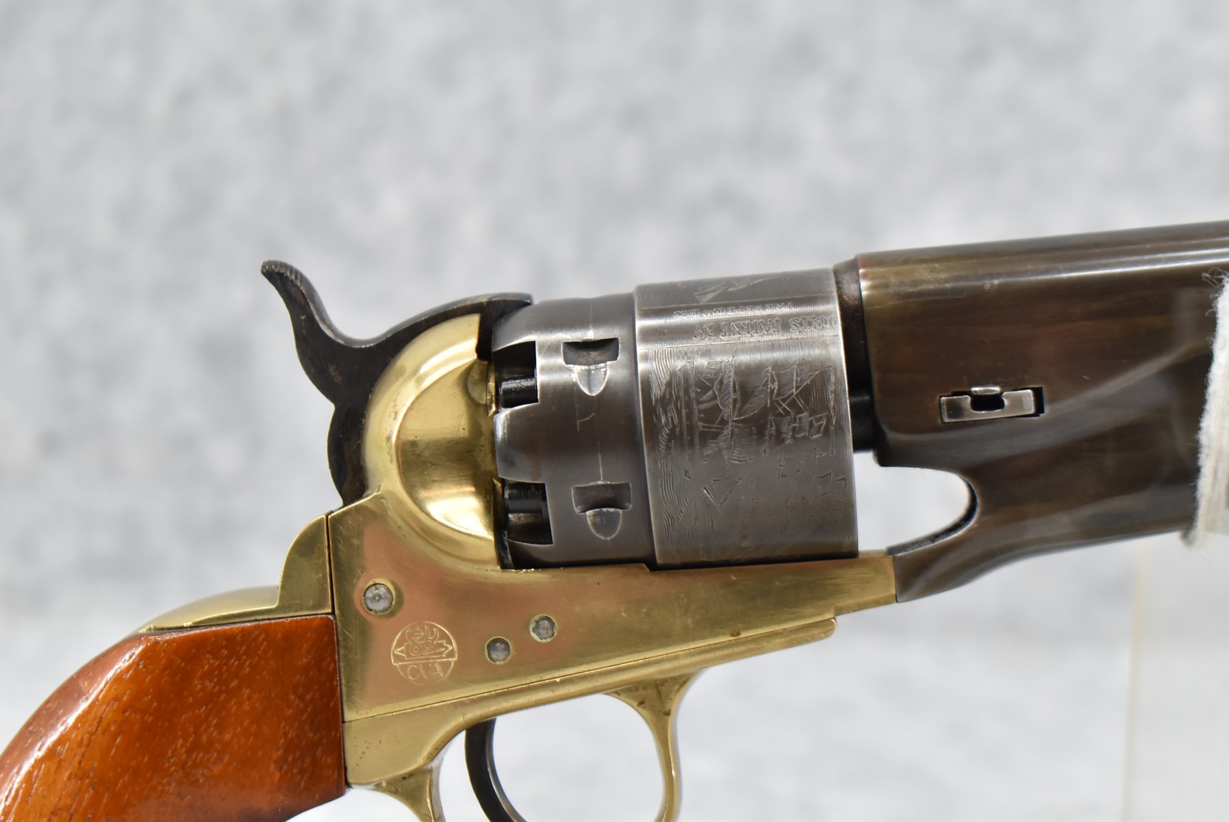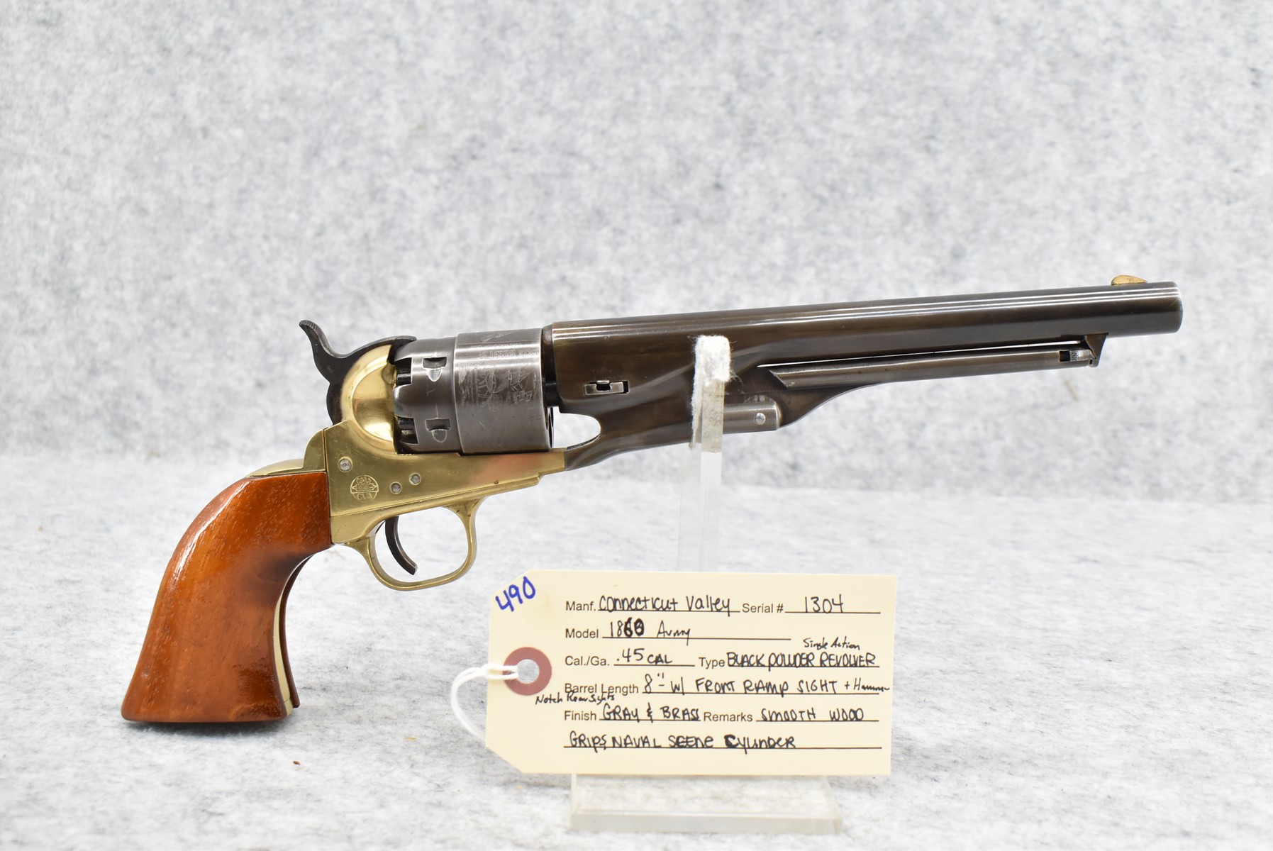 490. Connecticut Valley – Mod. 1860 Army – 45 Cal. Black Powder Single Action Revolver – w/8” Barrel w/Front Ramp Sight & Hammer Notch Rear Sights – Gray & Brass Finish – w/Smooth Wood Grips – w/Naval Scene Cylinder