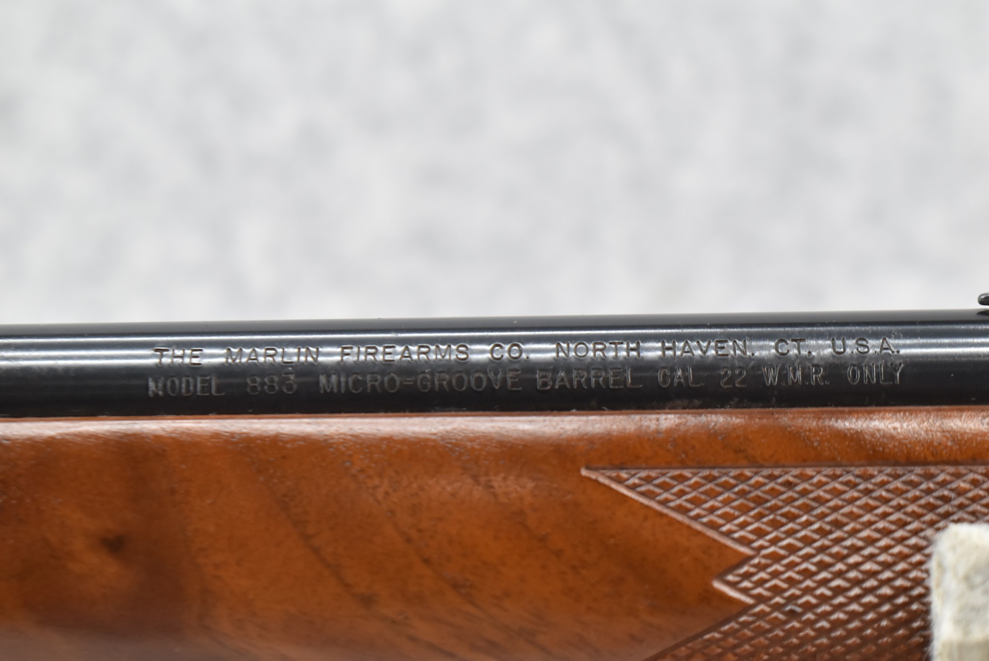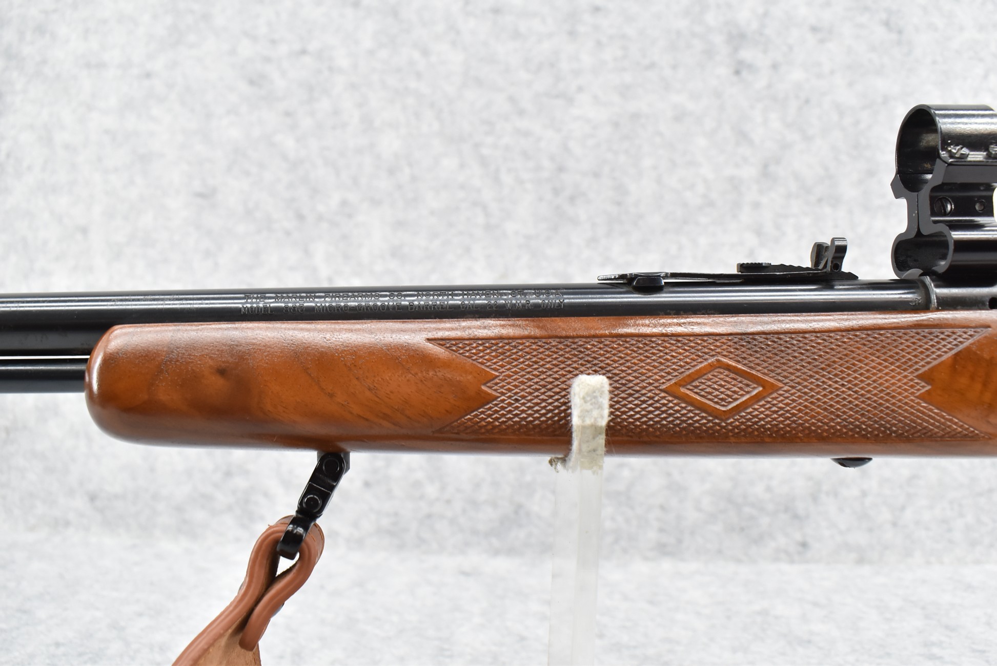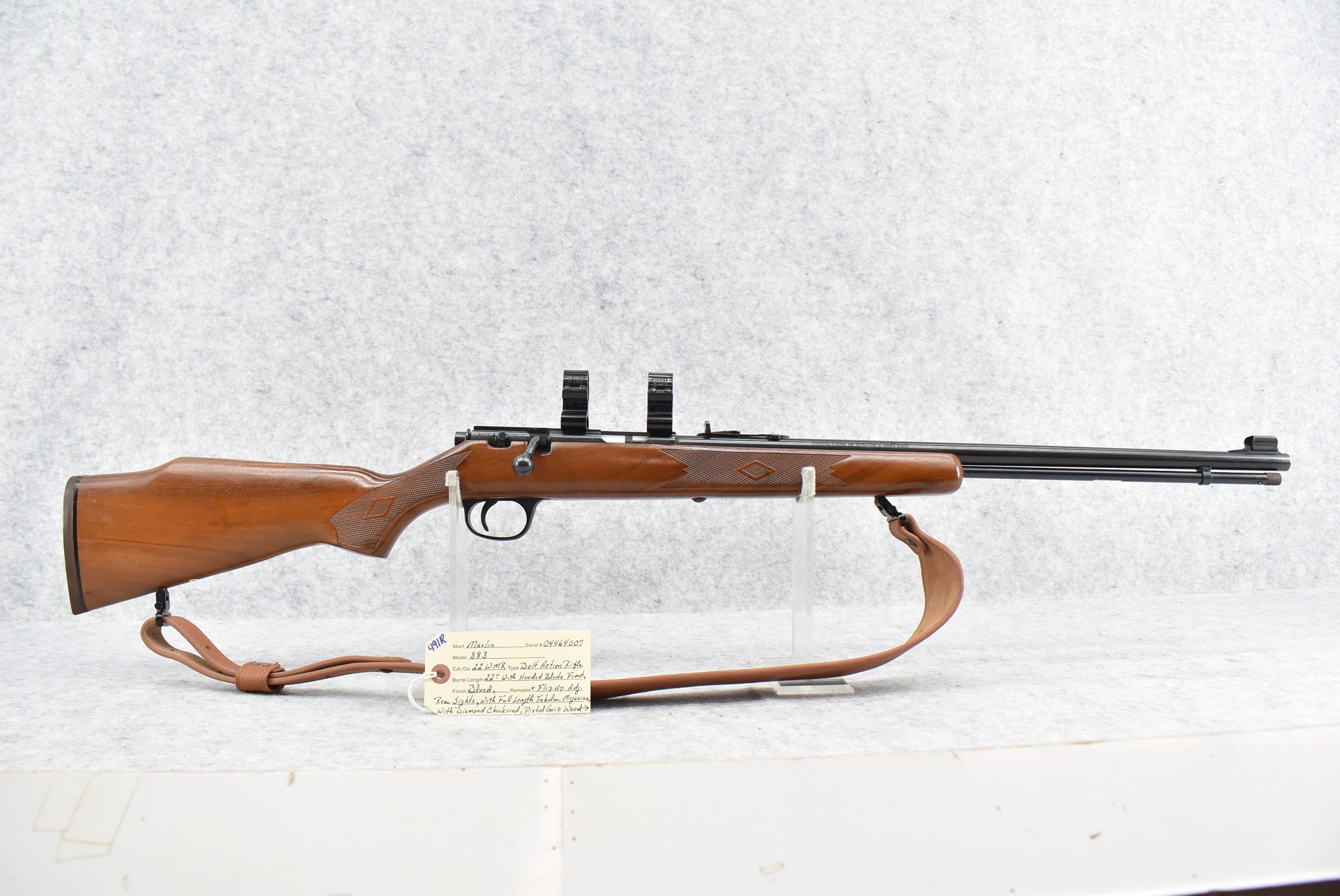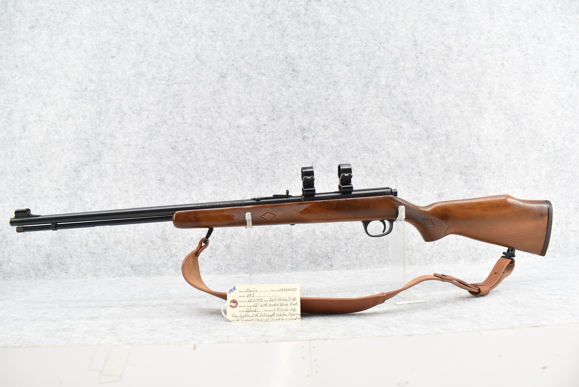 491R. Marlin – Mod. 883 – 22 WMR Cal. Bolt Action Rifle – w/22” Barrel w/Hooded Blade Front & Flip Up Adj. Rear Sights w/Full Length Tubular Magazine – Blued Finish – w/Diamond Checkered Pistol Grip Wood Stock w/Factory Butt Pad – w/Leather Sling – w/See Through Scope Mounts