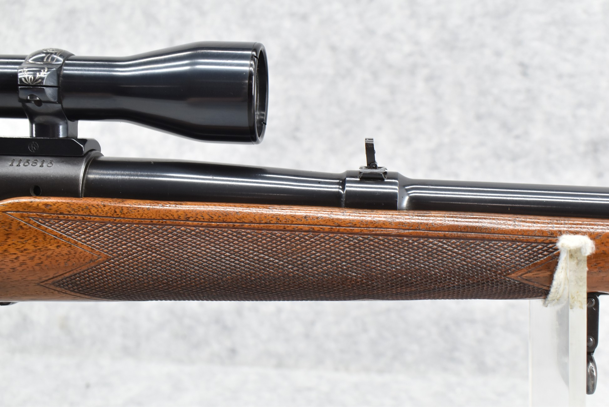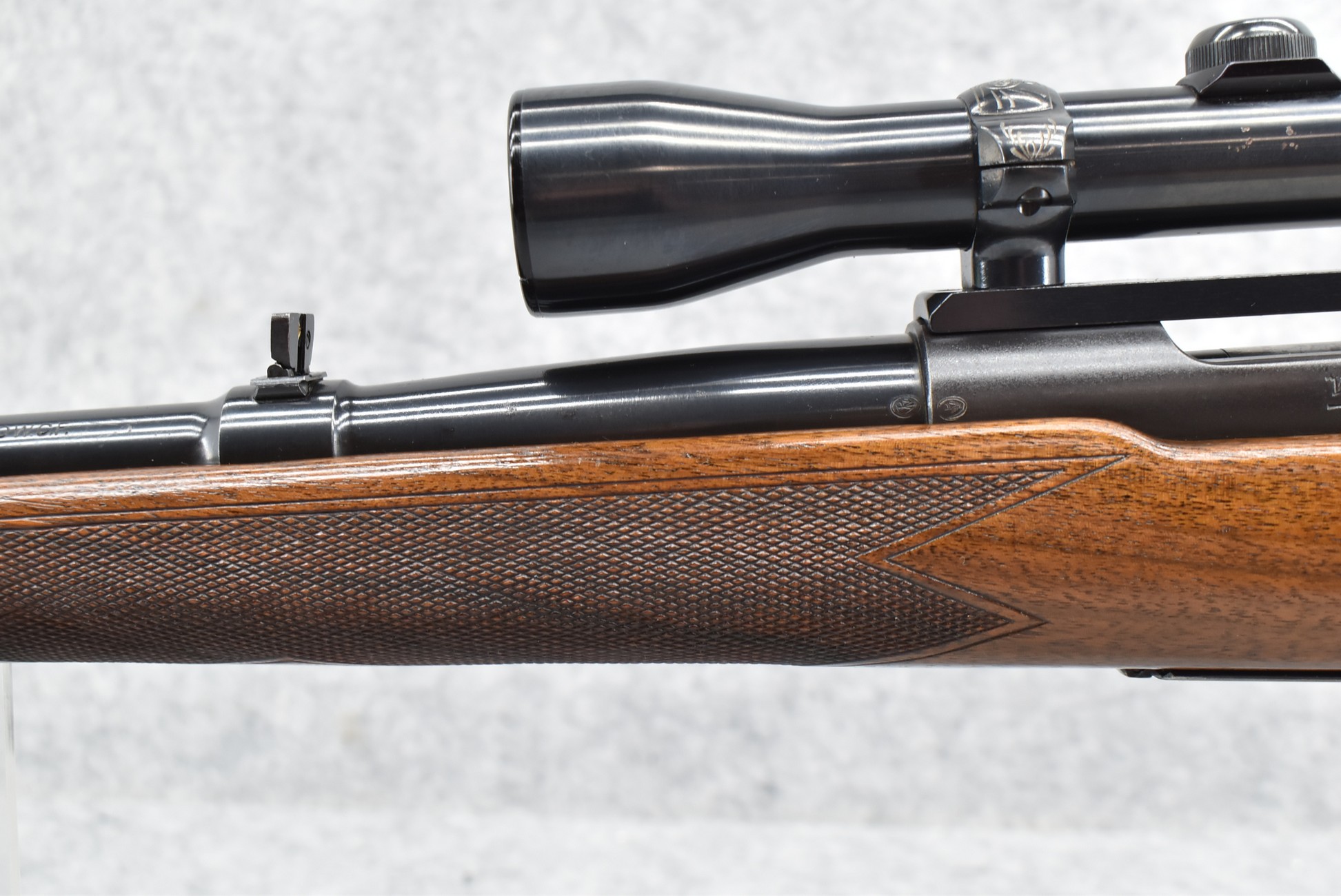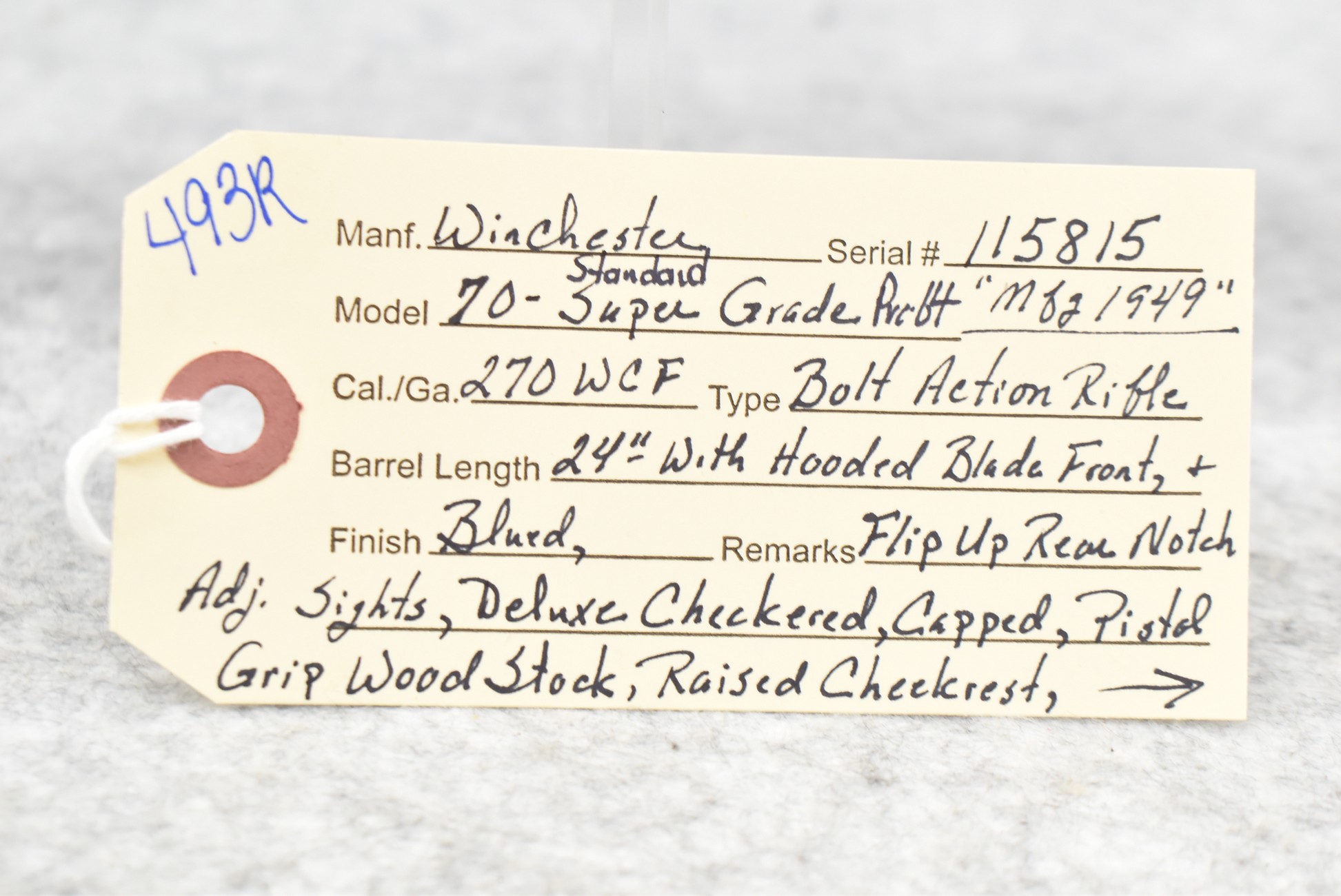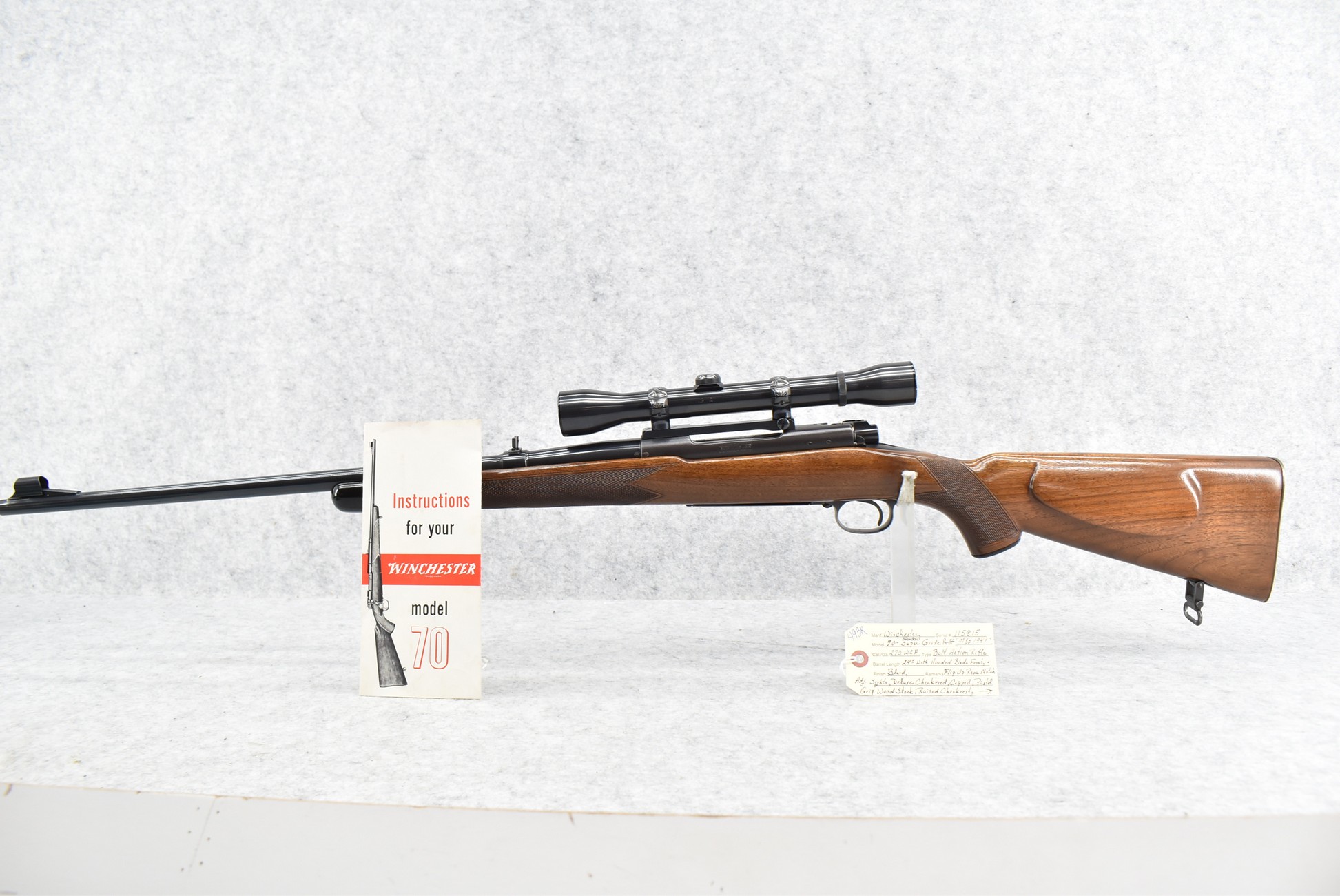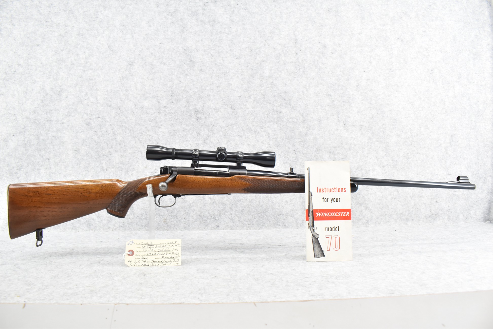 493R.     Winchester – Mod. 70 Standard Super Grade (Pre-64) – 270 WCF Cal. Bolt Action Rifle – w/24” Barrel w/Hooded Blade front & Flip Up Rear Notch Adj. Sights – Blued Finish – w/Deluxe Checkered Capped Pistol Grip Wood Stock w/Raised Cheek Piece w/Checkered Metal Butt Plate – w/Factory Super Grade Sling Swivels – w/Weaver K-4 60B Scope – w/Redfield Engraved Scope Rings & Mounting Base – w/Manual – Mfg. 1949