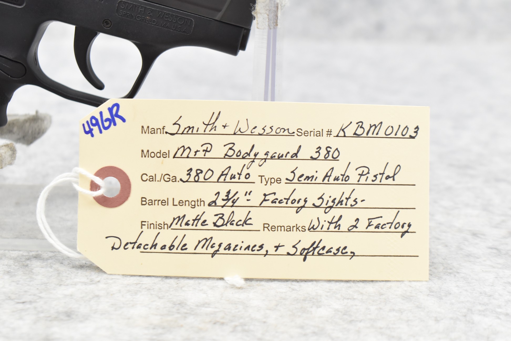496R. Smith & Wesson – Mod. M&P Bodyguard 380 – 380 Auto Cal. Semi-Auto Pistol – w/2 ¾” Barrel w/Factory Sight – Matte Black Finish – w/2 Factory Detachable Magazines – w/Soft Case