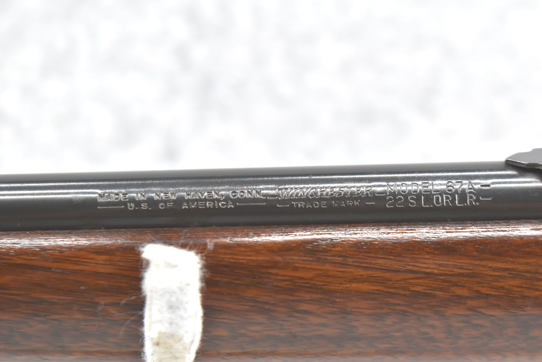 501R. Winchester – Mod. 67A – 22 Cal. Bolt Action Single Shot Rifle – w/27” Barrel w/Blade Front & Adj. Rear Sights – Blued Finish – w/Smooth Pistol Grip Wood Stocks w/Factory Butt Plate – Mfg. Between 1934-1963