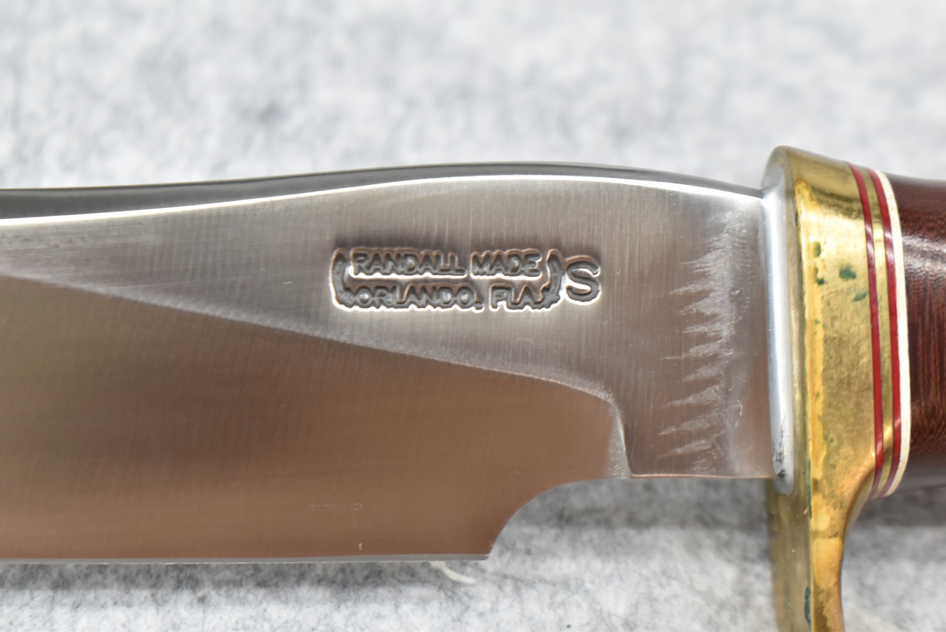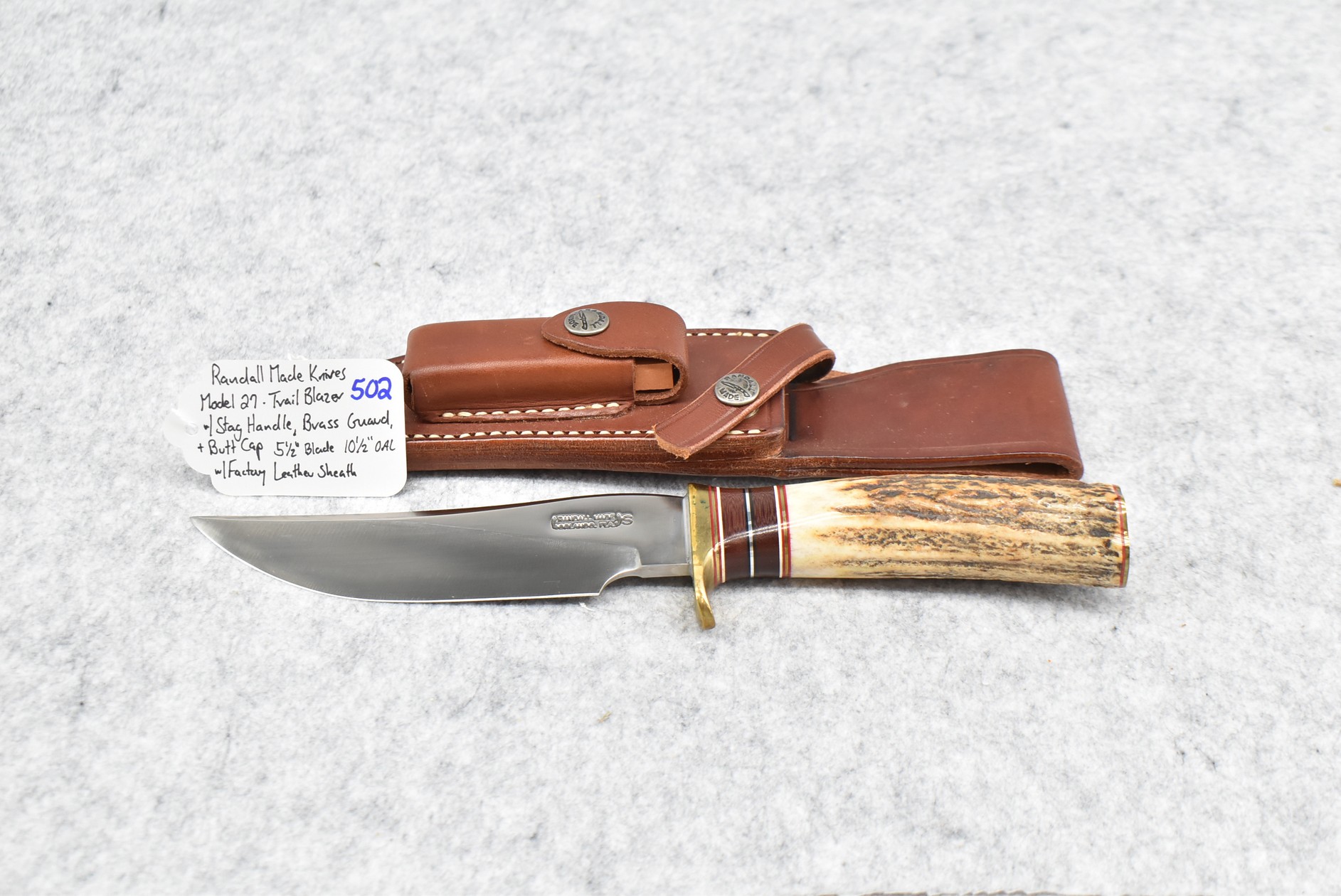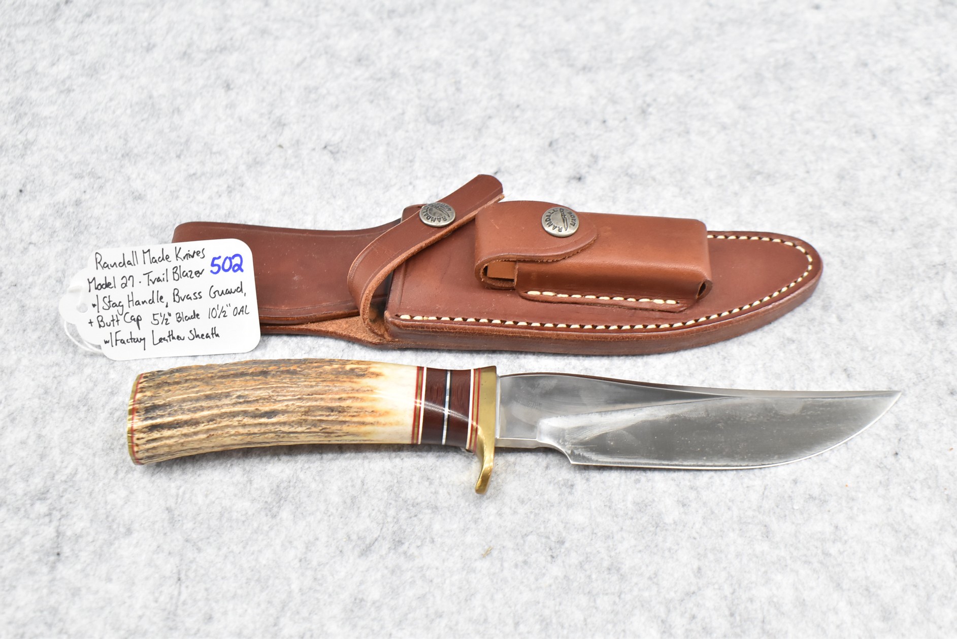 502. Randall Made Knives – Model 27 Trail Blazer – w/5 ½” Blade – 10 ½” Overall Length – w/Stang Handle – w/Brass Guard & Butt Cap – w/Factory Leather Sheath