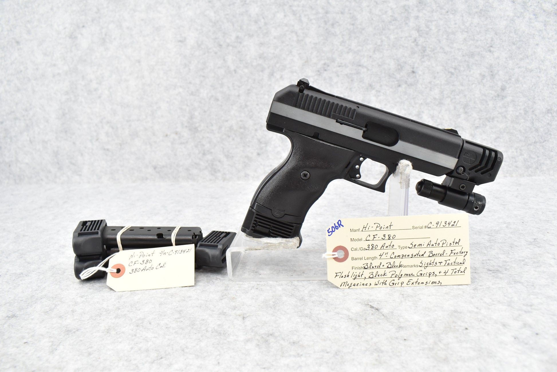 506R. Hi-Point – Mod. CF-380 – 380 Auto Cal. Semi-Auto Pistol – w/4” Compensated Barrel w/Factory Sights – Blued/Black Finish – w/Black Polymer Grips – w/4 Total Magazines – w/Grip Extensions – w/Tactical Flashlight