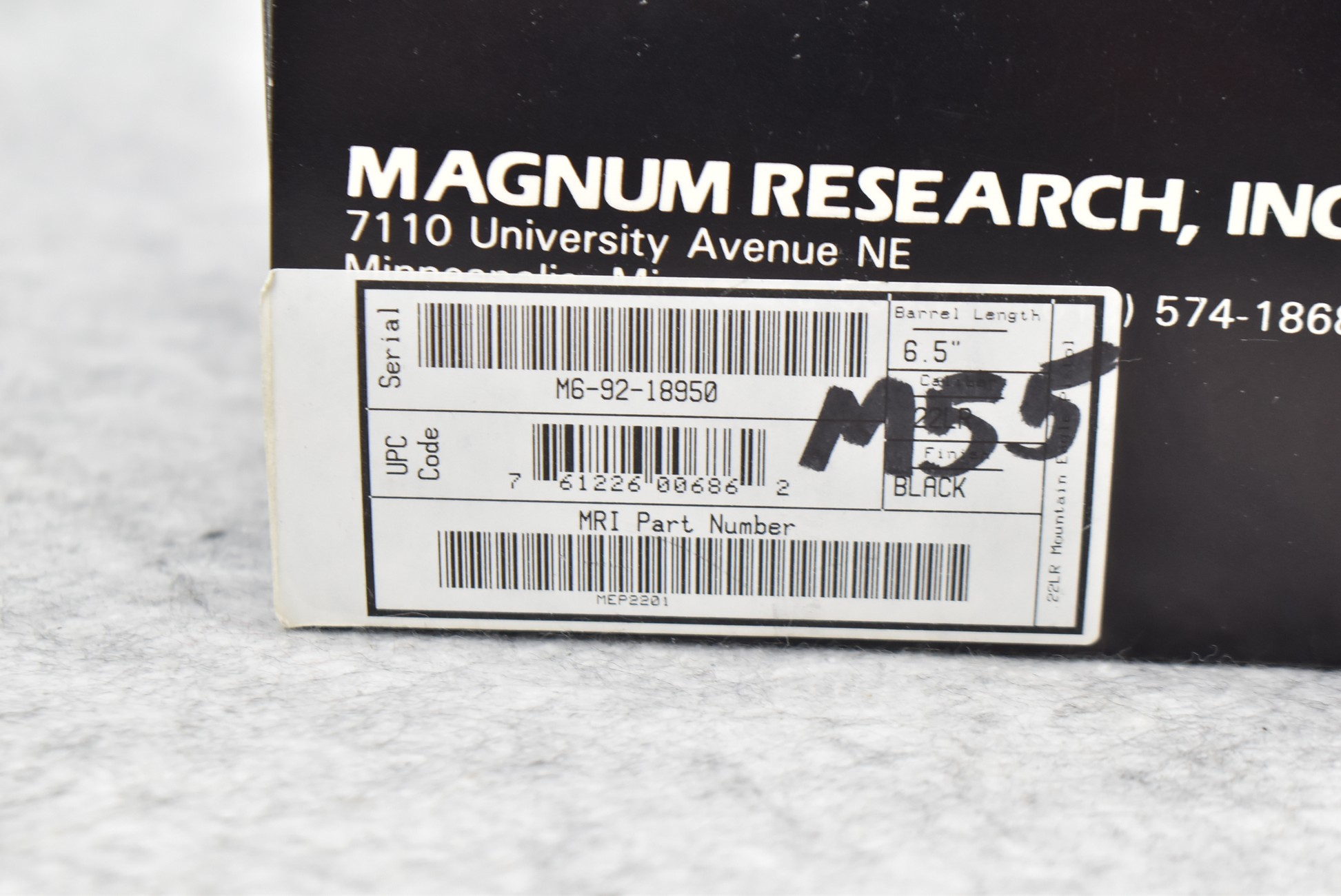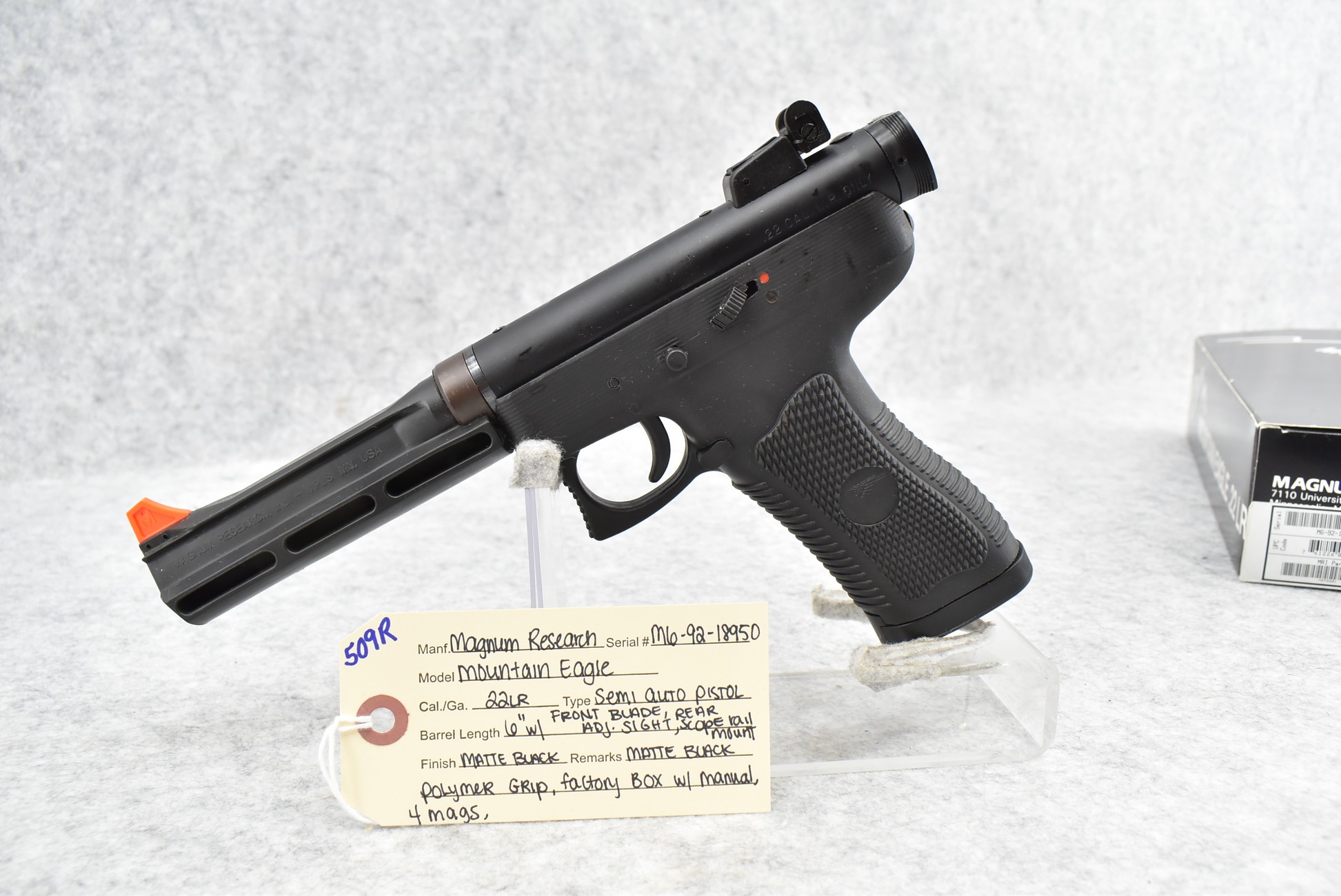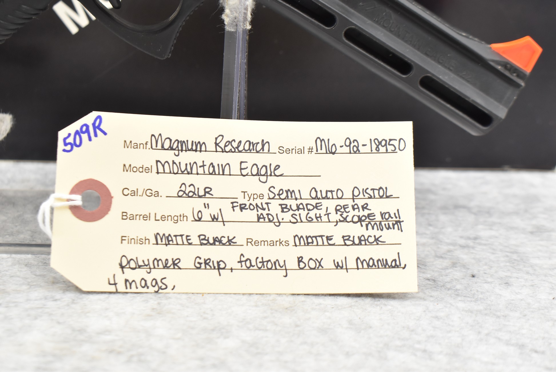 509R. Magnum Research – Mod. Mountain Eagle – 22LR Cal. Semi-Auto Pistol – w/6” Barrel w/Front Blade & Rear Adj. Sights – Matte Black Finish – w/Polymer Grip – w/Scope Rail Mount – w/Factory Box, Manual & 4 Mags