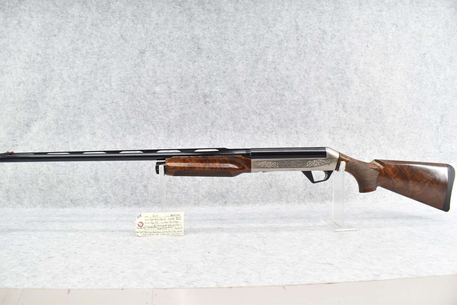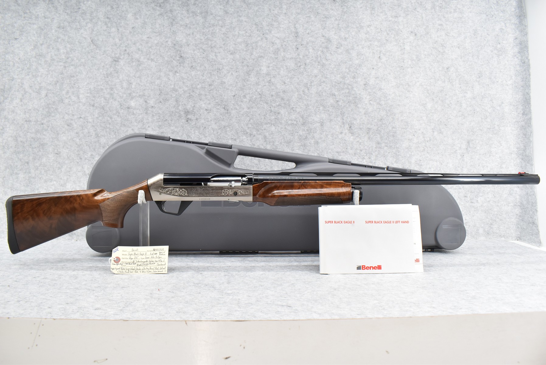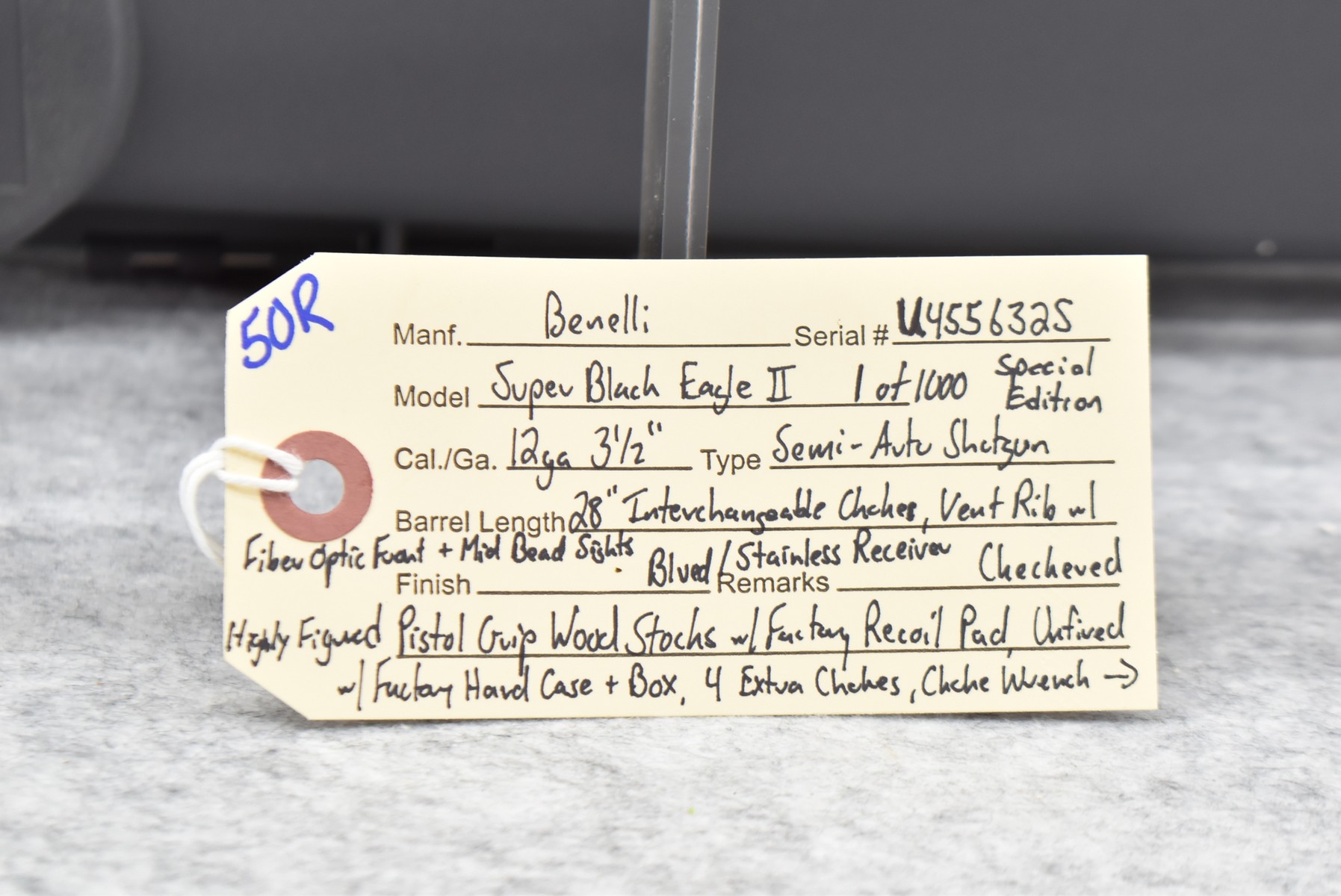 50R.       Benelli – Mod. Super Black Eagle II – 1 of 1,000 Special Edition – 12ga. 3 ½” Semi-Auto Shotgun – w/28” Interchangeable Chokes, Vent-Rib Barrel w/Fiber Optic Front & Mid Bead Sights – Blued Finish w/Stainless Receiver – w/Checkered Highly Figured Pistol Grip Wood Stocks w/Factory Recoil Pad – Unfired w/Factory Hard Case & Shipping Sleeve, 4 Extra Chokes, Choke Wrench & Manual