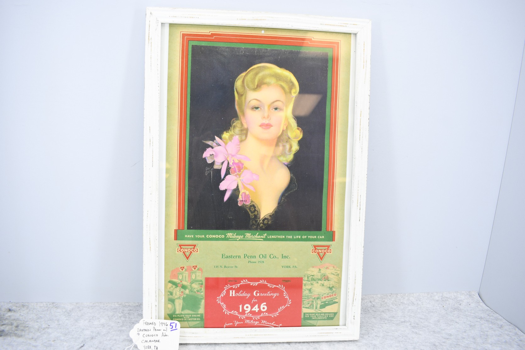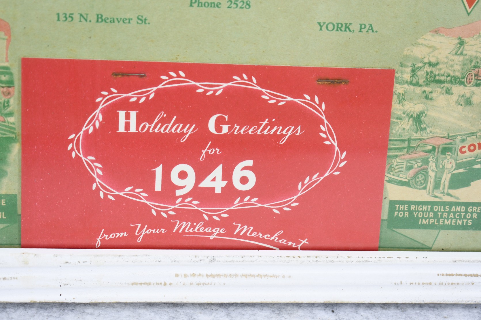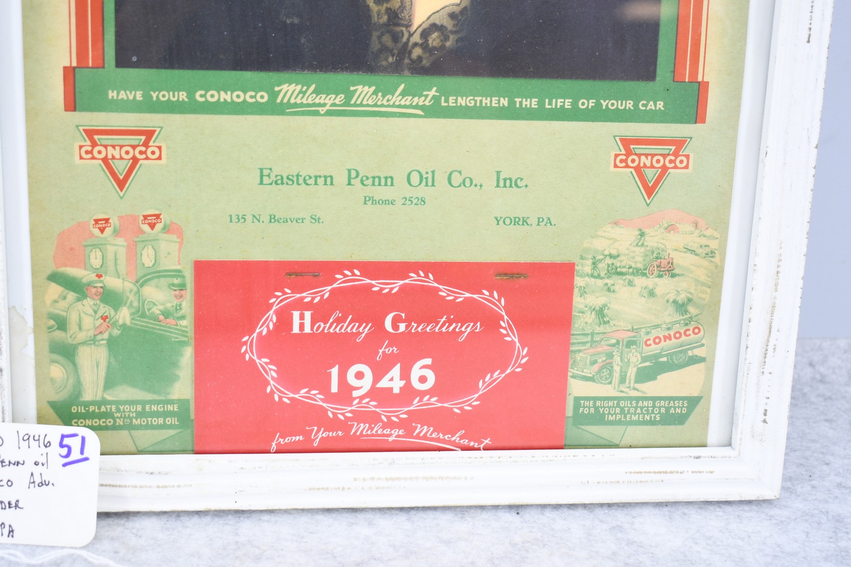 51. 1946 Eastern Penn Oil Co. Inc. York PA Framed Holiday Greeting Calendar – Conoco “Your Milage Merchant” – Calander Appears to be Complete – Measures 12” x 18”
