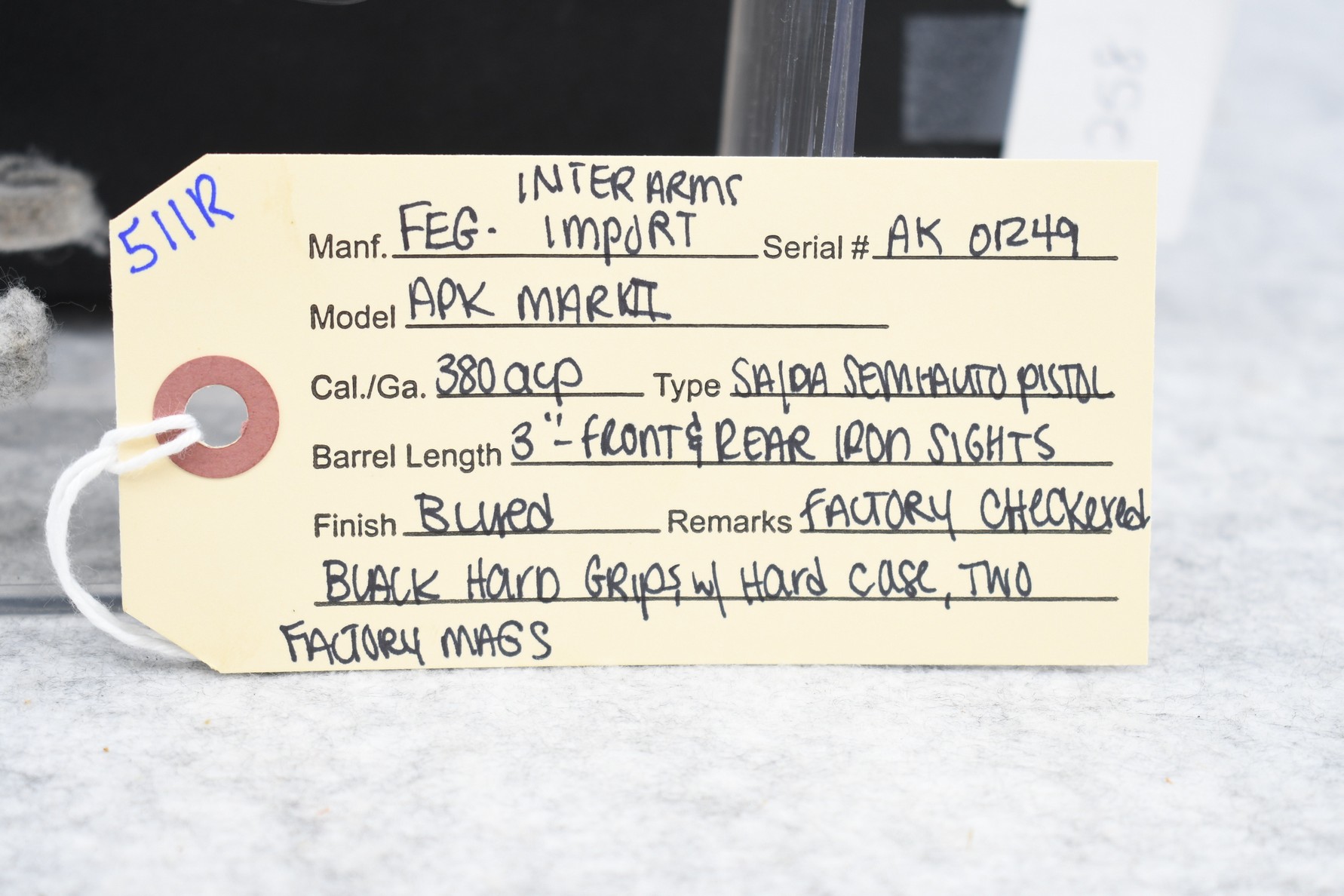 511R. FEG (Interarms Import) – Mod. APK Mark II – 380 ACP Cal. Semi-Auto Pistol – w/3” Barrel w/Front & Rear Iron Sights – Blued Finish – w/Factory Checkered Black Hard Grips – w/Hard Case & 2 Factory Mags