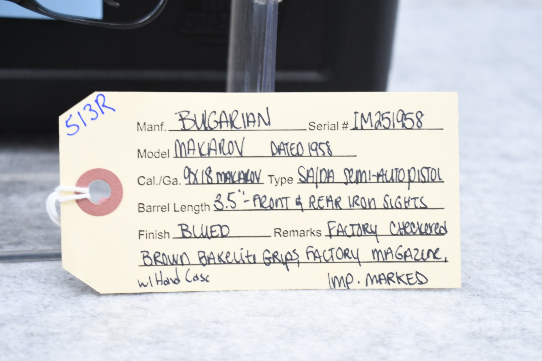 513R. Bulgarian – Mod. Makarov – 9×18 Mak. Cal. Semi-Auto Pistol – w/3.5” Barrel w/Front & Rear Iron Sights – Blued Finish – w/Factory Checkered Brown Bakelite Grips – w/Factory Magazine – w/Hard Case – Dated 1958 – Import Marked