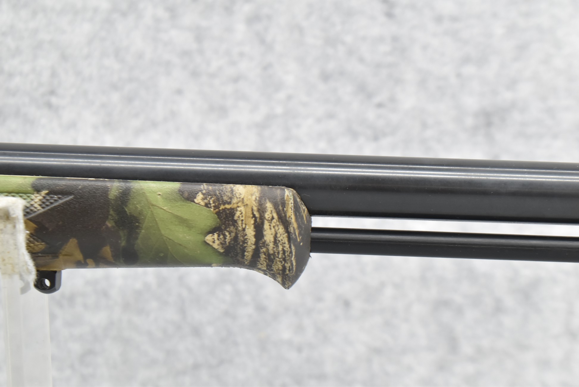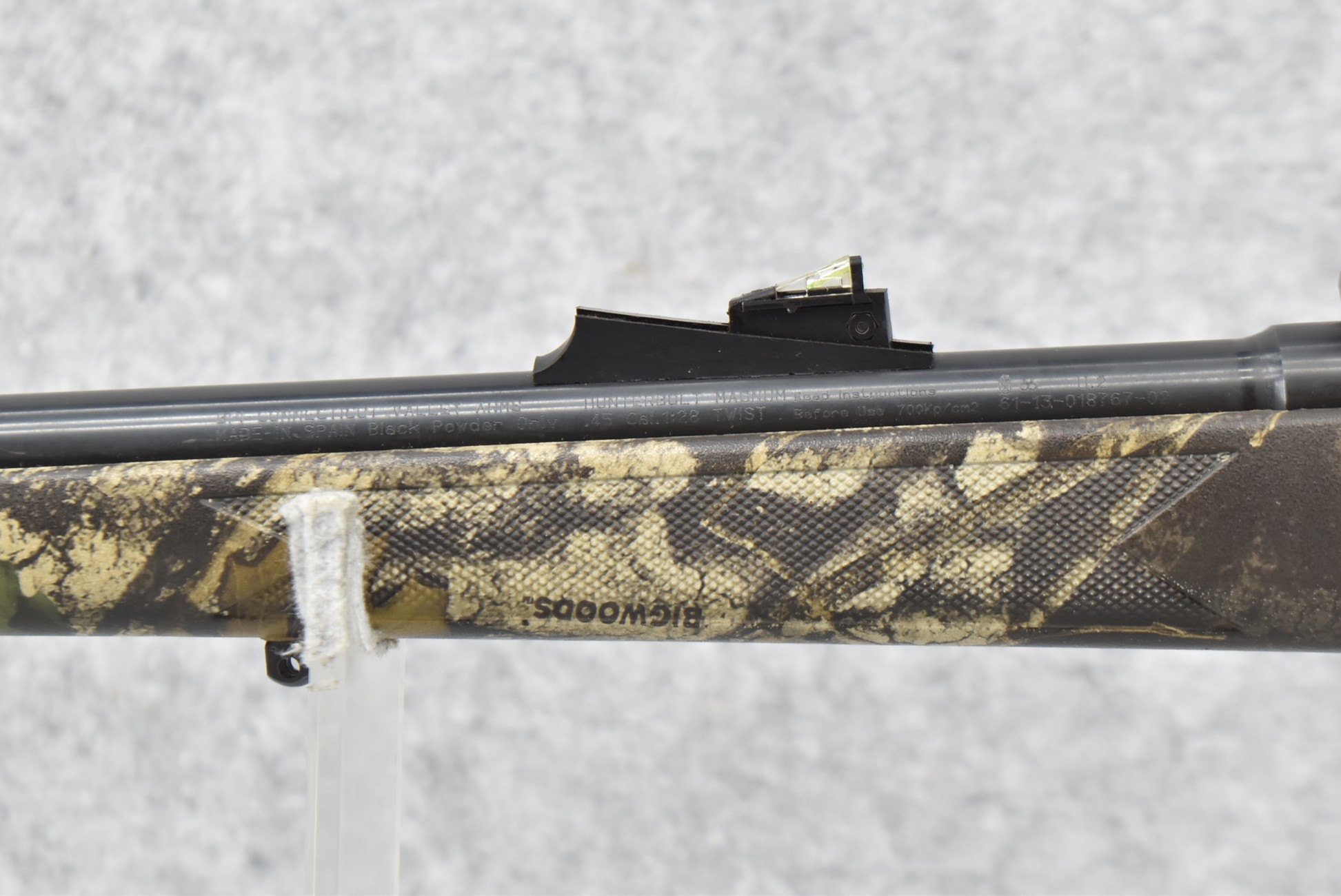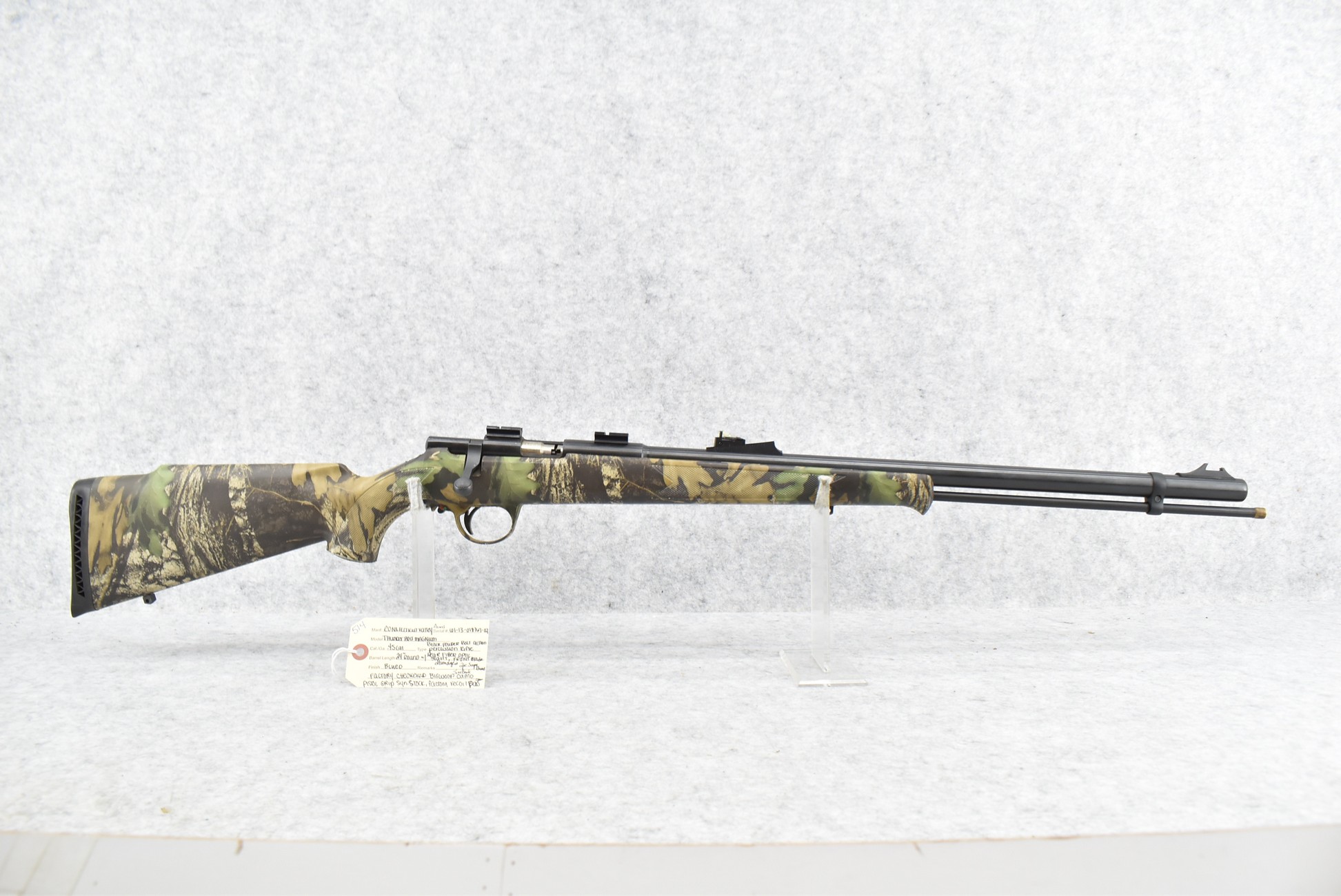514. Connecticut Valley Arms – Mod. Thunderbolt Magnum – 45 Cal. Black Powder Bolt Action Percussion Rifle – w/24” Round Barrel w/Damaged Blade Front Sight and Fiber Optic Rear Sight – Blued Finish – w/Factory Checkered Bigwood Tree Bark Camouflage Pistol Grip Synthetic Stock w/Factory Recoil Pad – w/2-Piece Scope Bases – w/Ramrod