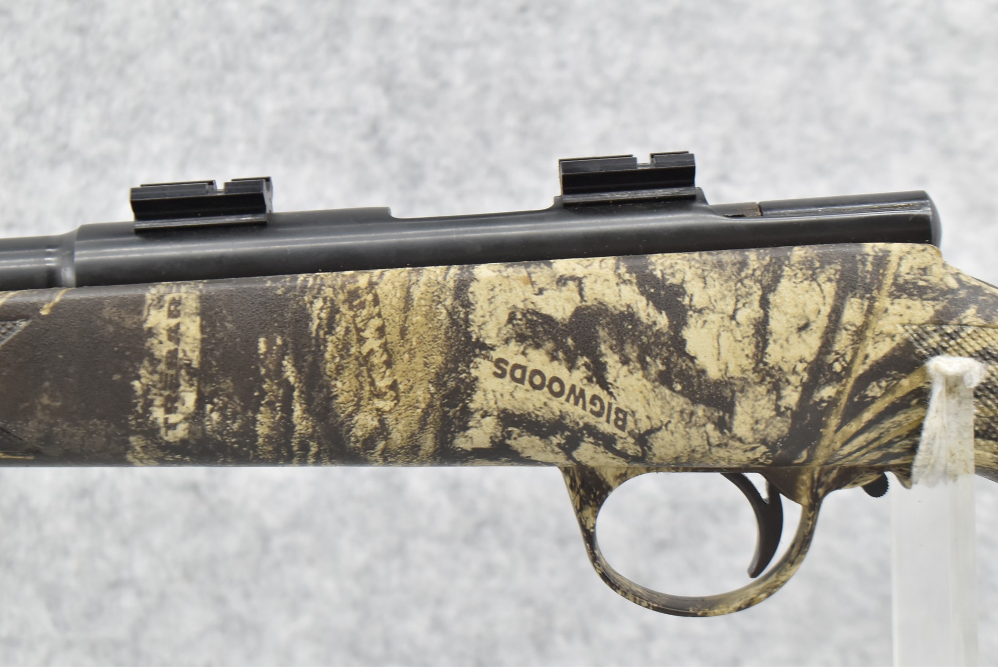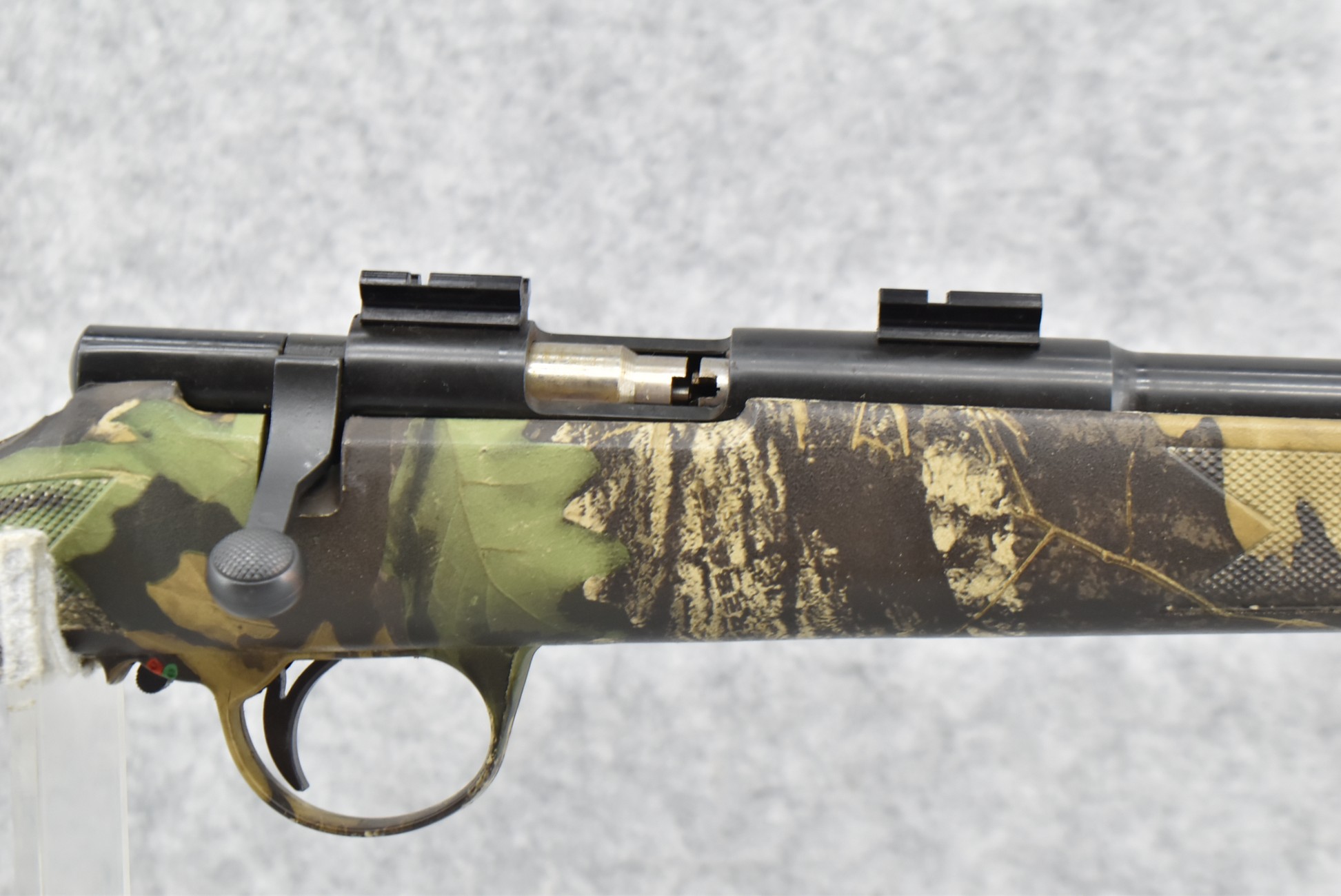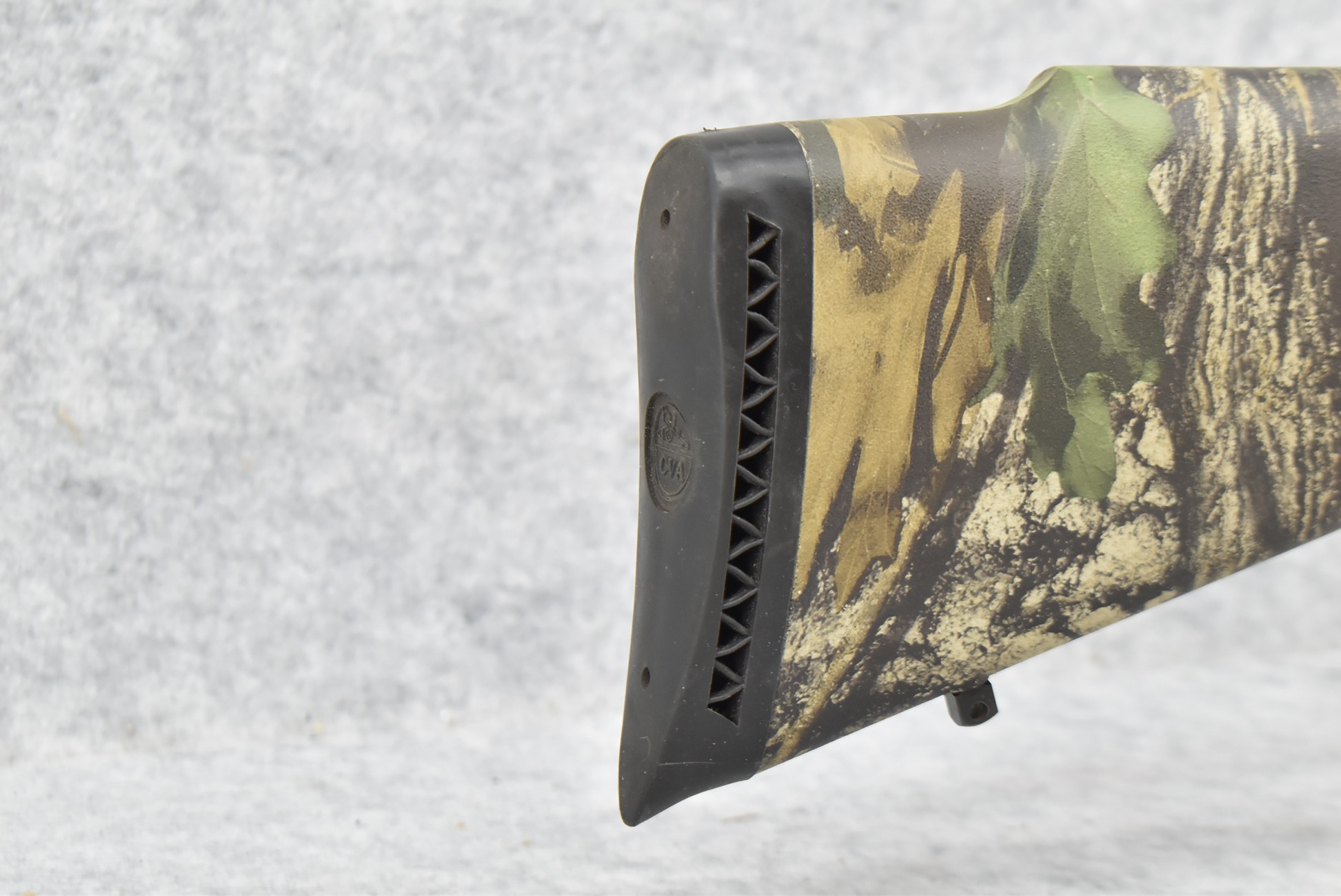 514. Connecticut Valley Arms – Mod. Thunderbolt Magnum – 45 Cal. Black Powder Bolt Action Percussion Rifle – w/24” Round Barrel w/Damaged Blade Front Sight and Fiber Optic Rear Sight – Blued Finish – w/Factory Checkered Bigwood Tree Bark Camouflage Pistol Grip Synthetic Stock w/Factory Recoil Pad – w/2-Piece Scope Bases – w/Ramrod