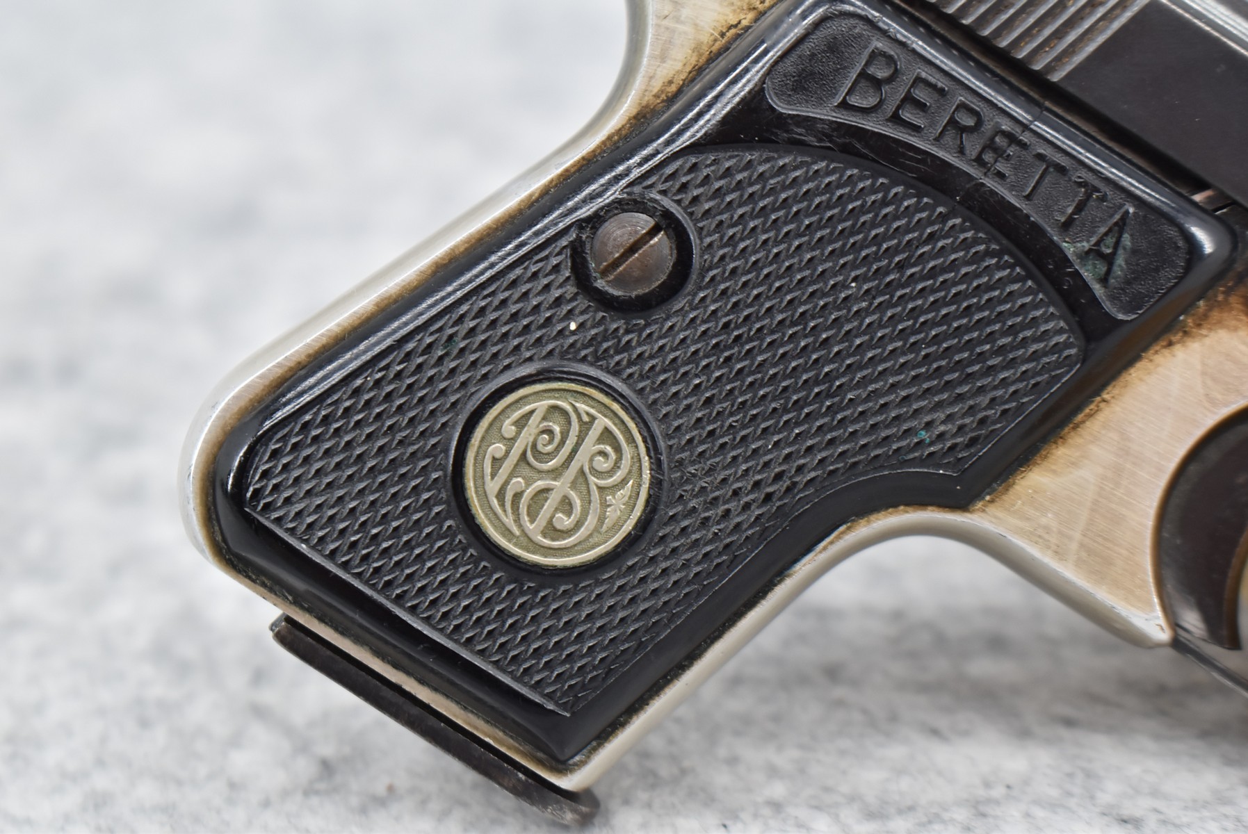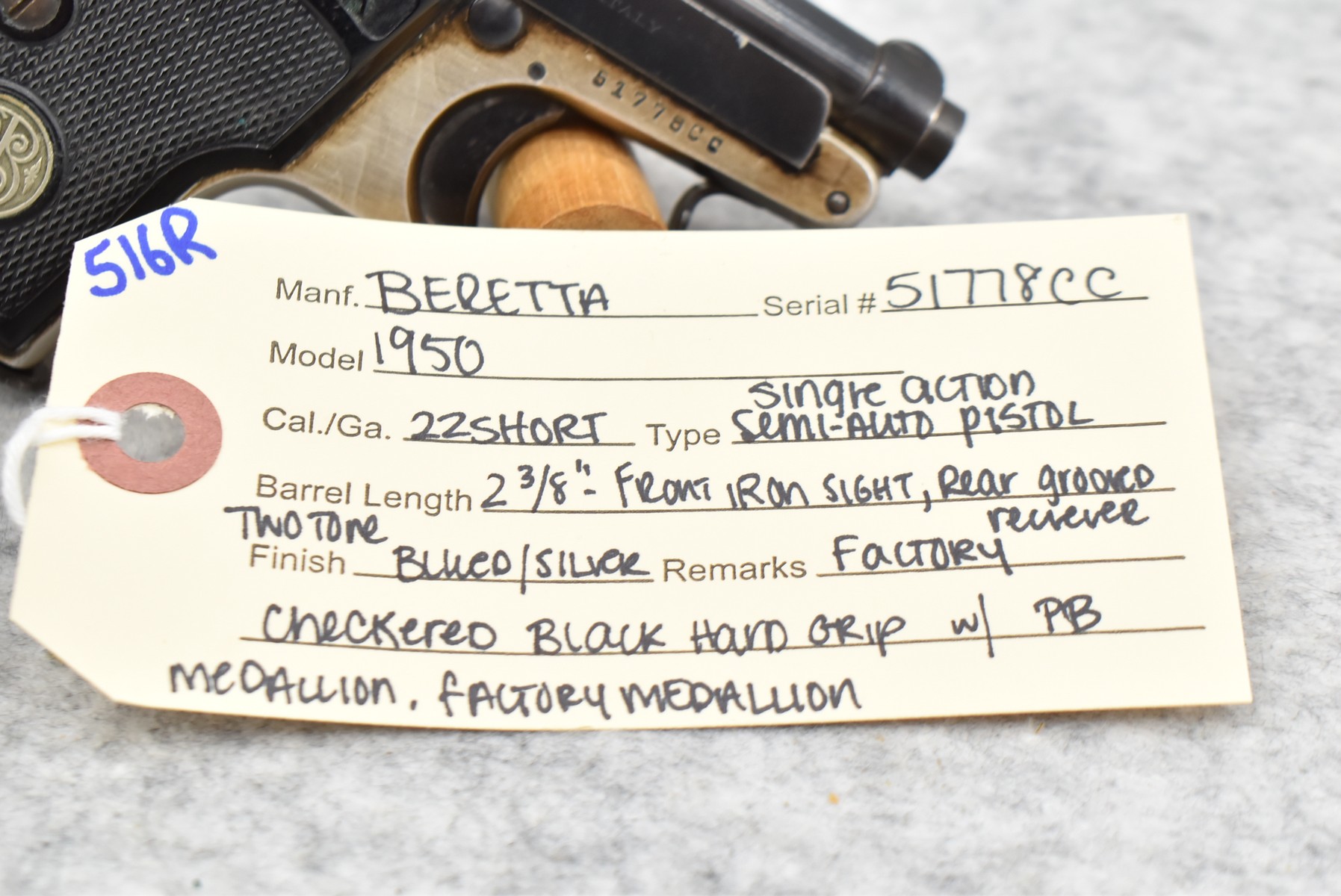 516R.     Beretta – Mod. 1950 – 22 Short Cal. Semi-Auto Pistol – w/2 3/8” Barrel w/Front Iron Sight & Rear Grooved Receiver Sight – Blued/Silver Two-Tone Finish – w/Factory Checkered Black Hard Grip – w/Clip