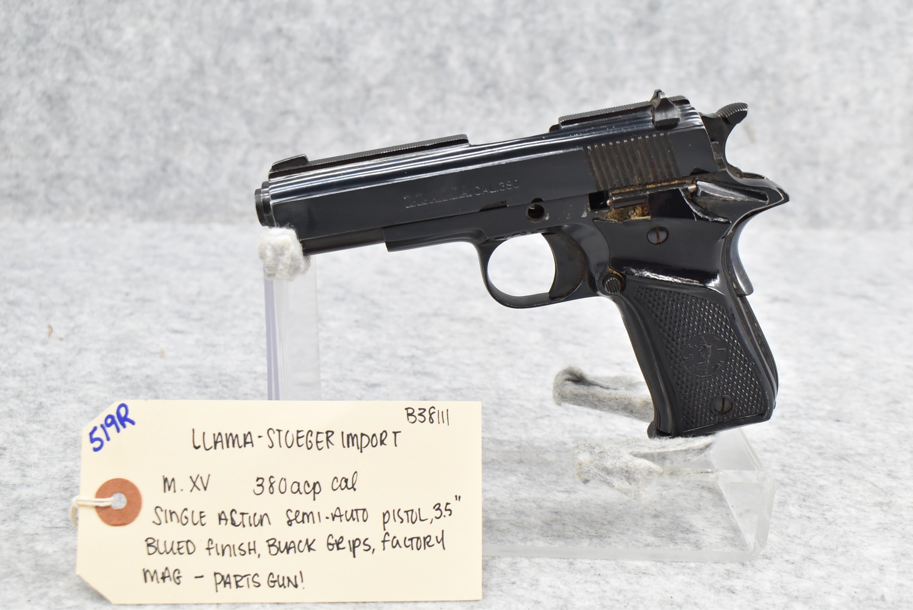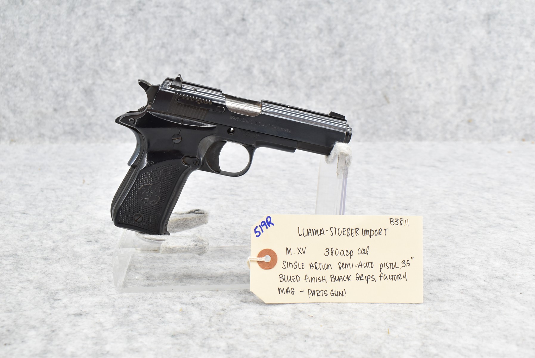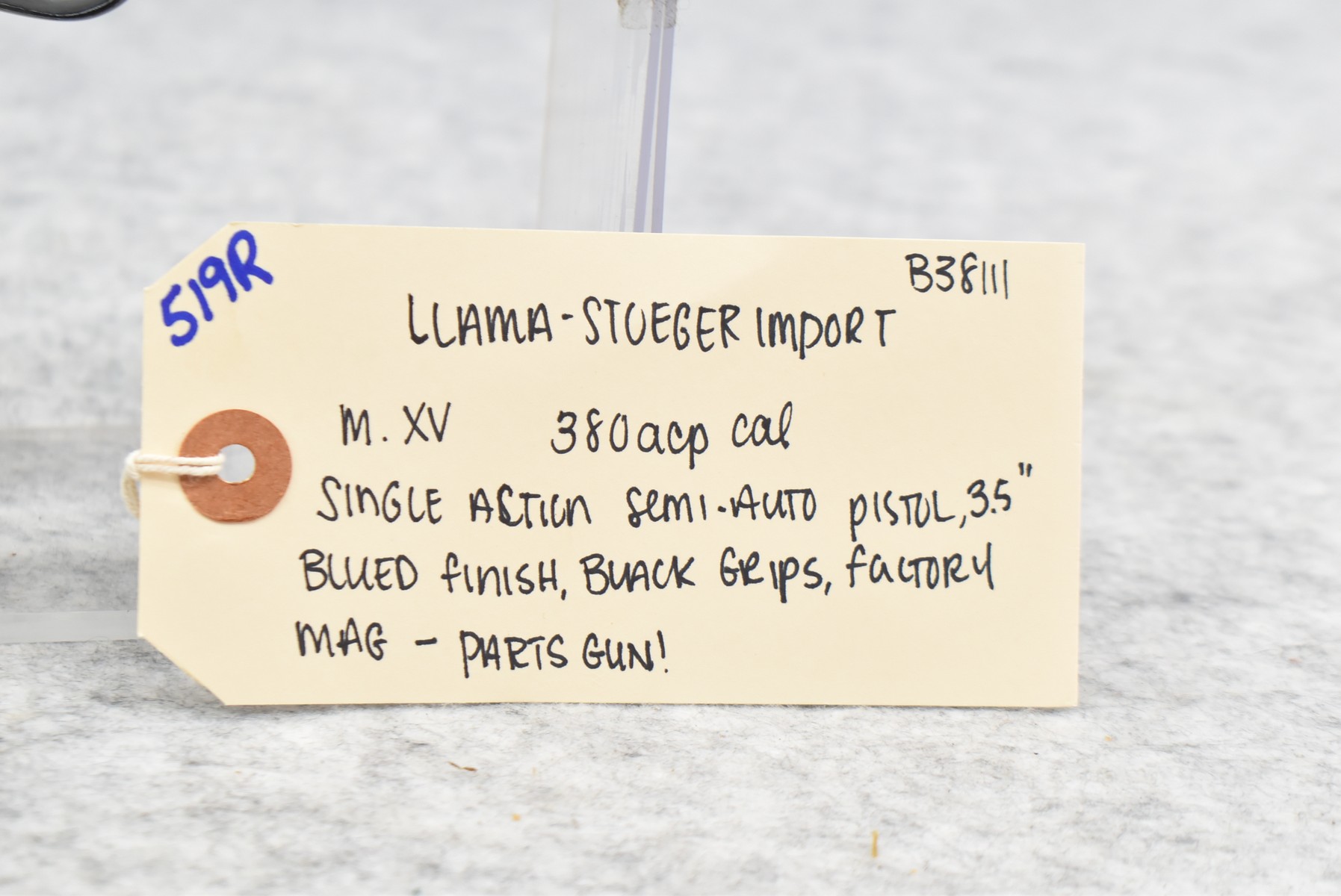 519R. Llama – Mod. XV – 380 ACP Cal. Semi-Auto Pistol – w/3.5” Barrel – Blued Finish – w/Black Grips – w/Factory Mag – PARTS GUN, Missing Parts!