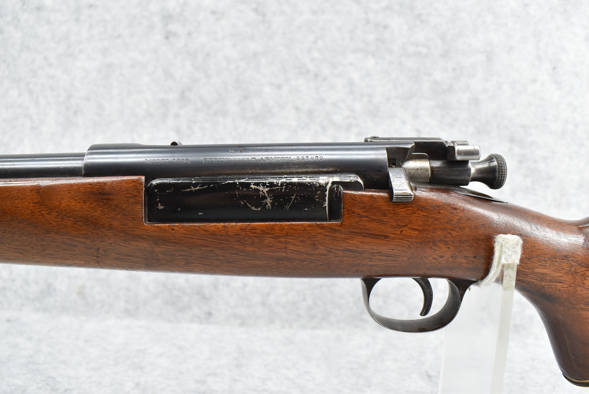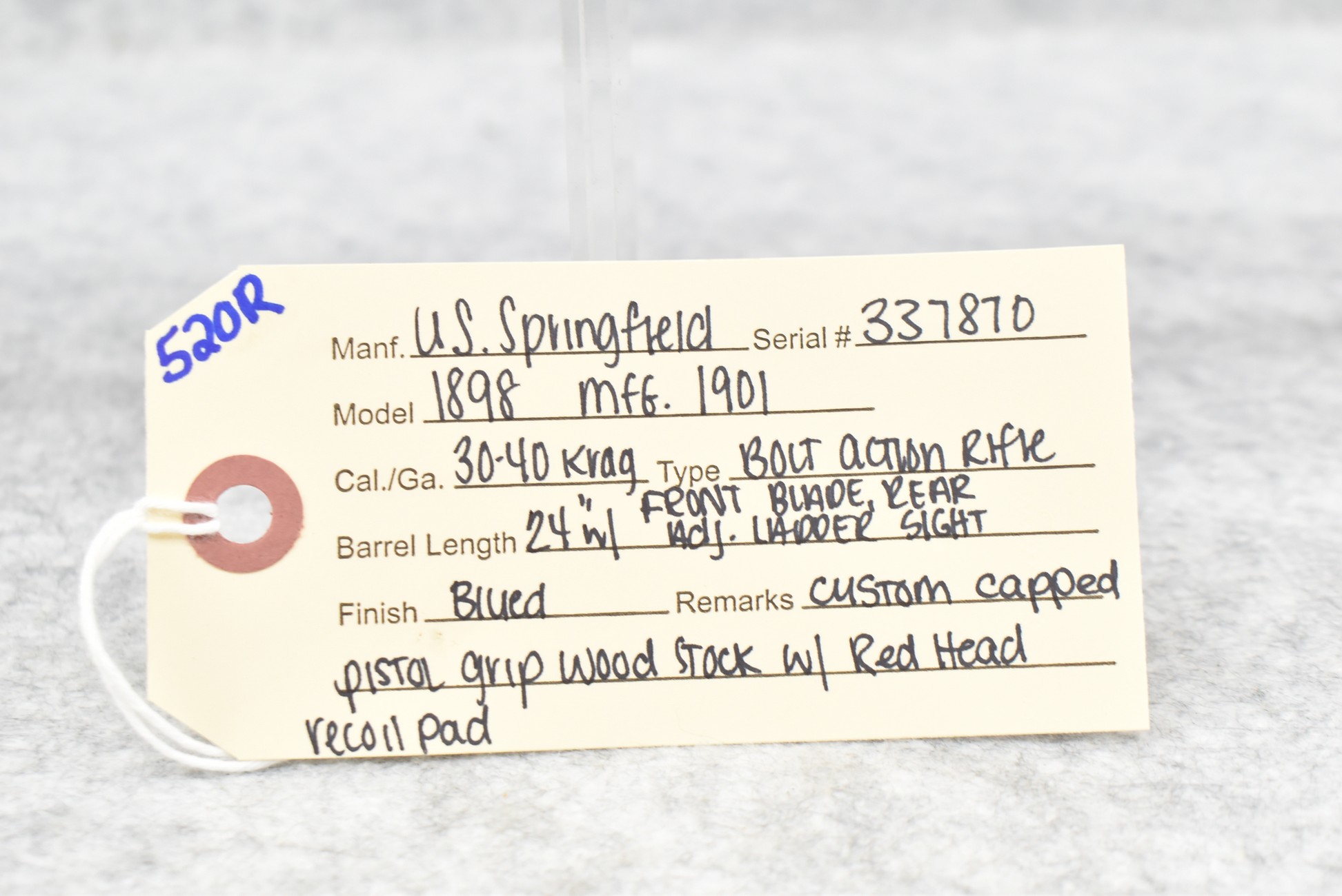 520R. U.S. Springfield – Mod. 1898 – 30-40 Krag Cal. Bolt Action Rifle – w/24” Barrel w/Front Blade & Rear Adj. Ladder Sights – Blued Finish – w/Custom Capped Pistol Grip Wood Stock w/Red Head Recoil Pad – Mfg. 1901