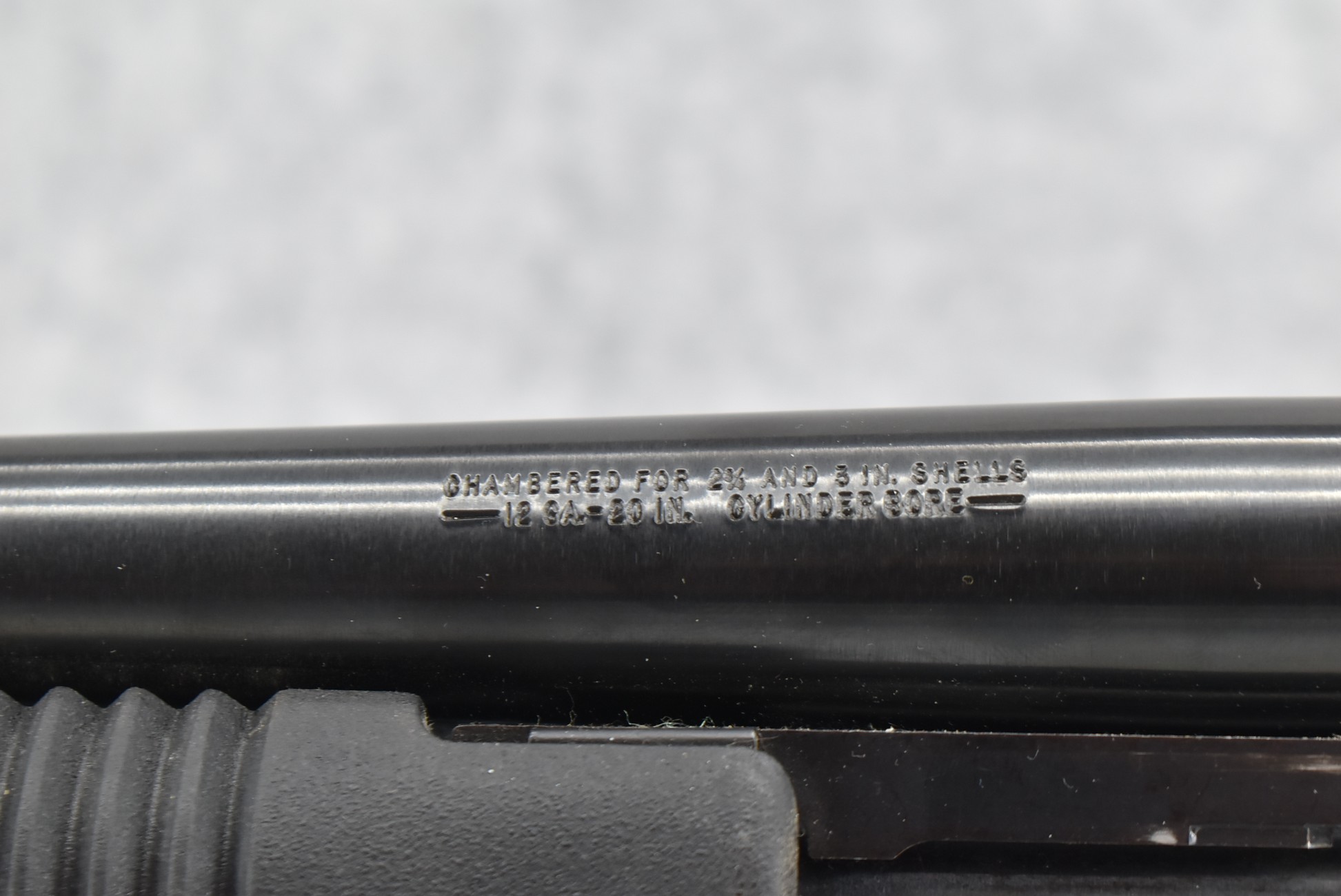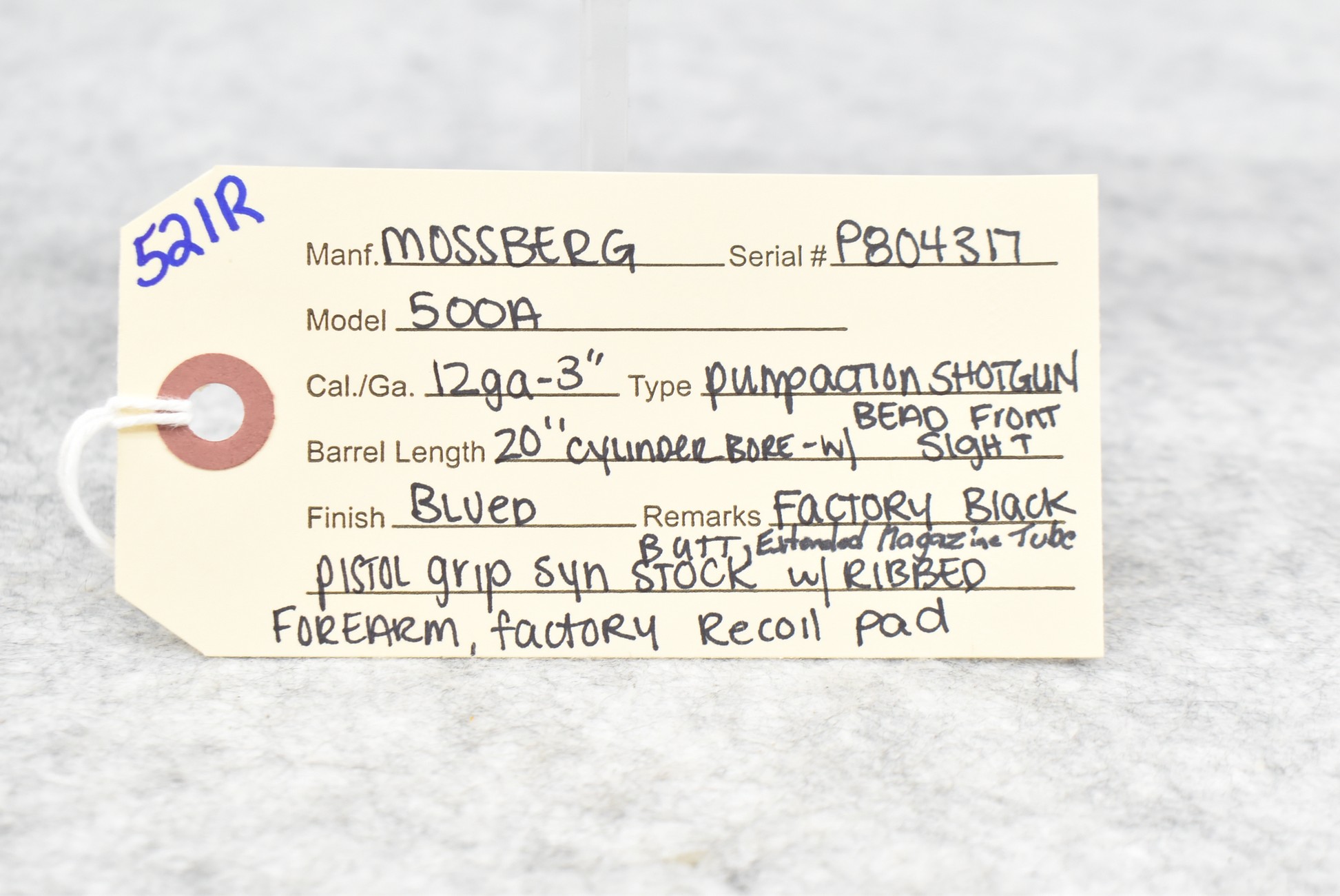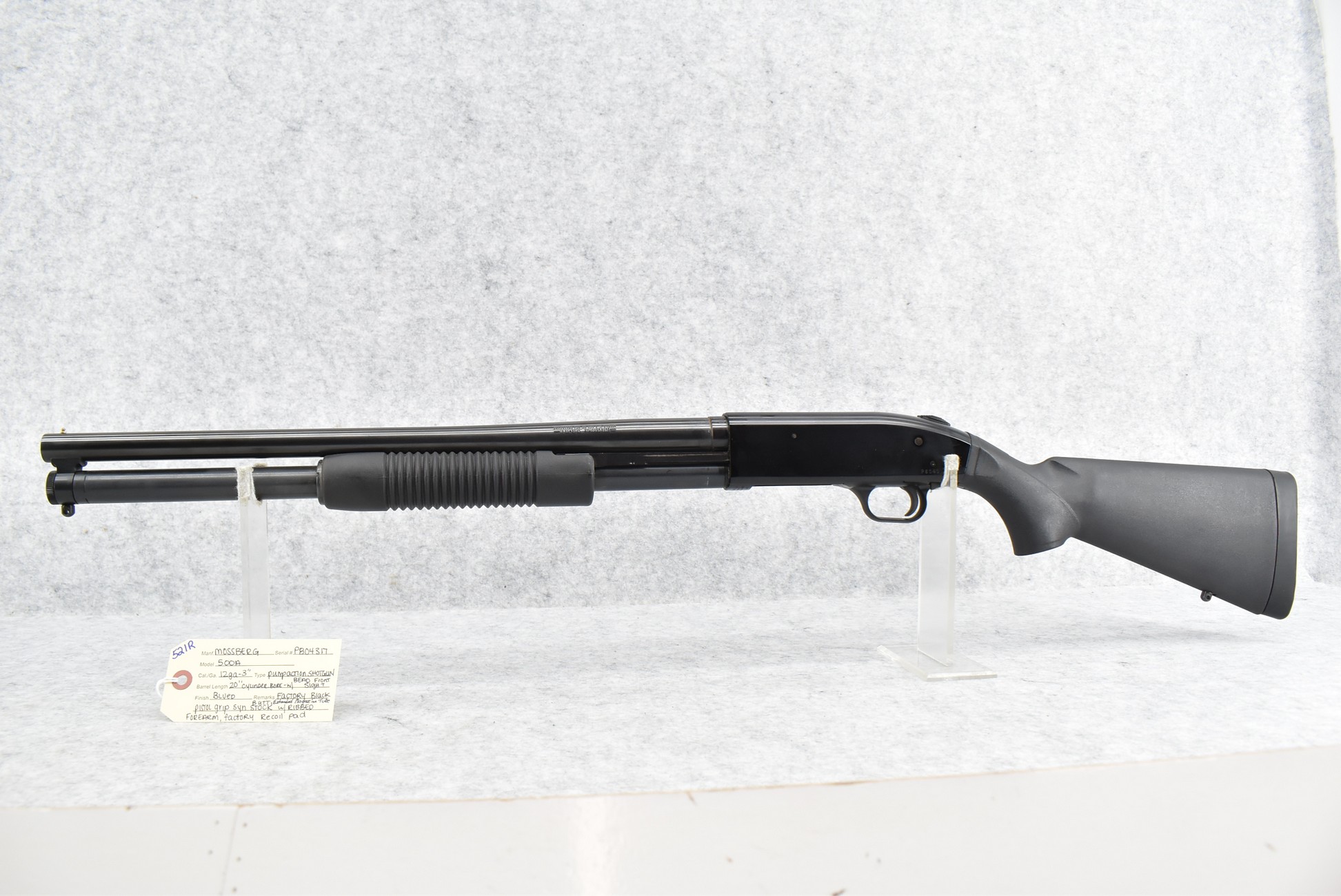 521R. Mossberg – Mod. 500 A – 12ga. 3” Pump Action Shotgun – w/20” Cyl. Choke Barrel w/Bead Front Sight & Extended Magazine Tube – Blued Finish – w/Factory Black Pistol Grip Synthetic Butt Stock w/Factory Recoil Pad & Ribbed Forearm