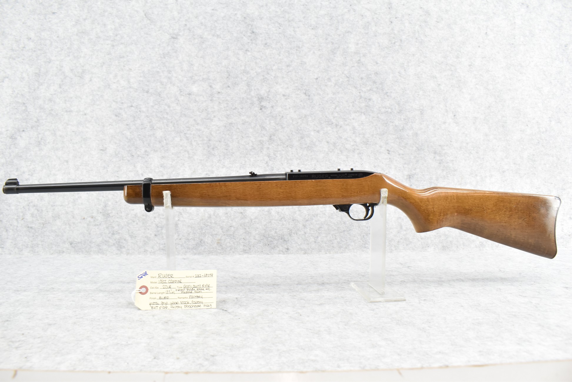 524R. Ruger – Mod. 10/22 Carbine – 22LR Cal. Semi-Auto Rifle – w/18.5” Barrel w/Front Blade & Rear Adj. Folding Sights – Blued Finish – w/Factory Pistol Grip Wood Stock w/Factory Butt Plate – w/Factory Detachable Mag