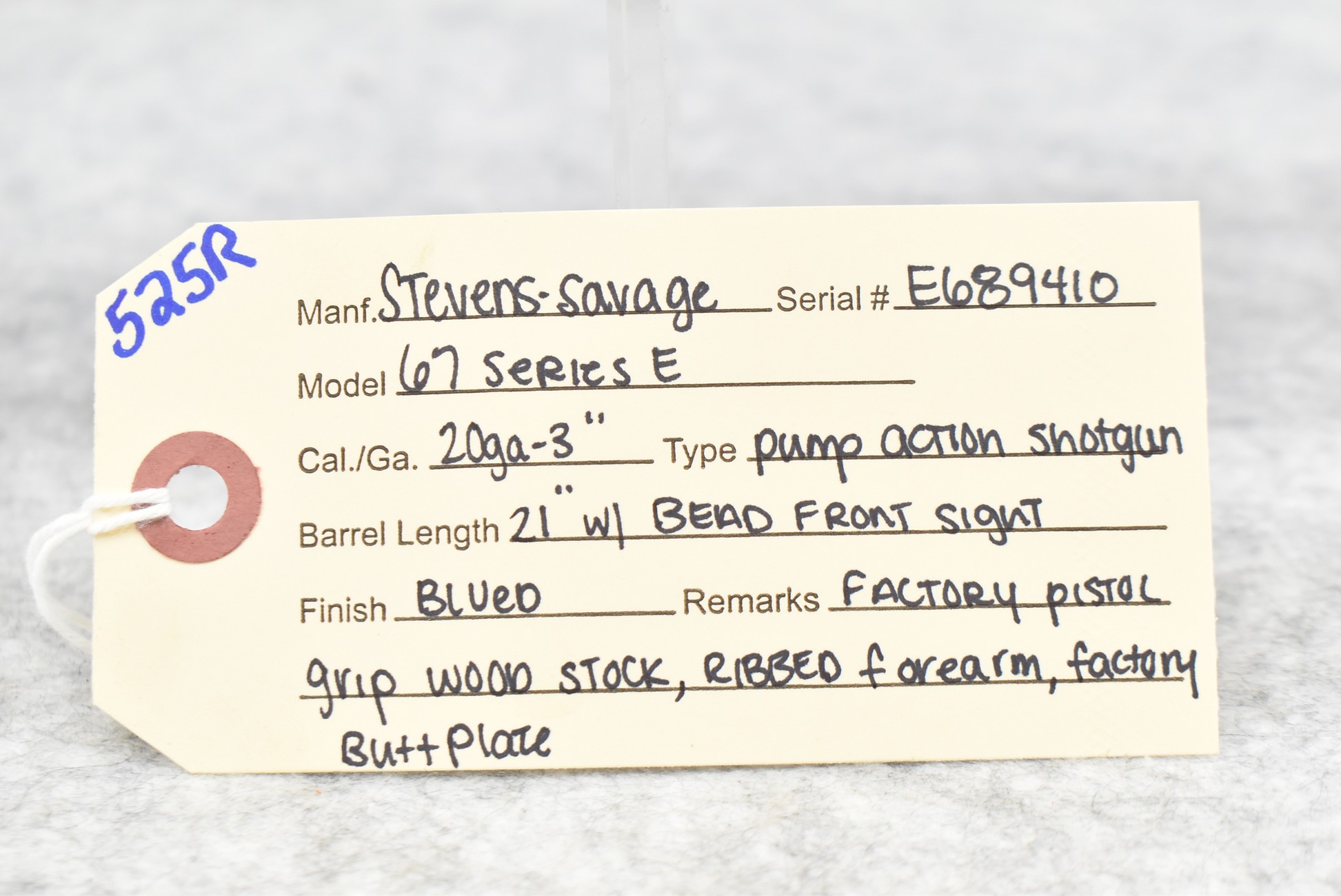525R. Stevens-Savage – Mod. 67 Series E – 20ga. 3” Pump Acton Shotgun – w/21” Barrel w/Bead Front Sight – Blued Finish – w/Factory Pistol Grip Wood Stock w/Factory Butt Plate & Ribbed Forearm