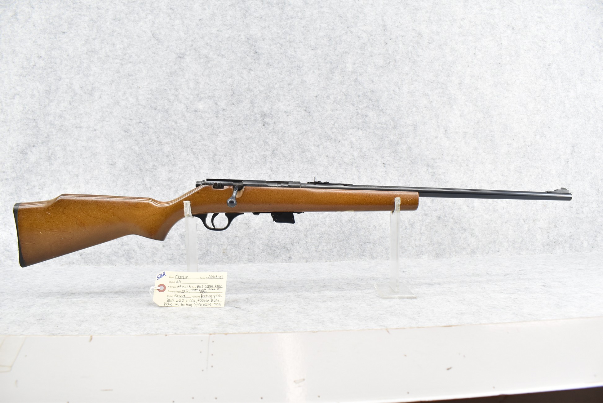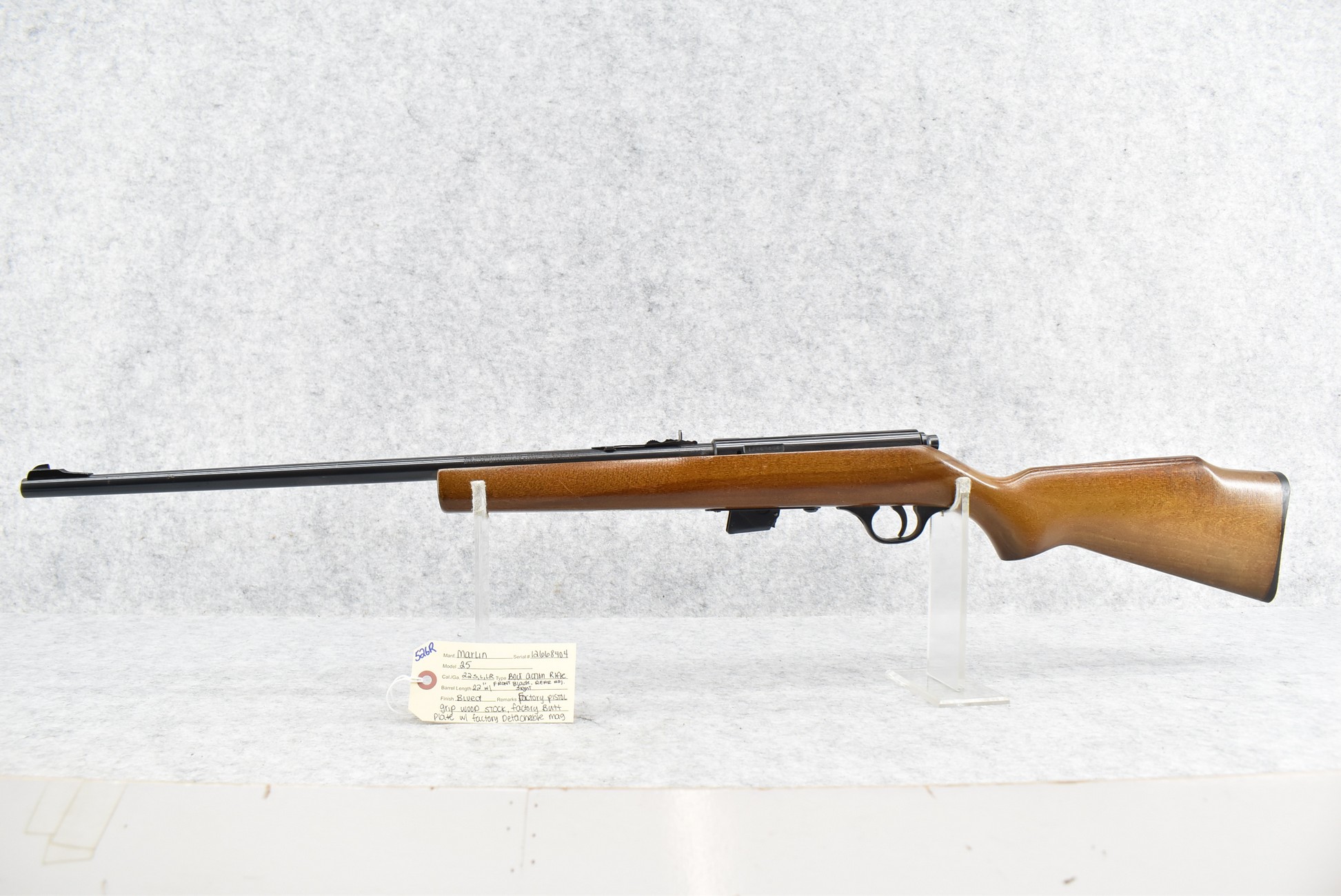 526R. Marlin – Mod. 25 – 22 Cal. Bolt Action Rifle – w/22” Barrel w/Front Blade & Rear Adj. Sights – Blued Finish – w/Factory Pistol Grip Wood Stock w/Factory Butt Plate – w/Factory Detachable Mag