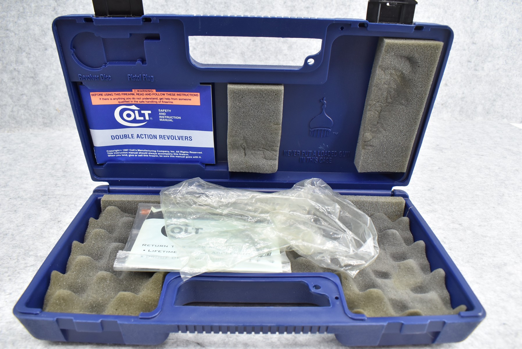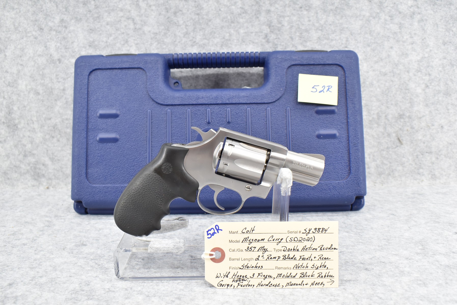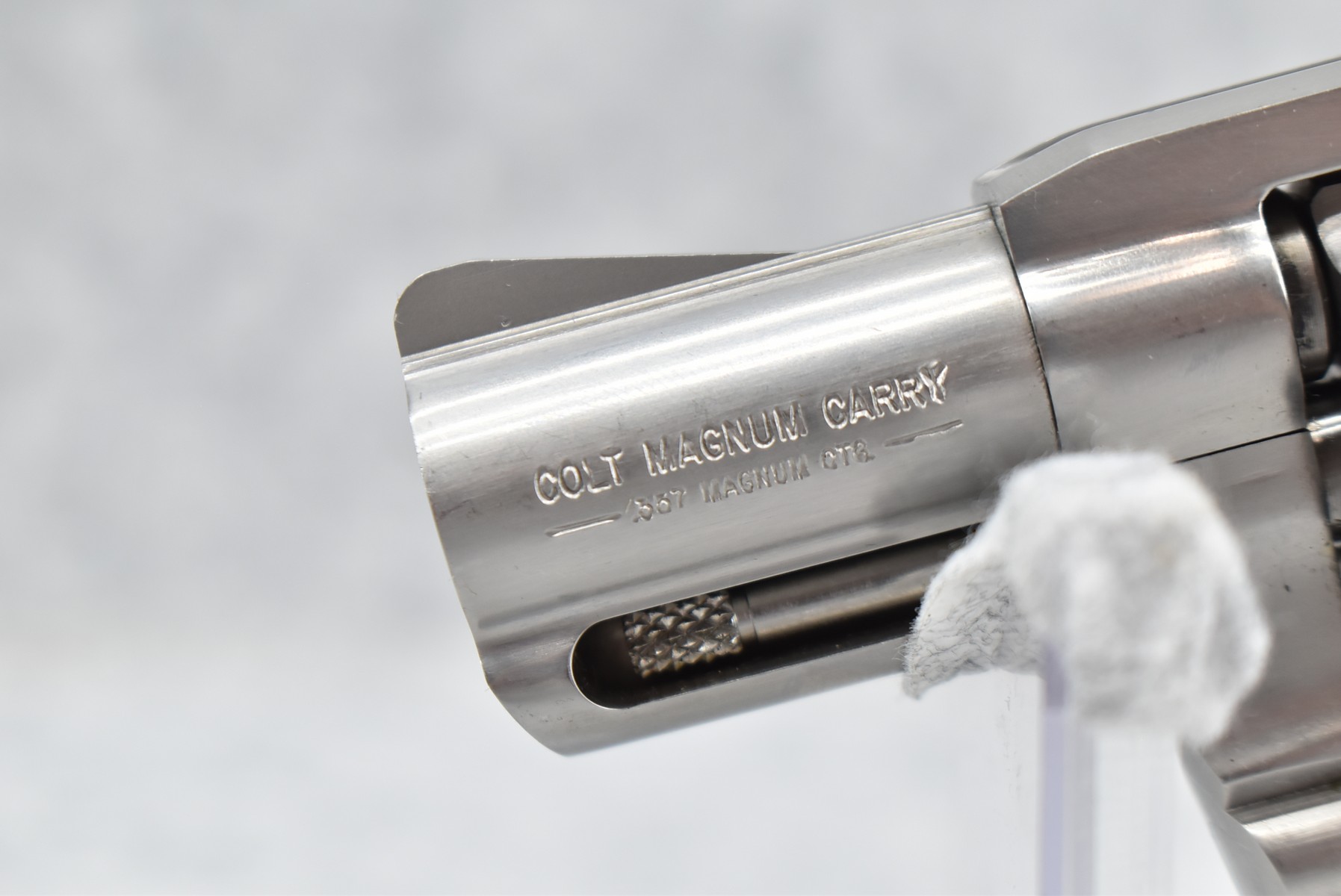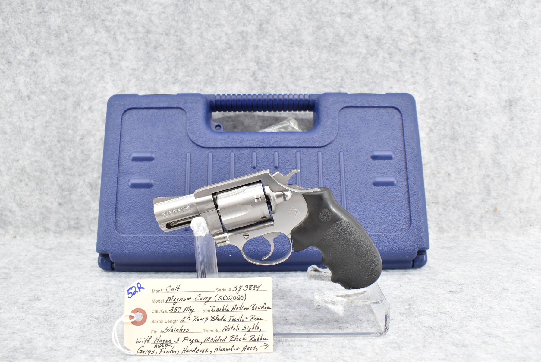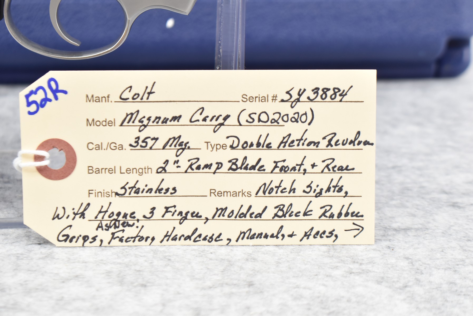 52R. Colt – Mod. Magnum Carry (SD2020) – 357 Mag. Cal. Double Action Revolver – w/2” Barrel w/Ramp Blade Front & Rear Notch Sights – Stainless Finish – w/Hogue 3-Finger Molded Black Rubber Grips – As New w/Factory Hard Case, Manual & Accessories – Mfg. 1999 Only! Research Shows as Little as 2,000 Made!