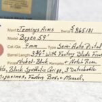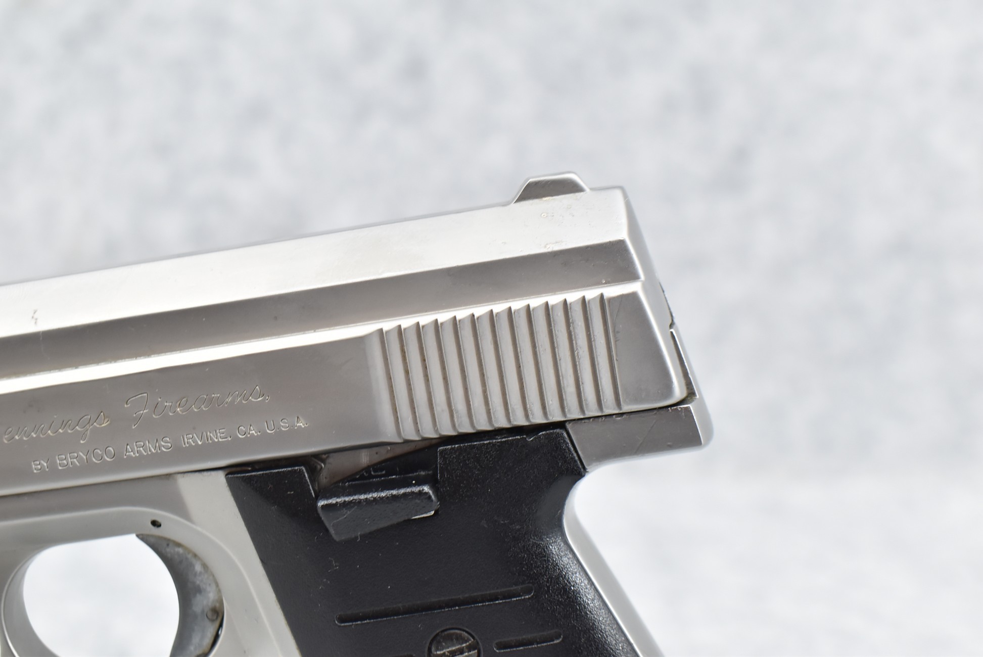 531R. Jennings Arms – Mod. Bryco 59 – 9mm Cal. Semi-Auto Pistol – w/3 ¾” Barrel w/Factory Blade Front & Notch Rear Sights – Nickel Finish – w/Black Synthetic Grips – w/3 Detachable Magazines – w/Factory Box & Manual (CANNOT GO TO MARYLAND!)