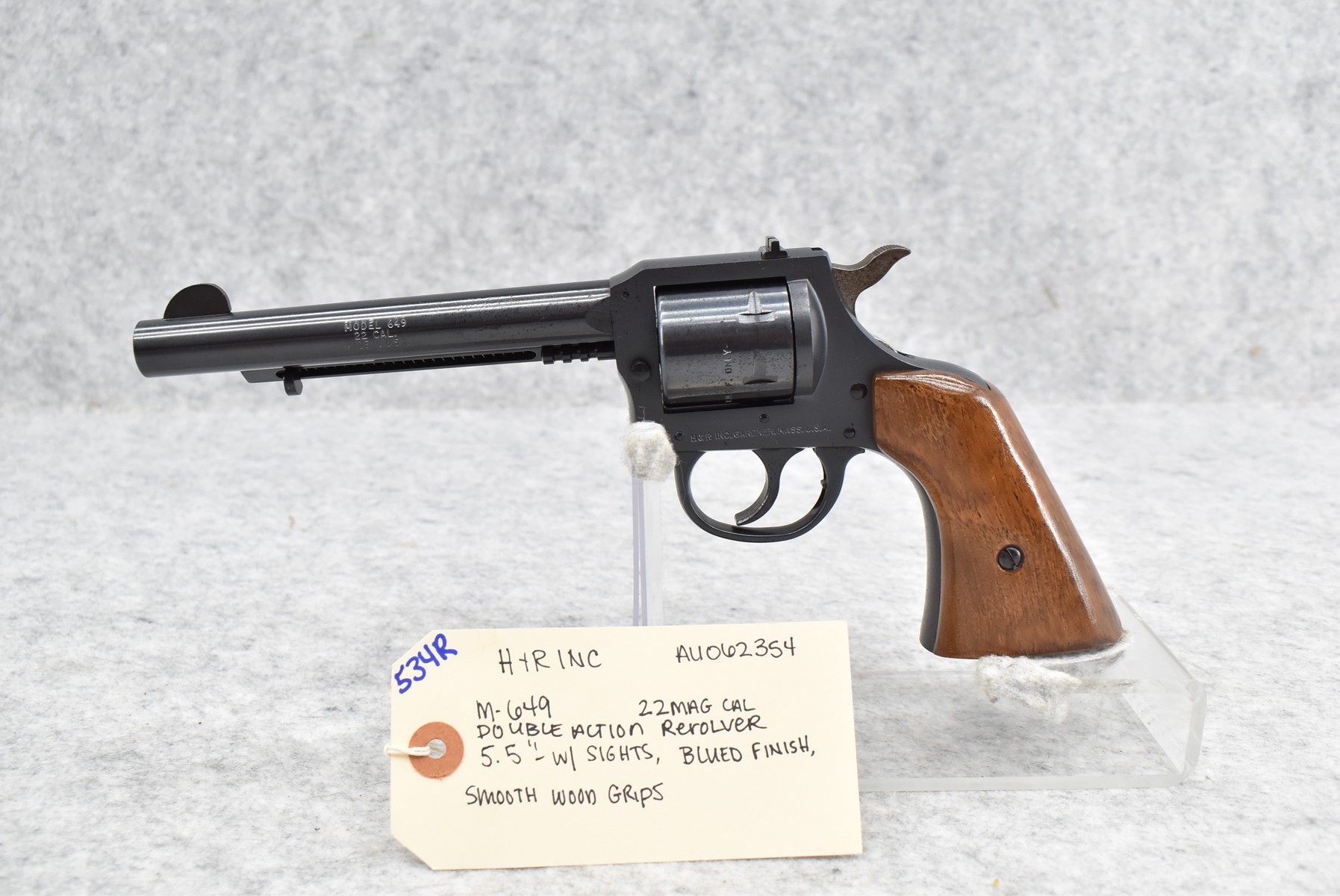 534R. H. & R. Inc. – Mod. 649 – 22 Win Mag. Cal. Double Action Revolver – w/5.5” Barrel w/Sights – Blued Finish – w/Smooth Wood Grips