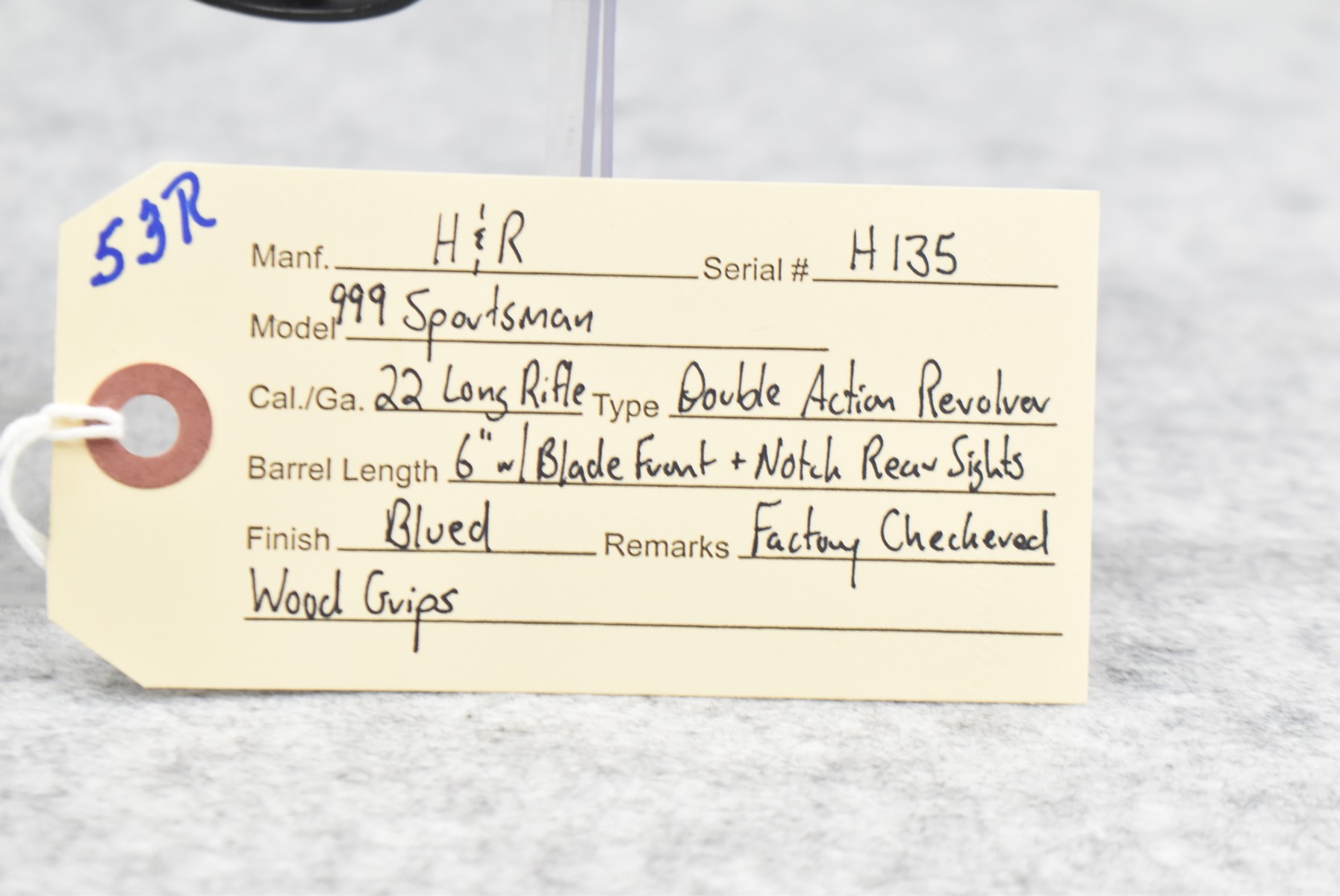 53R. H. & R. Mod. 999 Sportsman – 22 Long Rifle Cal. Double Action Revolver – w/6” Barrel w/Blade Front & Notch Rear Sights – Blued Finish – w/Factory Checkered Wood Grips
