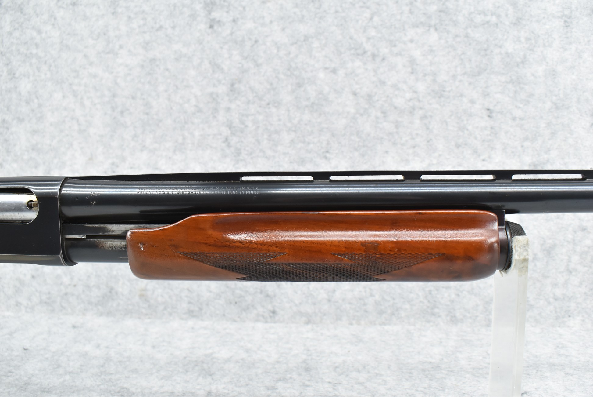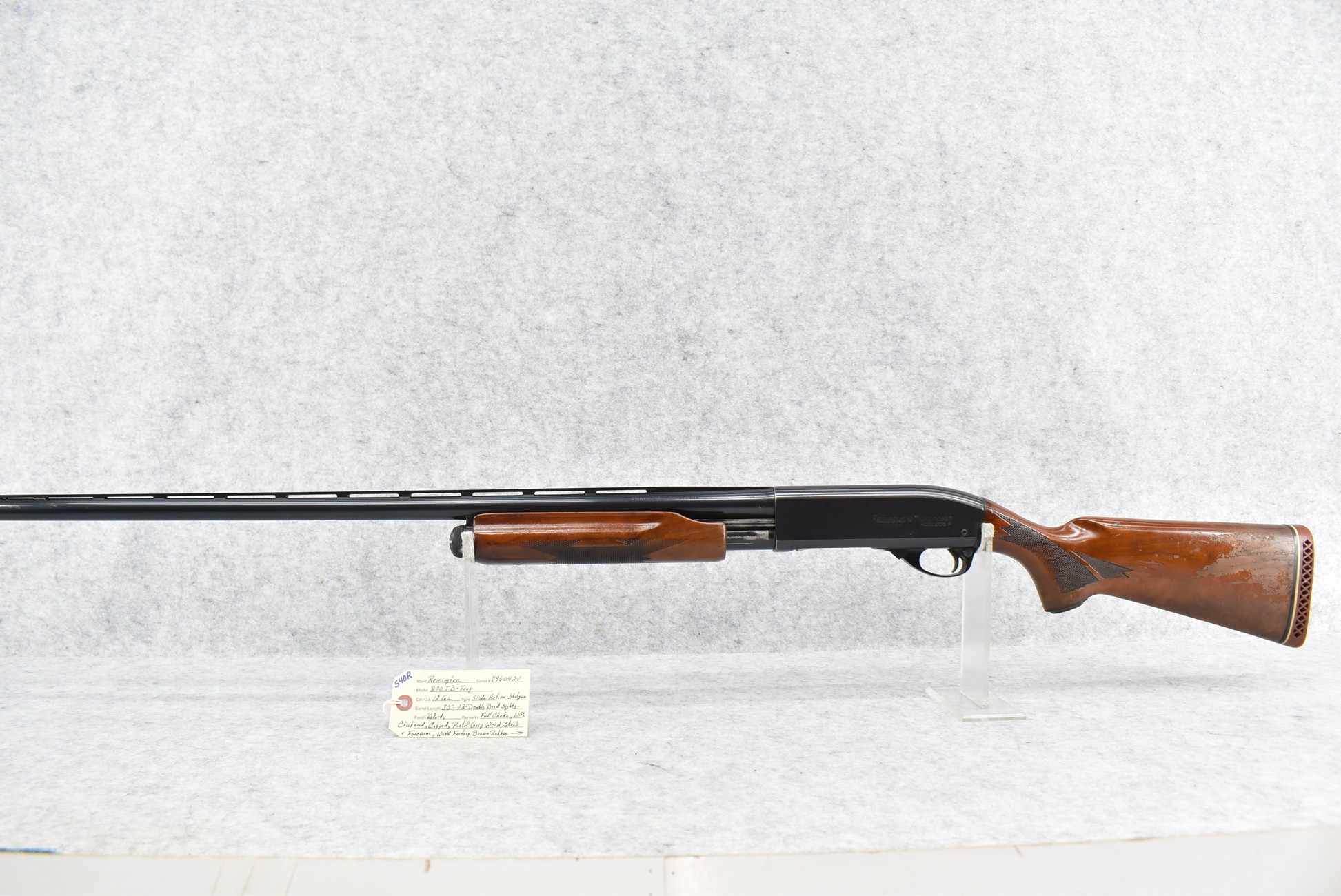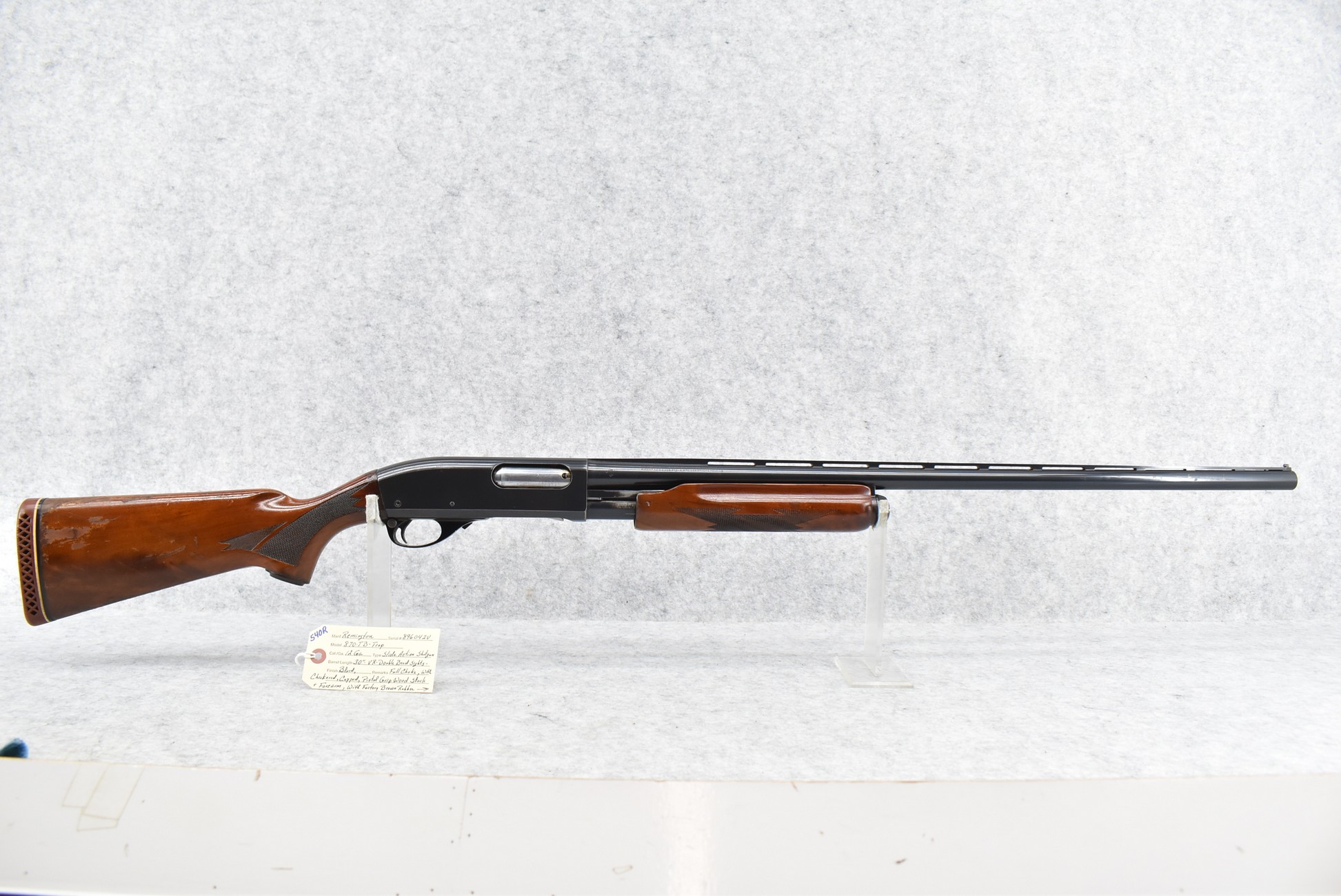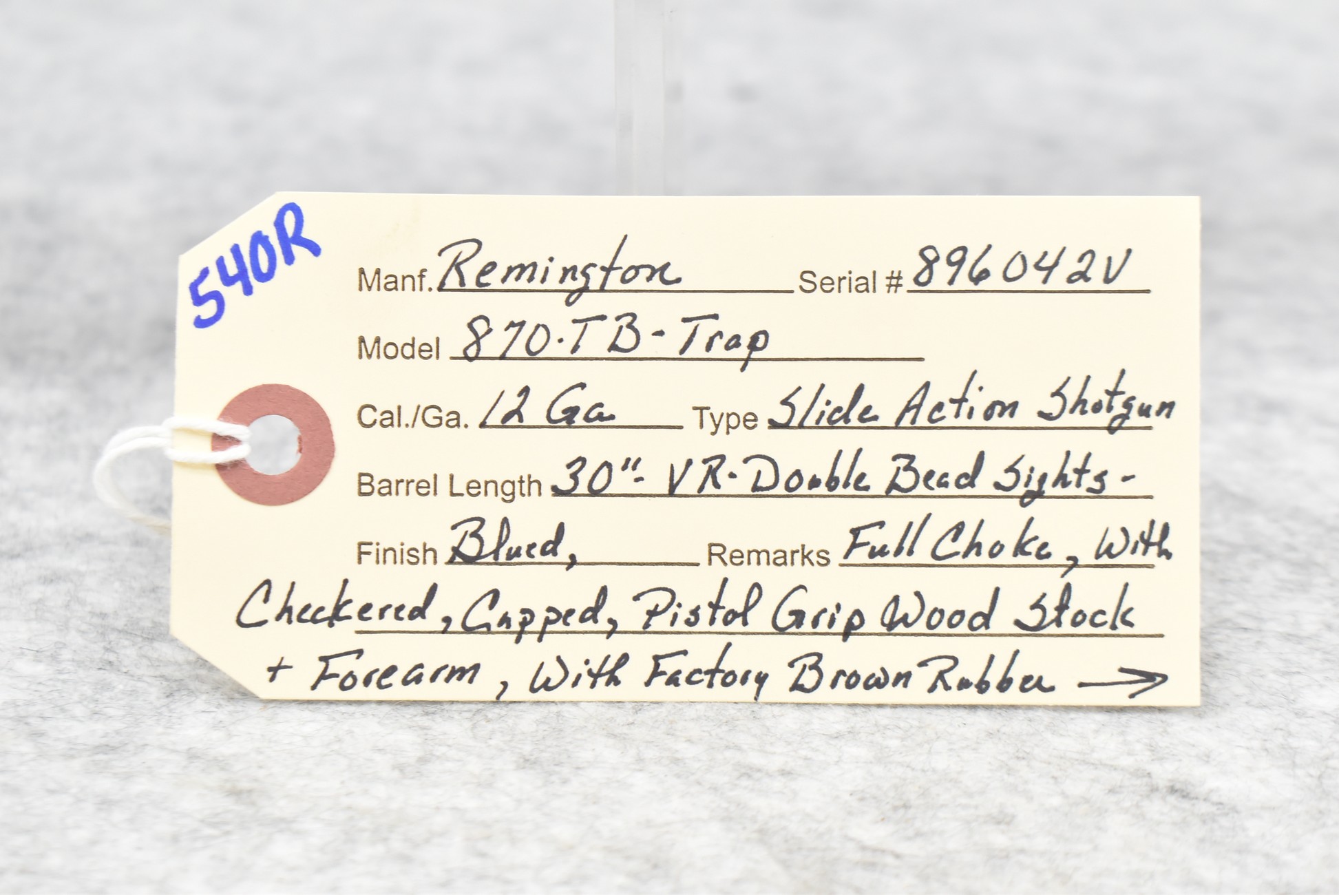 540R. Remington – Mod. 870-TB-Trap – 12ga. Pump Action Shotgun – w/30” Full Choke, Vent-Rib Barrel w/Double Bead Sights – Blued Finish – w/Weighted Checked Capped Pistol Grip Wood Stocks w/Factory Butt Pad – Gun Weighs 8lbs, 10oz.