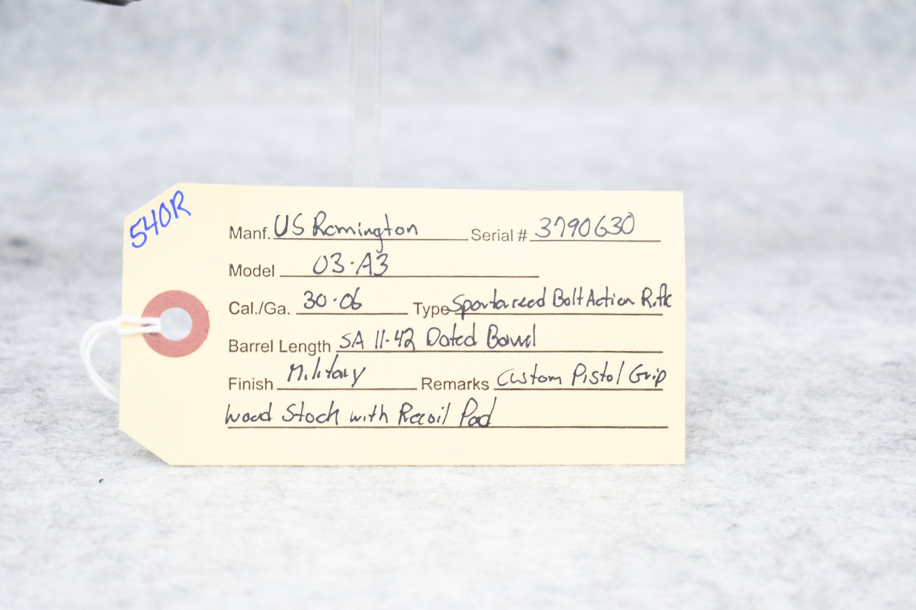 540R. U.S. Remington – Mod. 03-A3 – 30-06 Cal. Sporterized Bolt Action Rifle – w/24” SA 11-42 Dated Barrel – Military Finish – w/Custom Pistol Grip Wood Stock w/Recoil Pad