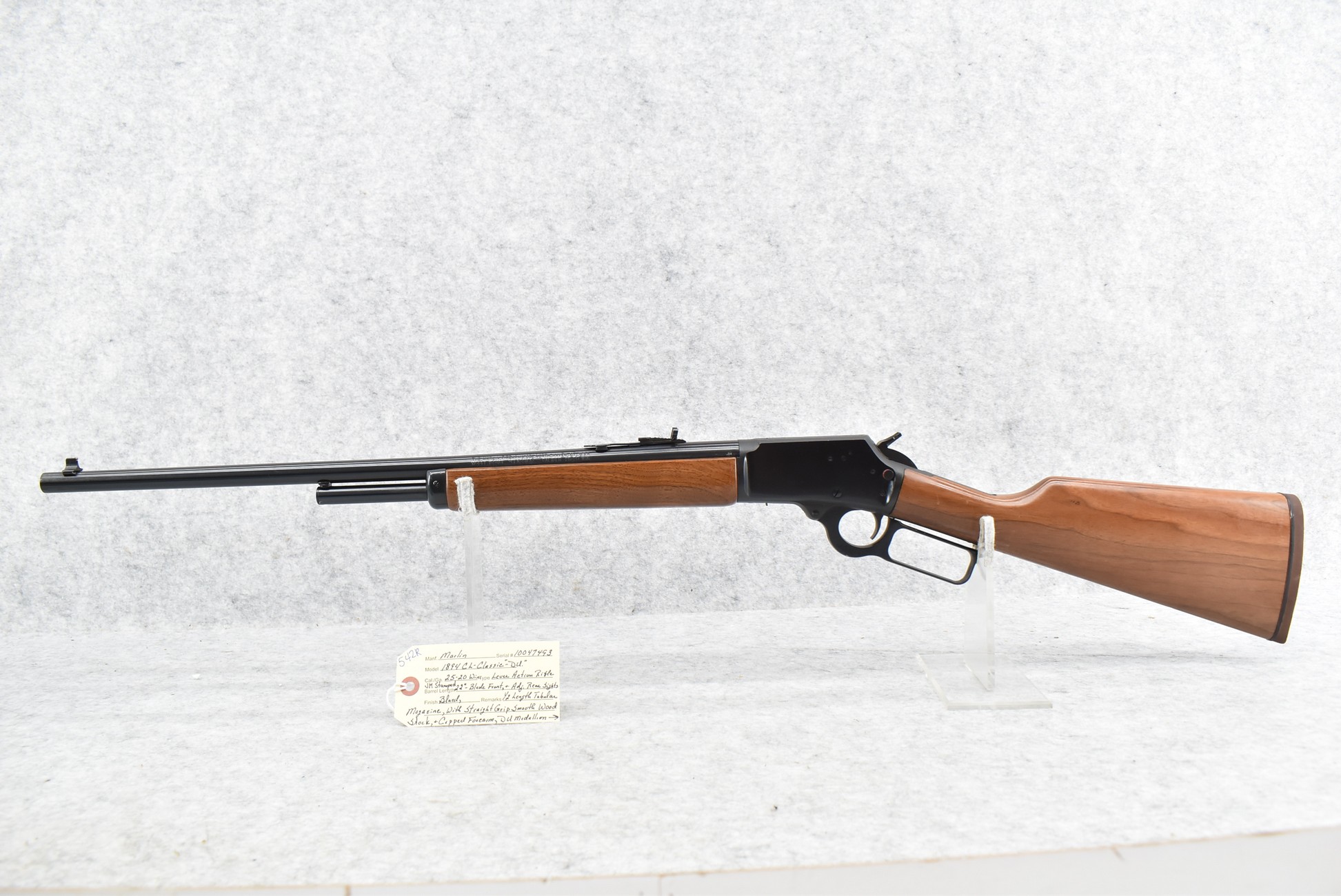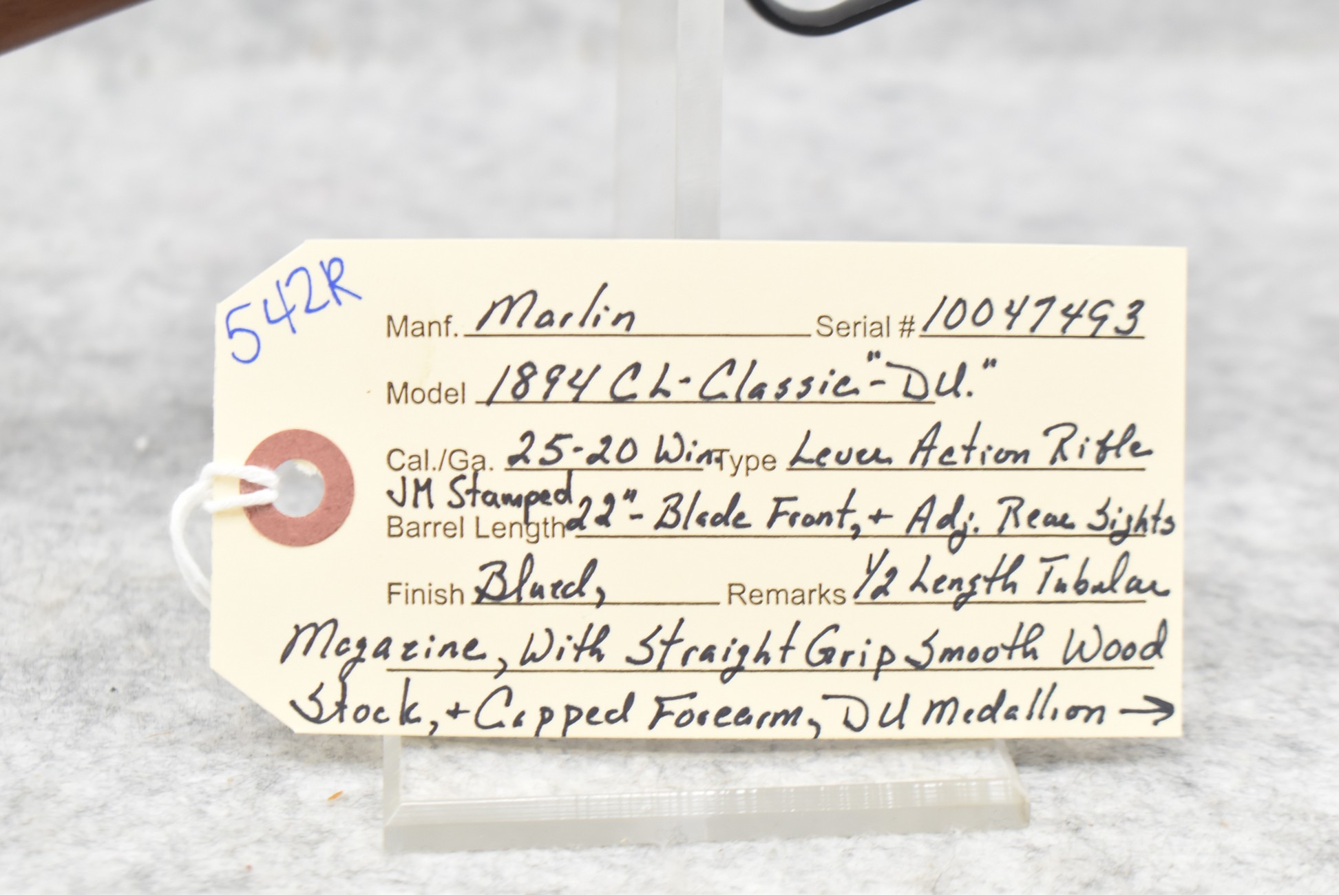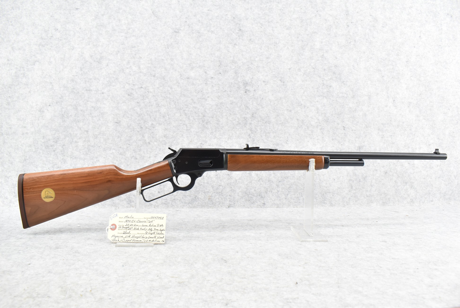 542R. Marlin – Mod. 1894 CL-Classic “DU” – 25-20 Win. Cal. Lever Action Rifle – w/22” JM Stamped Barrel w/Blade Front & Adj. Rear Sights w/Half Length Tubular Magazine – Blued Finish – w/Straight Grip Smooth Wood Stock & Capped Forearm w/DU Medallion Inlaid on Right Side of Butt Stock w/Factory Butt Pad