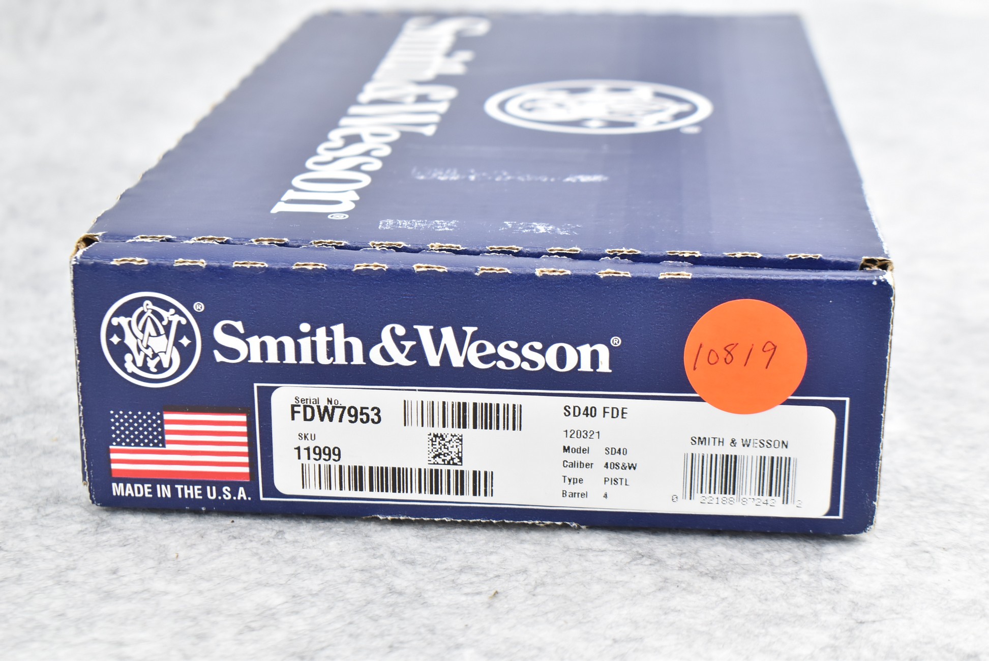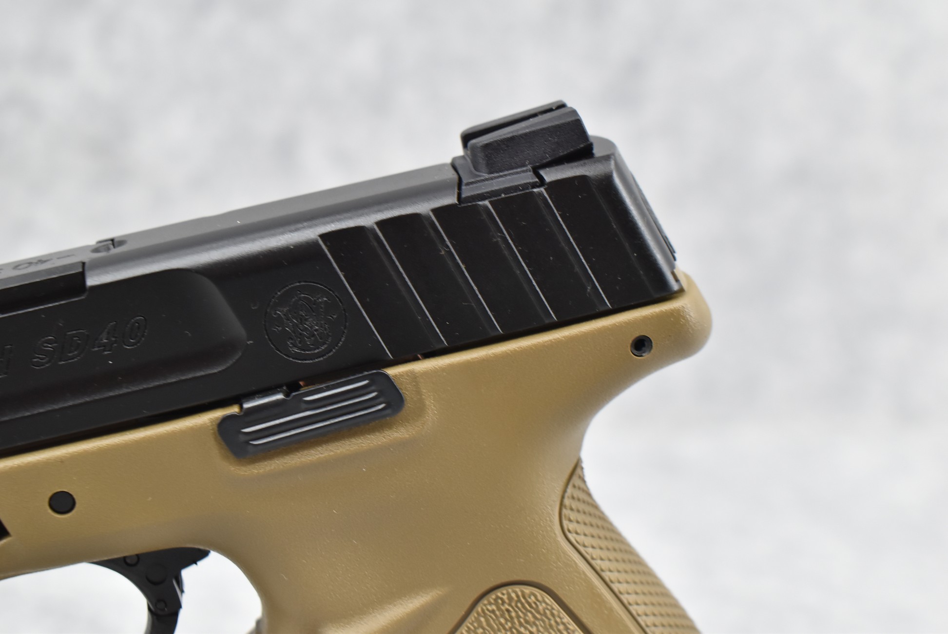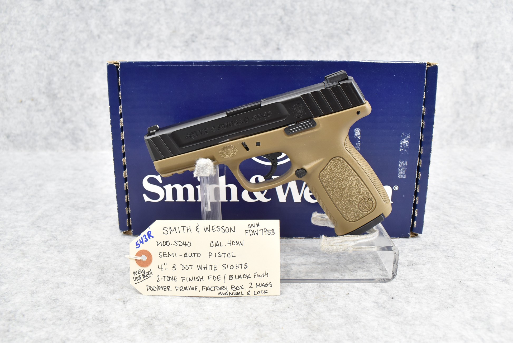 543R. Smith & Wesson – Mod. SD40 – 40 S&W Cal. Semi-Auto Pistol – w/4” Barrel w/3-Dot White Sights – FDE/Black Two-Tone Finish – w/Polymer Frame – New & Unfired w/Factory Box, 2 Mags & Manual