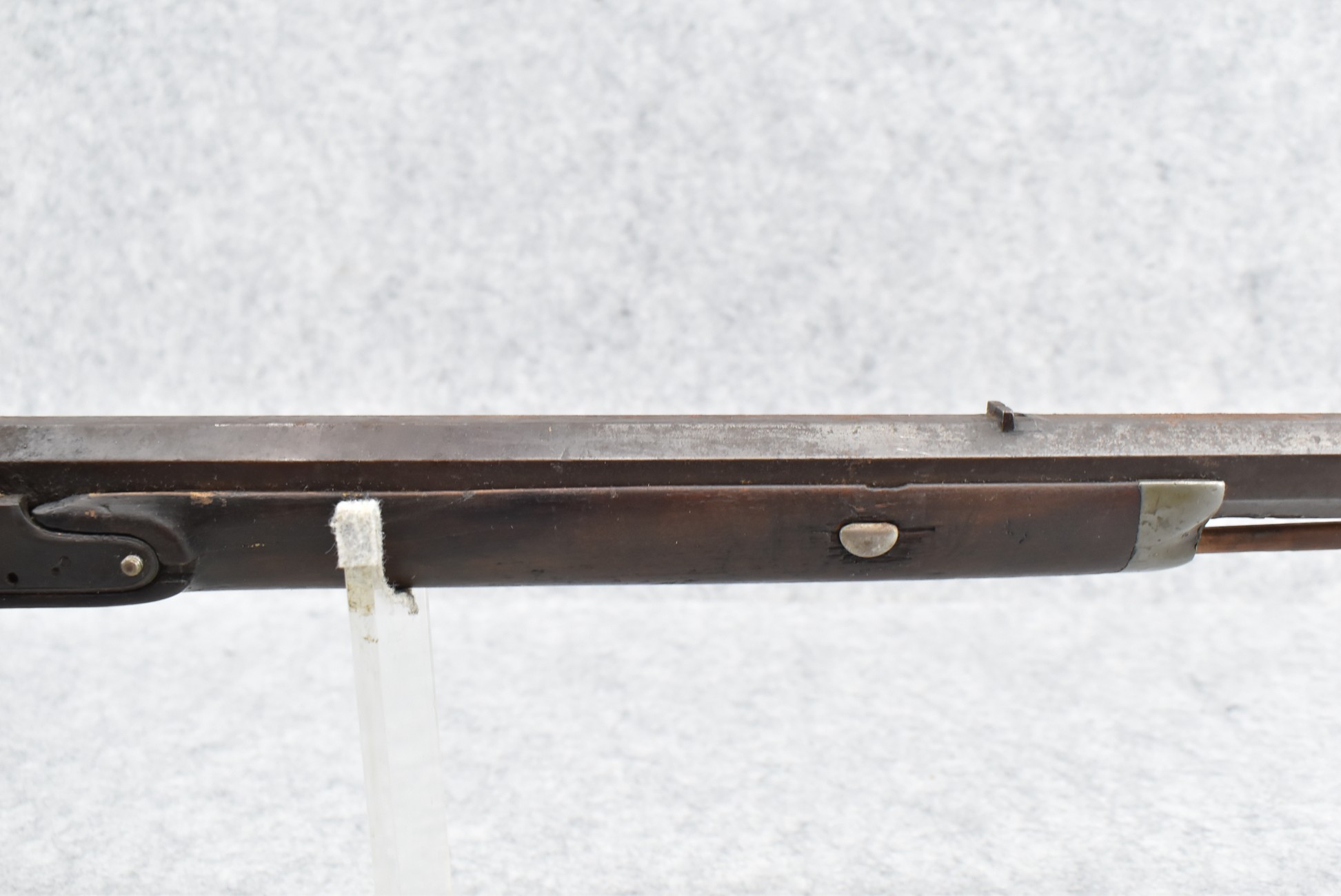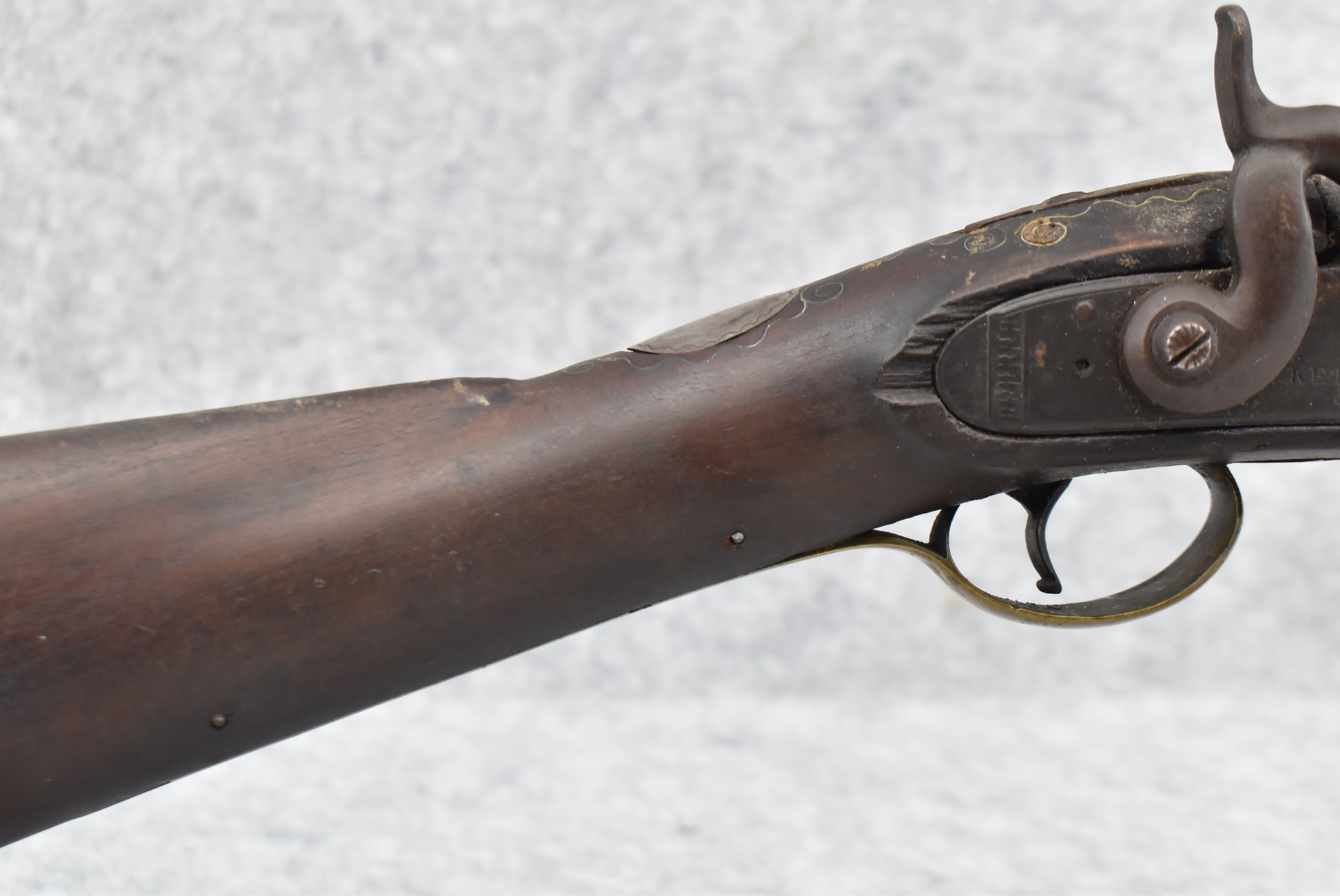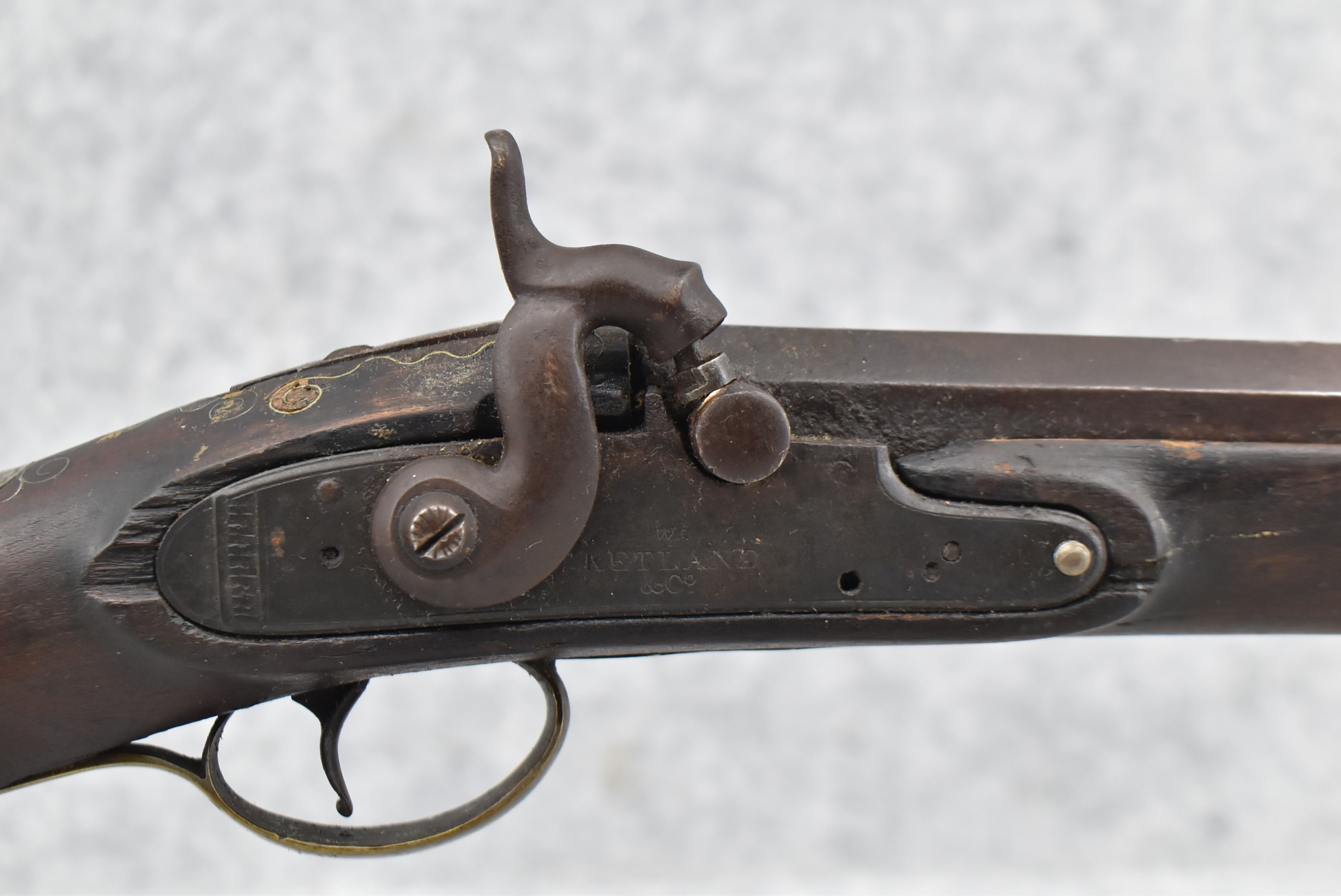 546. Unknown Mfg. – 60 Cal. Half Stock Black Powder Percussion Rifle – w/40” Octagon Barrel w/Sights – Brown Finish – w/Straight Grip Wood Stock w/Metal Butt Plate & 1pc. Brass Patch Box – w/Wire Inlays Around Top Tang – w/W. Ketland & Co. Percussion Lock – w/Ram Rod
