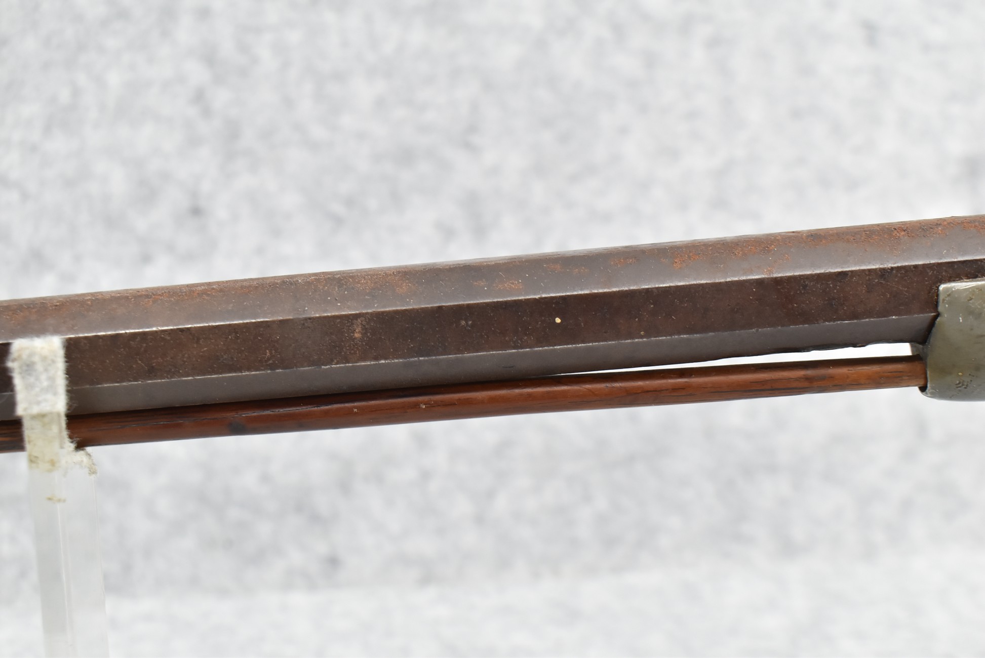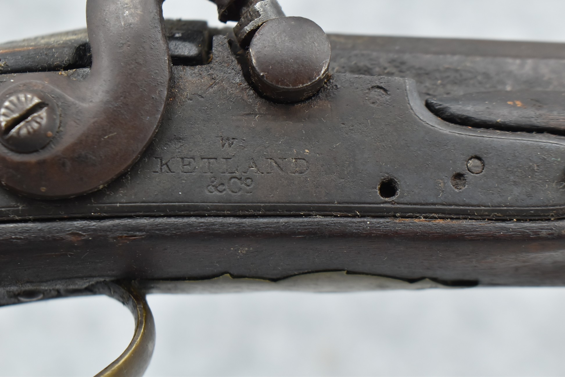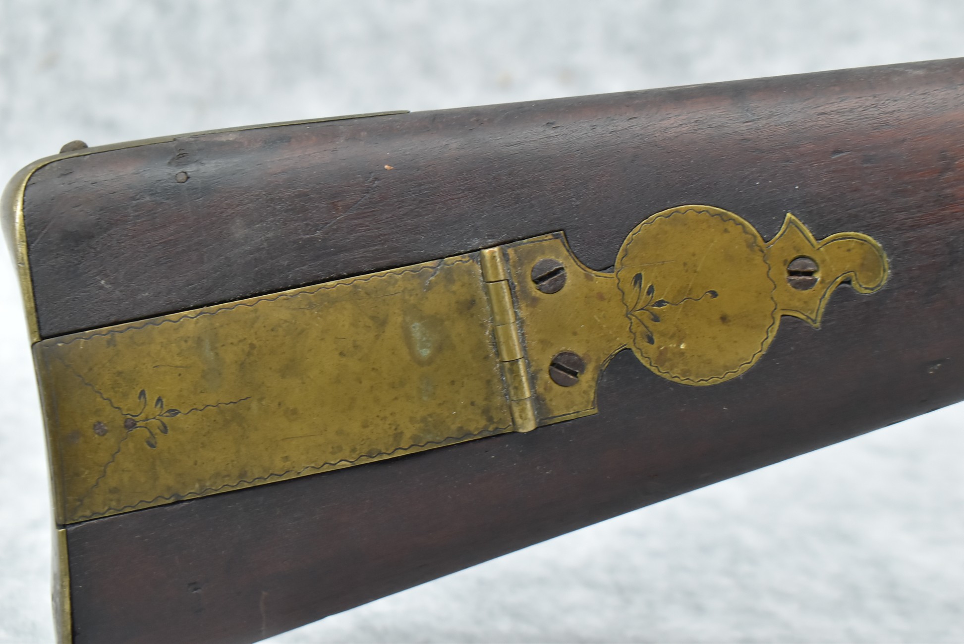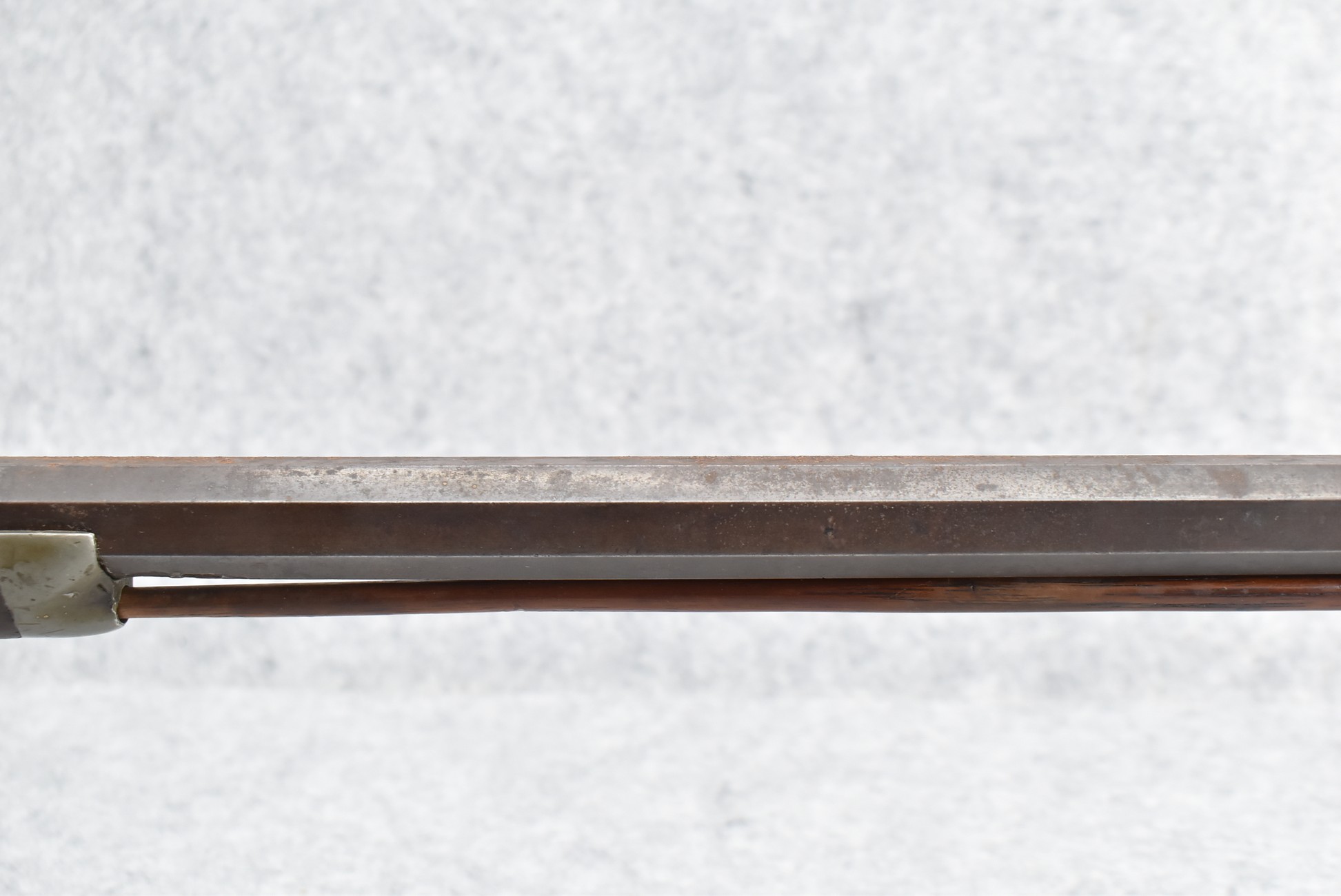 546. Unknown Mfg. – 60 Cal. Half Stock Black Powder Percussion Rifle – w/40” Octagon Barrel w/Sights – Brown Finish – w/Straight Grip Wood Stock w/Metal Butt Plate & 1pc. Brass Patch Box – w/Wire Inlays Around Top Tang – w/W. Ketland & Co. Percussion Lock – w/Ram Rod