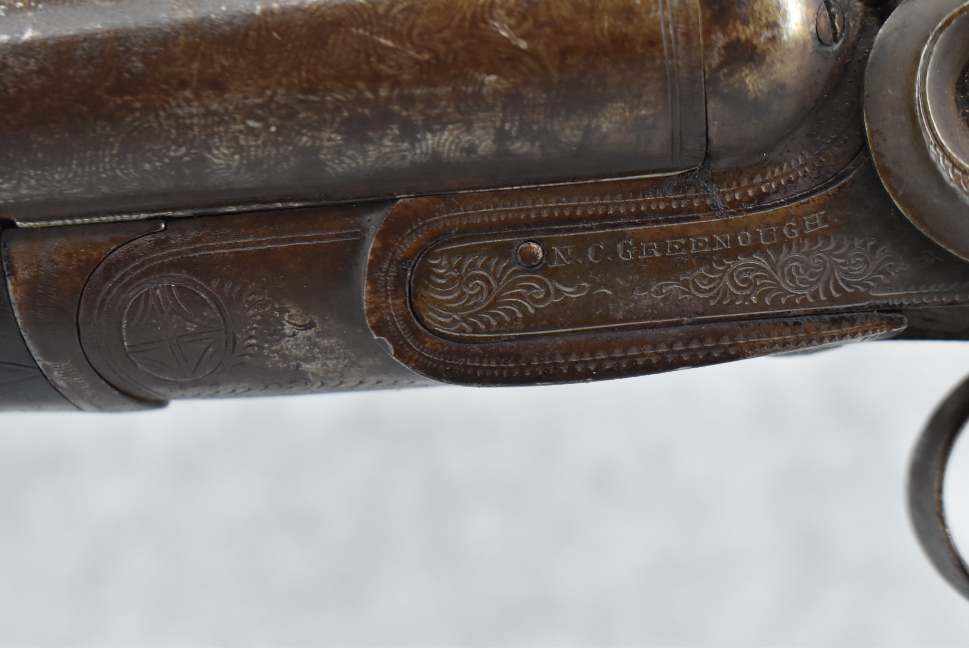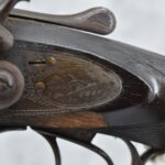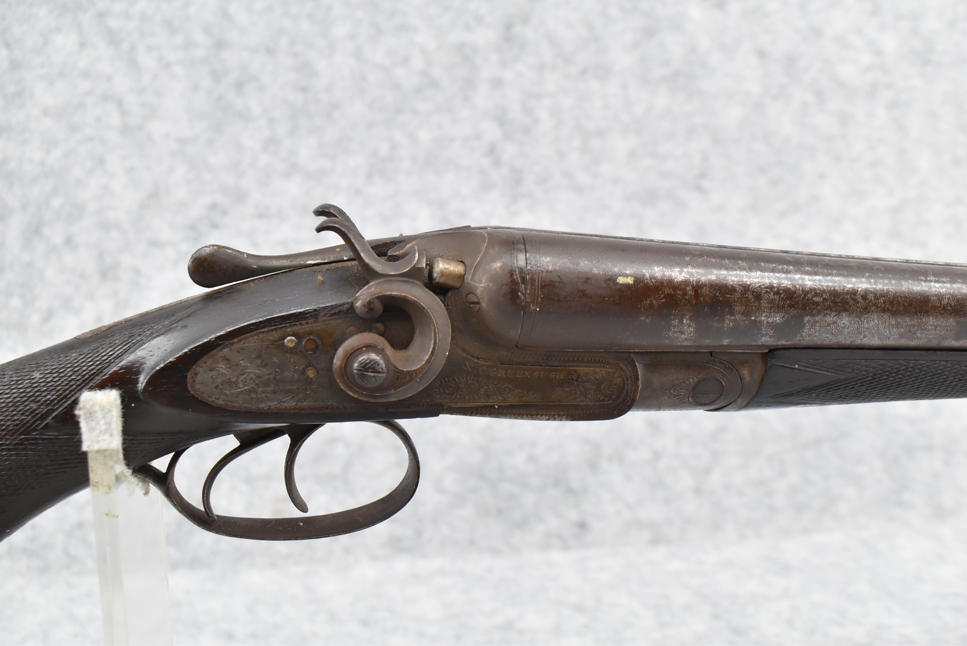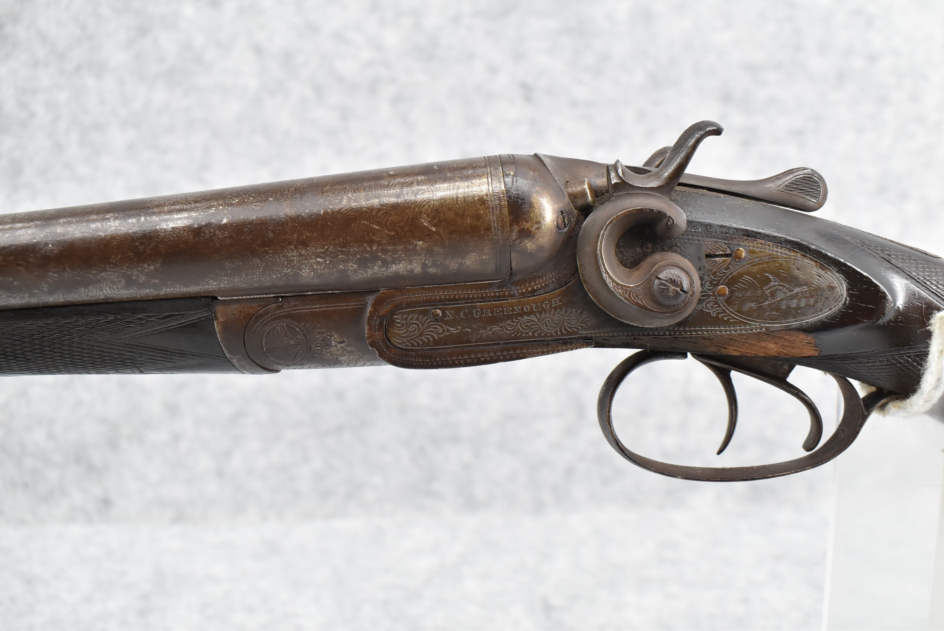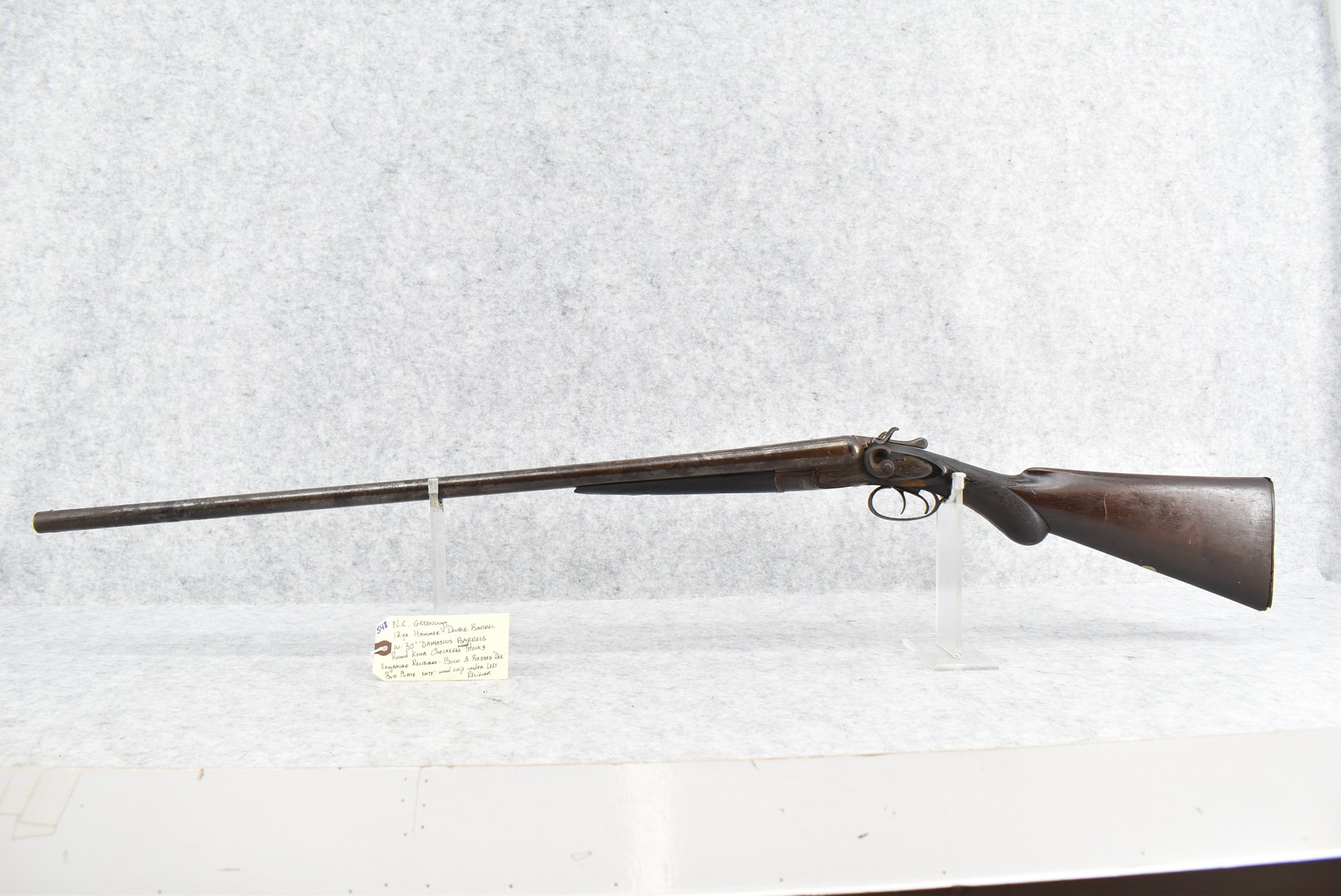 548. N.C. Greenough – 12ga. Hammer Double Barrel Shotgun – w/30” Damascus Barrels – w/Engraved Receiver – w/Round Knob Checkered Wood Stocks w/Buck & Bedded Doe Butt Plate – Note: Wood Chip Under Left Receiver