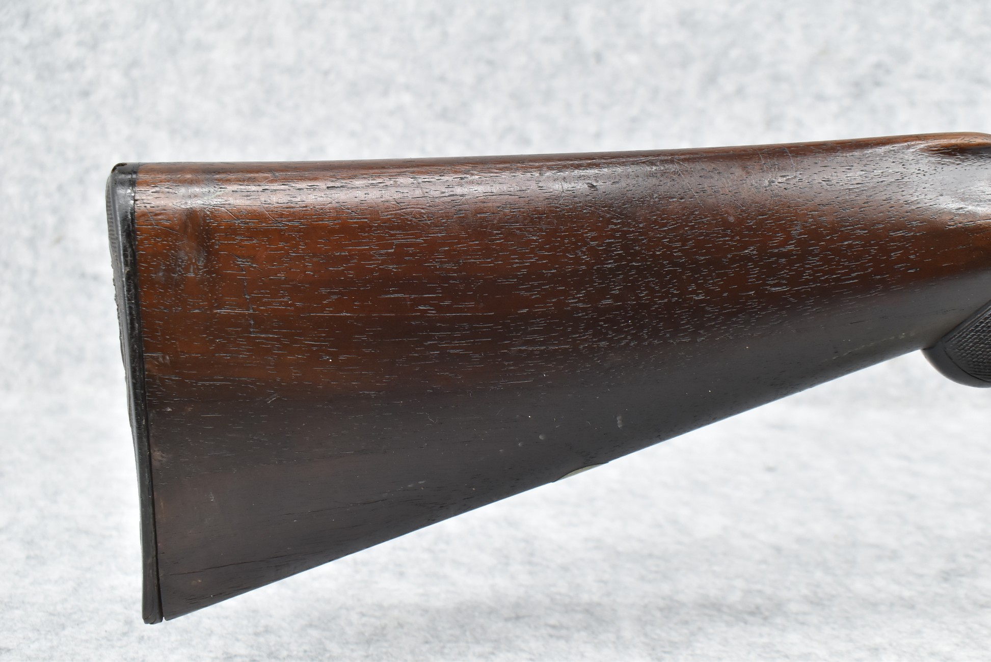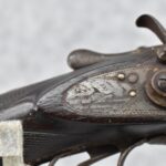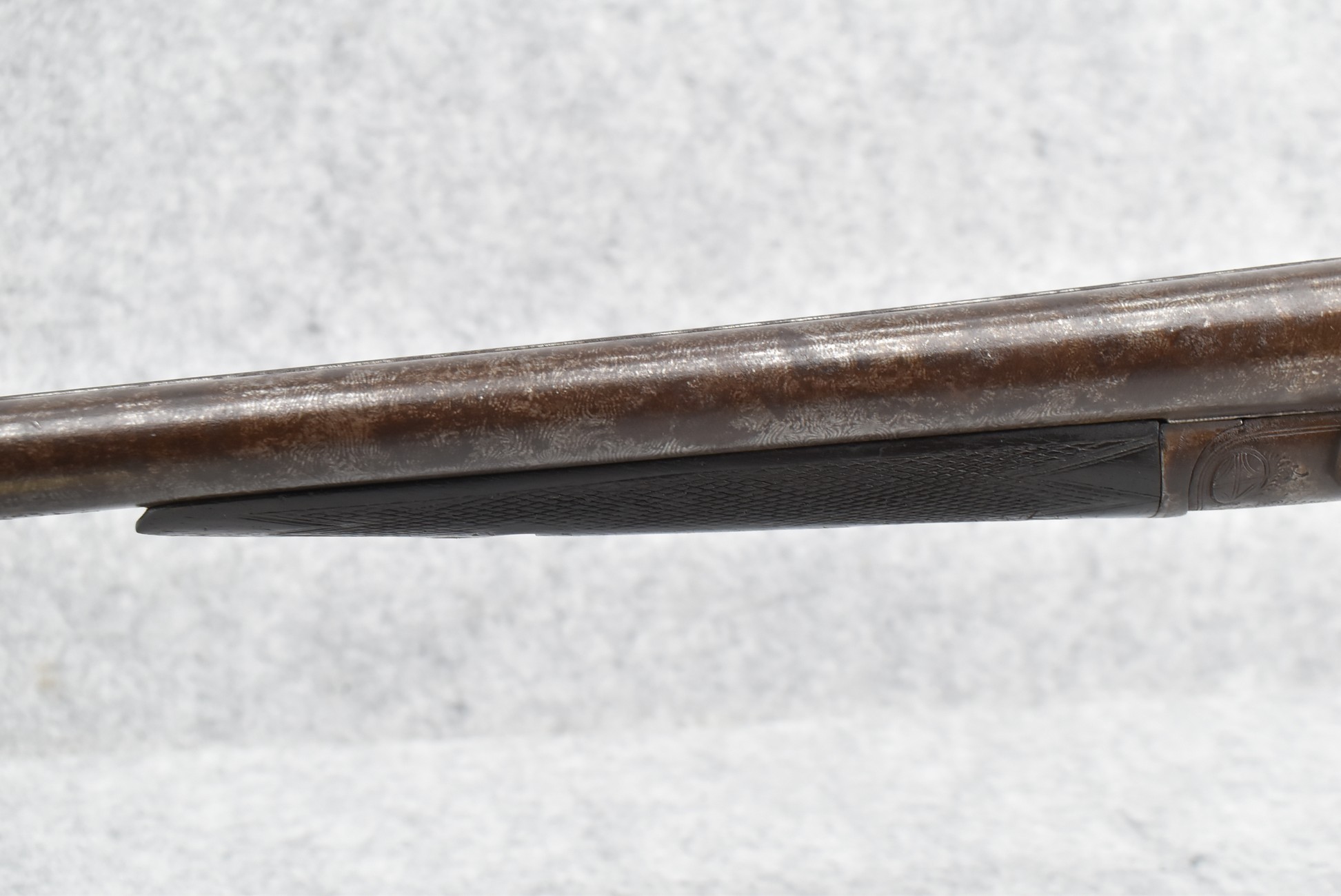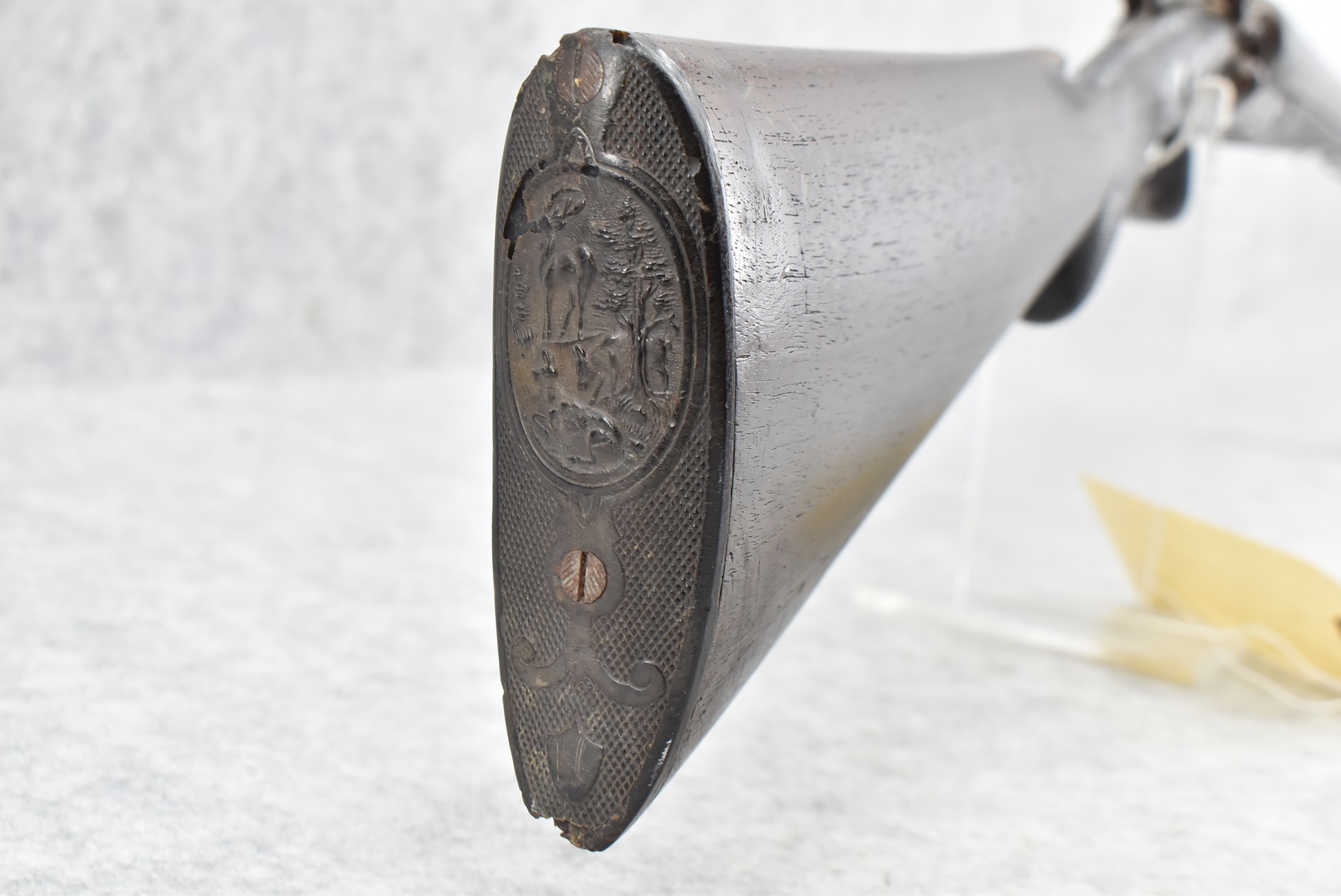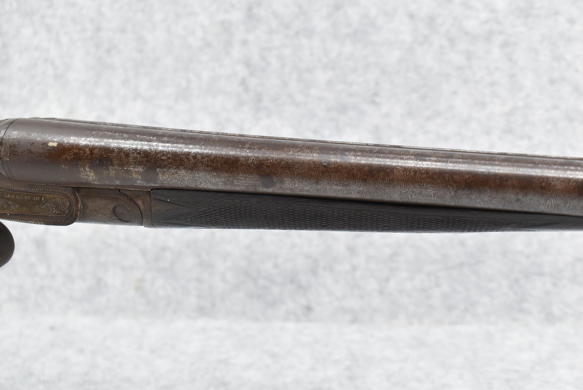 548. N.C. Greenough – 12ga. Hammer Double Barrel Shotgun – w/30” Damascus Barrels – w/Engraved Receiver – w/Round Knob Checkered Wood Stocks w/Buck & Bedded Doe Butt Plate – Note: Wood Chip Under Left Receiver
