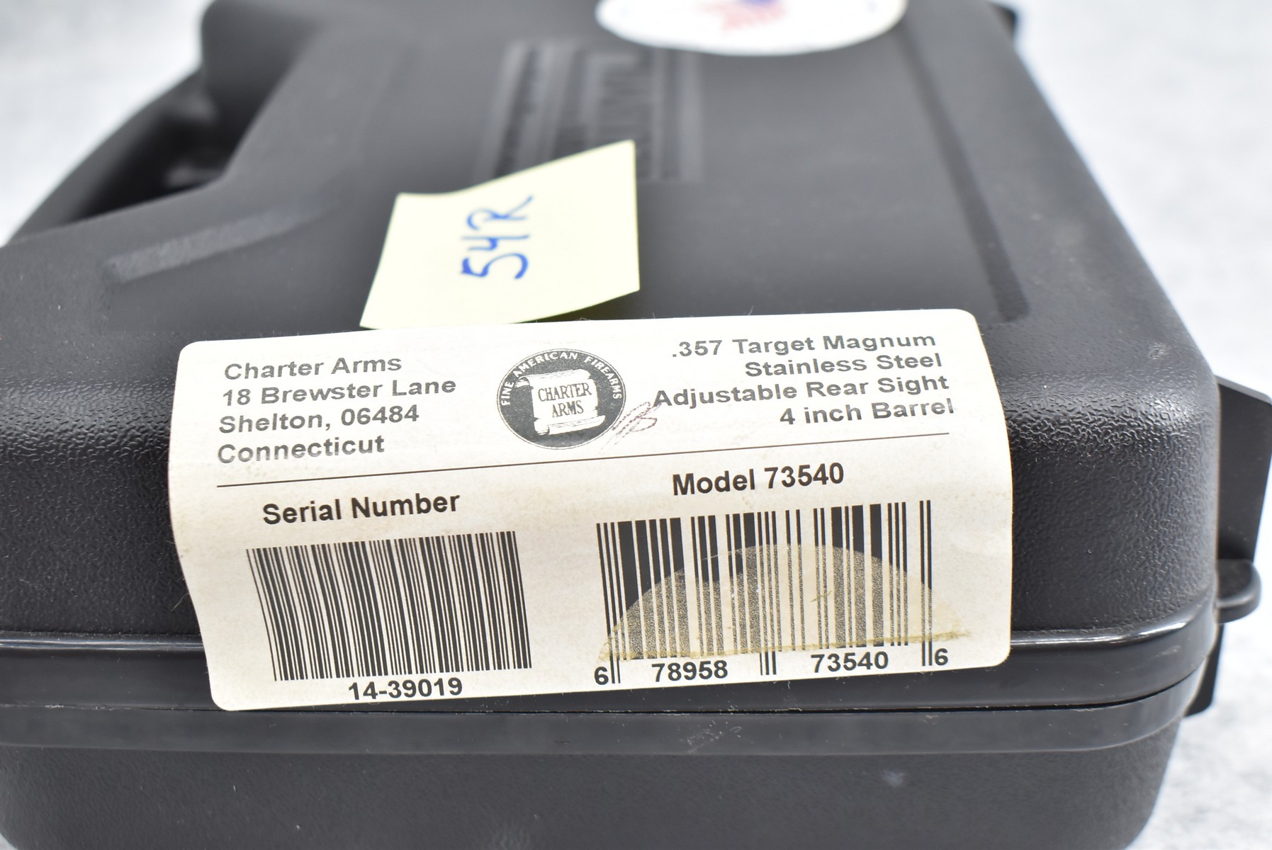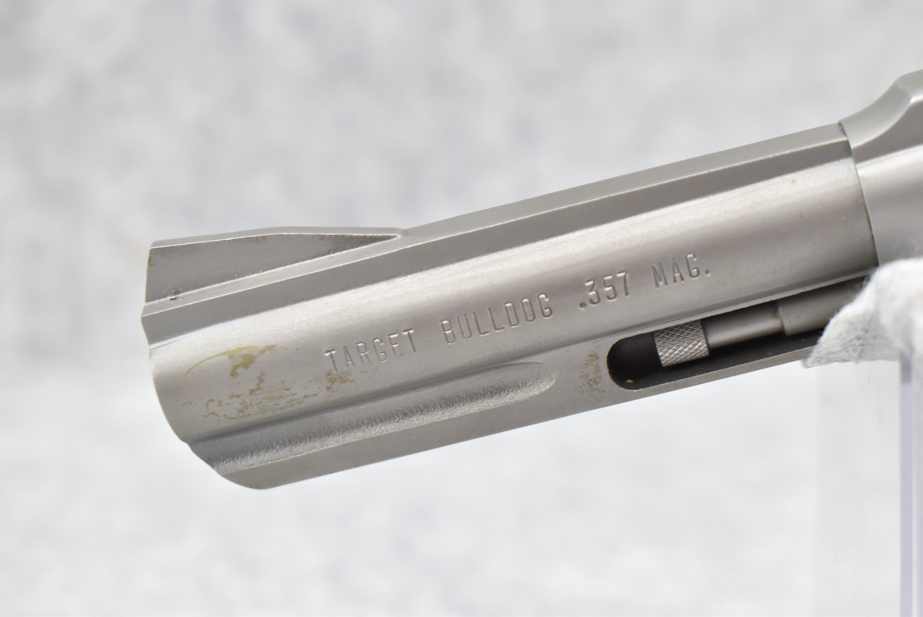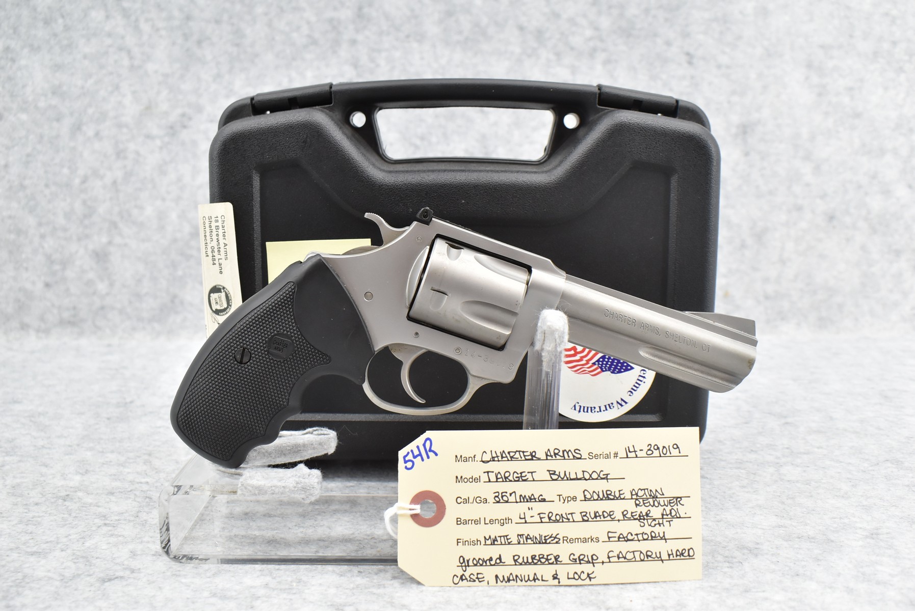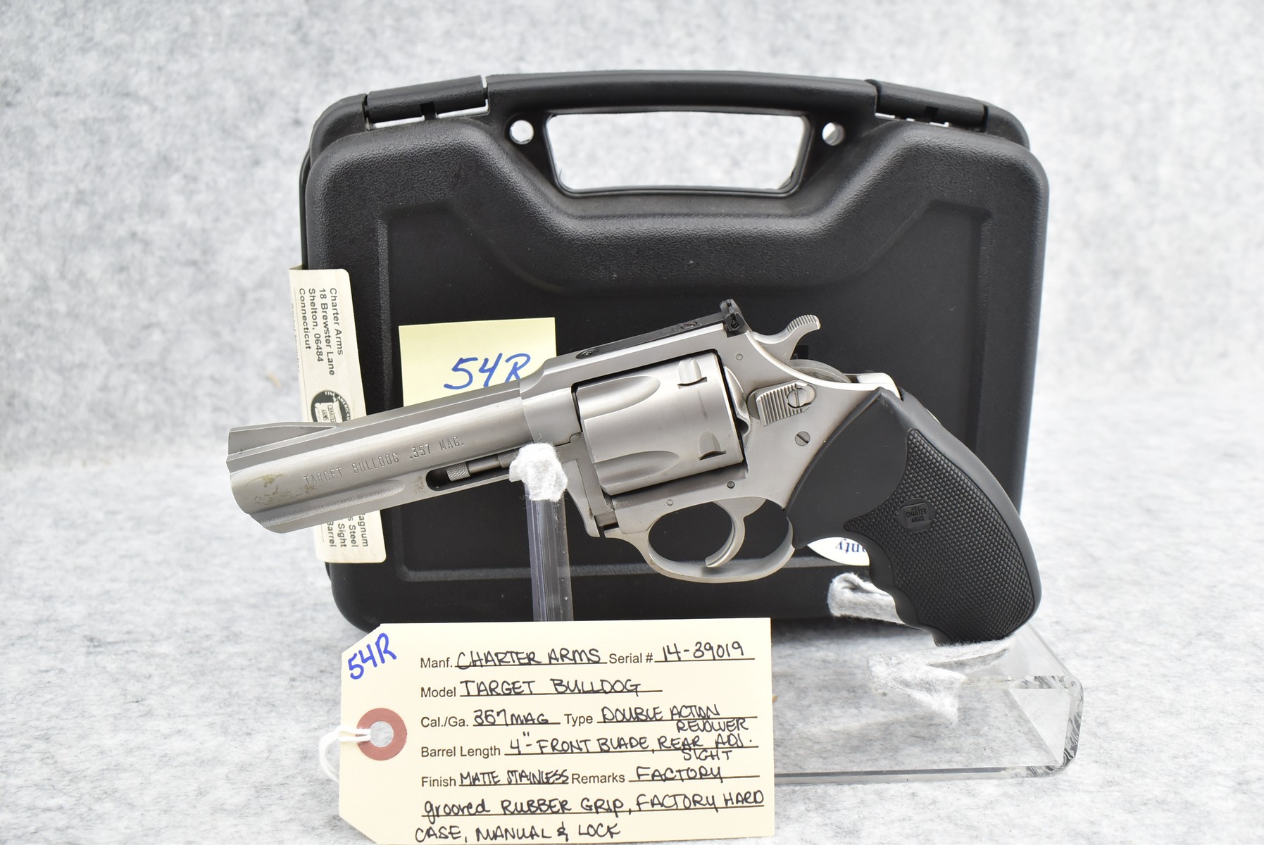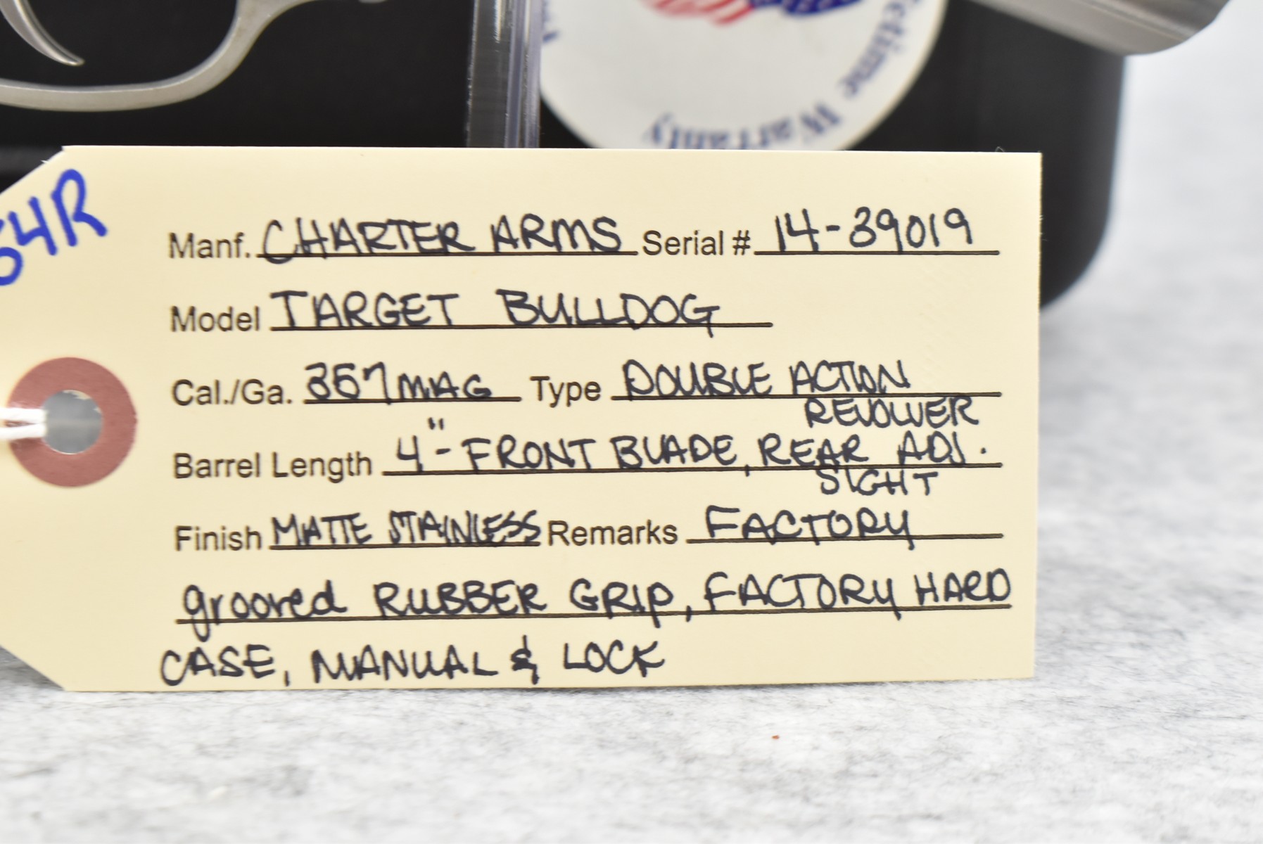 54R. Charter Arms – Mod. Target Bull Dog – 357 Mag. Cal. Double Action Revolver – w/4” Barrel w/Front Blade & Rear Adj. Sight – Matte Stainless Finish – w/Factory Grooved Rubber Grip – As New w/Factory Hard Case, Manual & Lock