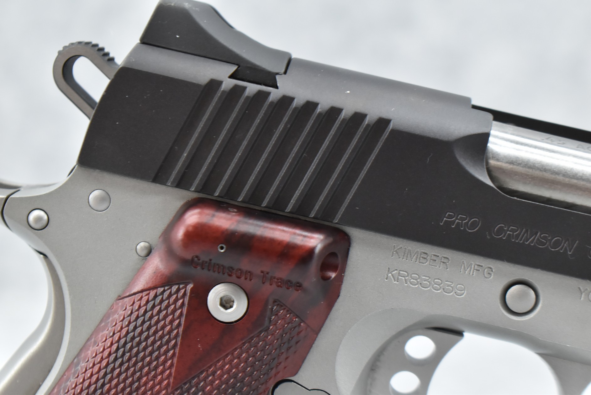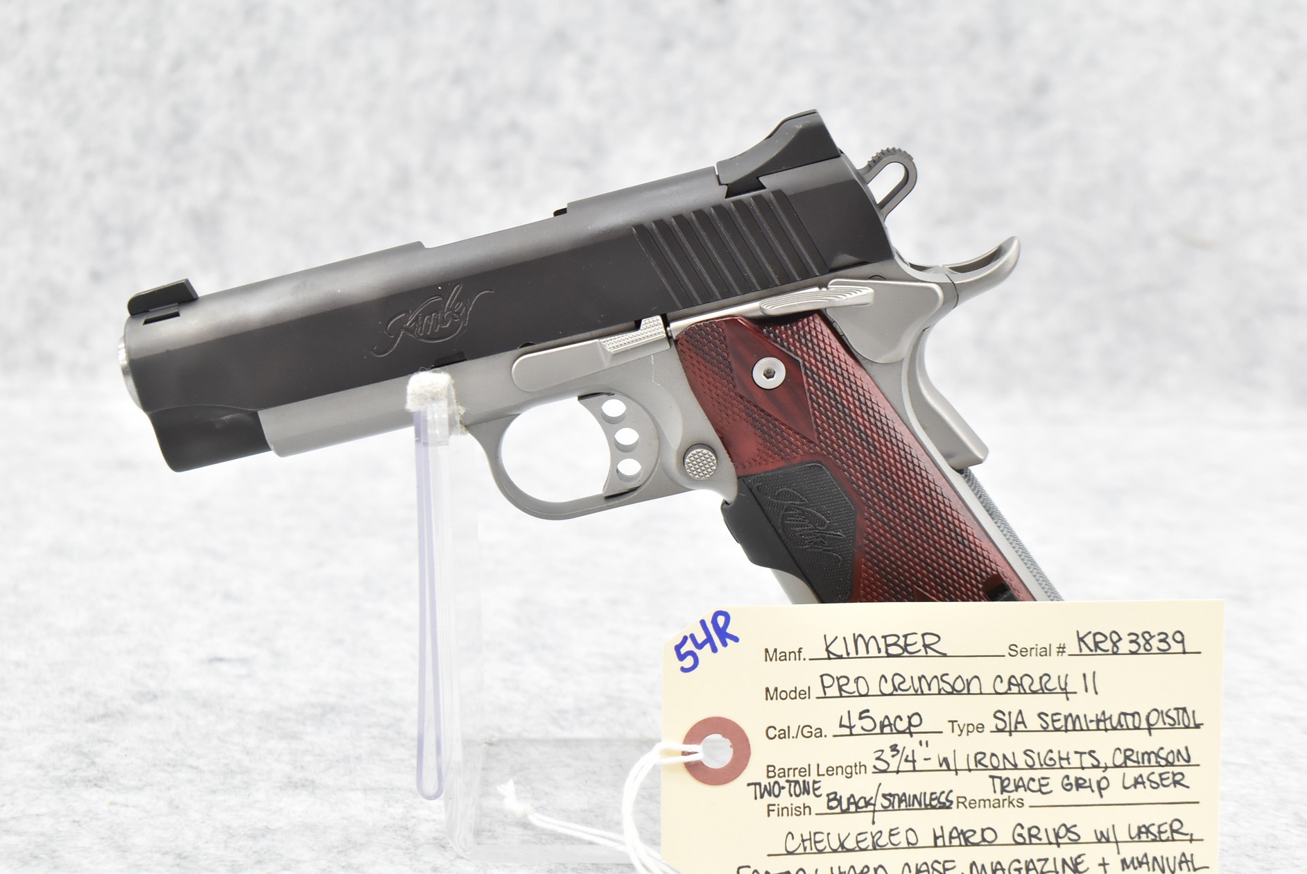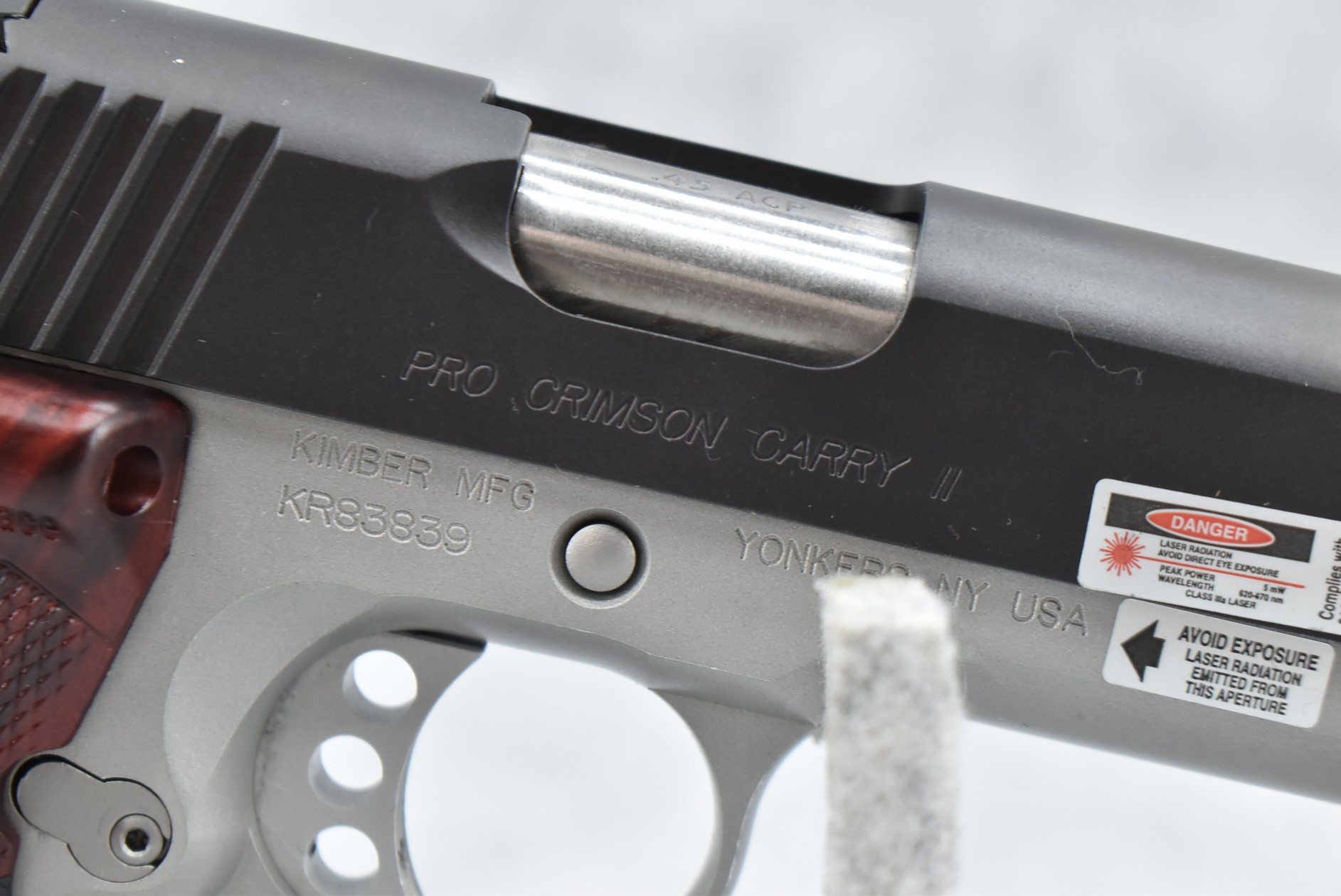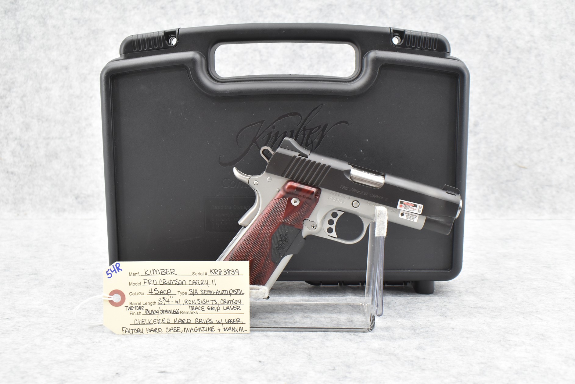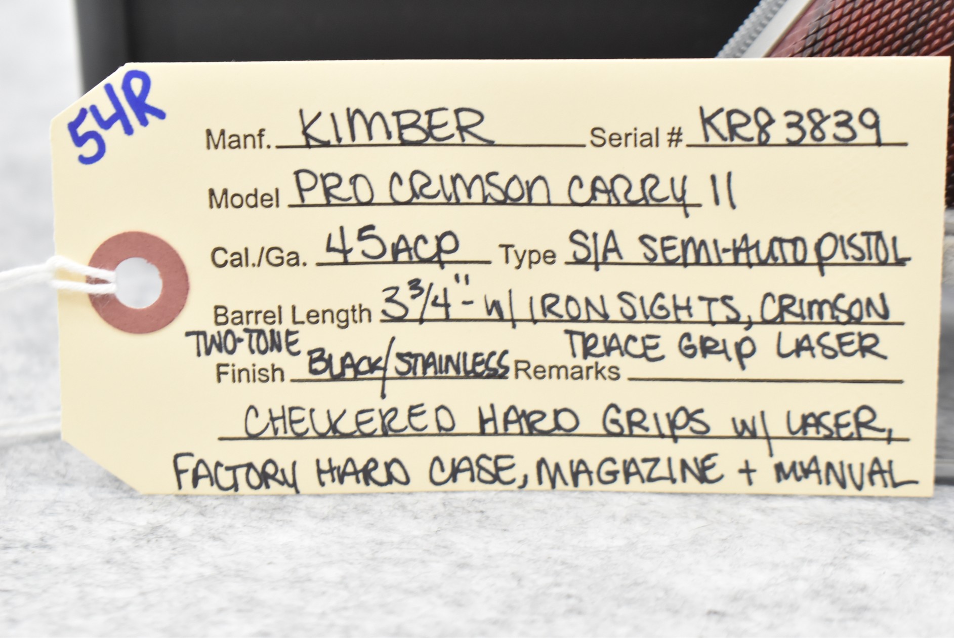 54R.       Kimber – Mod. Pro Crimson Carry II – 45 ACP Cal. Semi-Auto Pistol – w/3 ¾” Barrel w/Iron Sights – Black/Stainless Two-Tone Finish – w/Checkered Wood Grips w/Crimson Trace Grip Laser – w/Factory Hard Case, Magazine & Manual